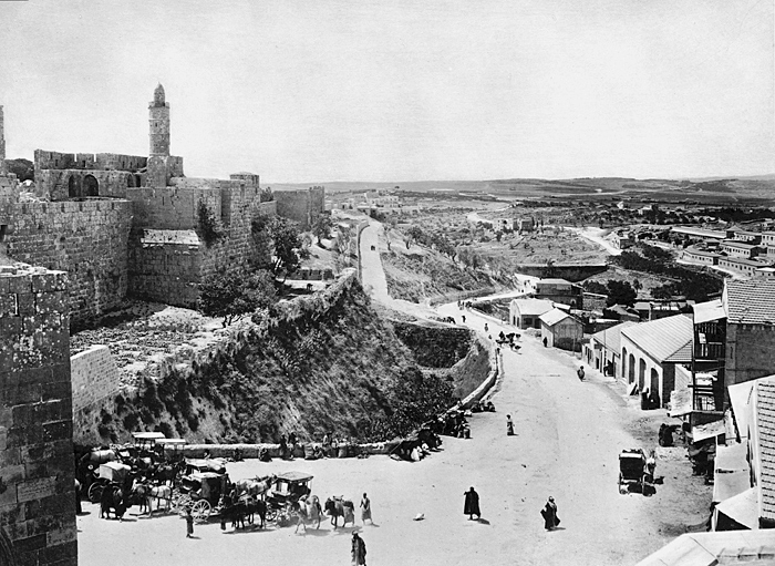 Vägen mot Betlehem, från Jaffaporten. Text på originalet: "Plain of Rephaim from the Jaffa Gate/La route de Bethlehem" Fotografierna LXVI:N.01.-180. kommer från resan till Palestina och Syrien som Wilhelmina och Walther von Hallwyl gjorde den 30 mars-27 april 1901. De lämnade Sverige den 5 november 1900 för Egypten, där de stannade till den 28 mars 1901, då de fortsatte till Palestina. Med på resan var Wilhelminas sällskapsdam, fröken Ida Uhse. Den 27 april fortsatte de till Turkiet och Mindre Asien. De mindre fotografierna (utom de från Samos) LXVI:N.90.-100. är tagna av Wilhelmina själv, under en resa till häst från Jerusalem till Damaskus 8-20 april 1901. Övriga fotografier är inköpta av Wilhelmina i Jerusalem, Damaskus och Beirut. Alla uppgifter kommer från Ida Uhses reseanteckningar.