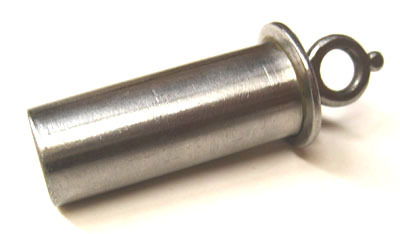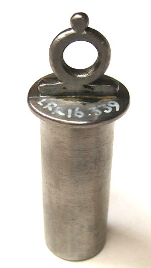 Av blankt stål. Cylindrisk öppen hylsa, platt botten med pålödd ögla med rektangulär bas och rund knopp. Synliga lödfogar av gulmetall.
