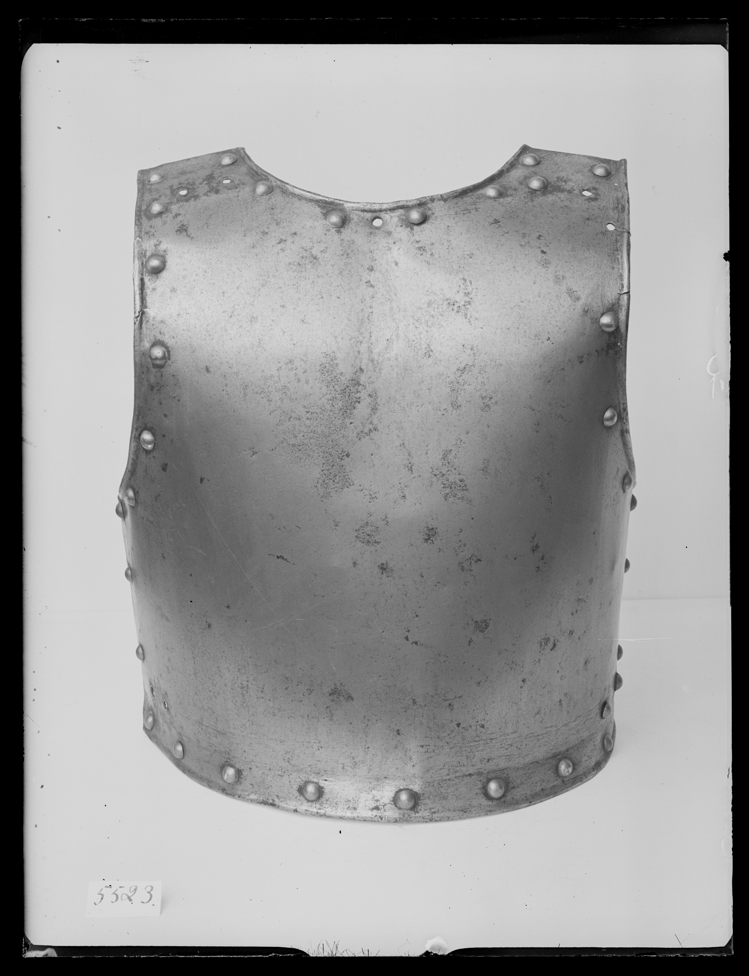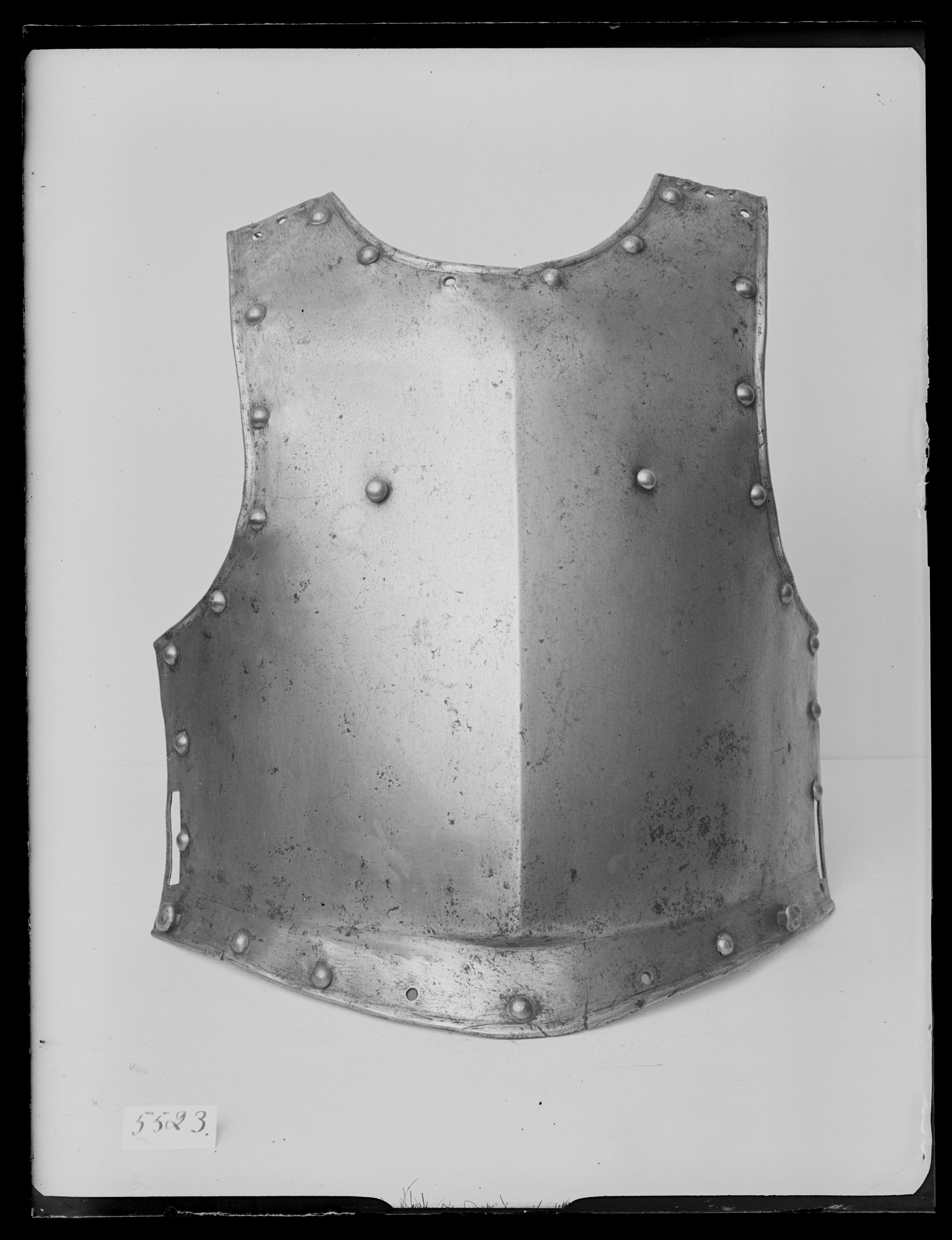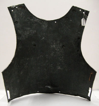 Av stål drivet i ett stycke, utsidan blanksipad och insidan brunsvart. Slät yta, närmast raka sidor och sluttande axlar, B 65 mm. Rundade urtagningar för hals och armar. Nertill endast markerad krage, bredast i mitten 43 mm. Tydlig mittås med början 40 mm under hakan och avslutad i en kort och bred spets (liknande gåsbuk). Kanterna omvikta inåt och sammansmidda. Vid axlarna hål efter spännen. Nertill i sidorna 55 mm långa rektangulära hål för remmar. På var sida bröstet en utstående nit av gulmetall. Nertill i kragens sidor en utstående något kraftigare nit av stål. Längs kanterna i rad kullriga nitar med gulmetallhättor. På höger insida rester av ett gulgrått linneband, L 50 mm.