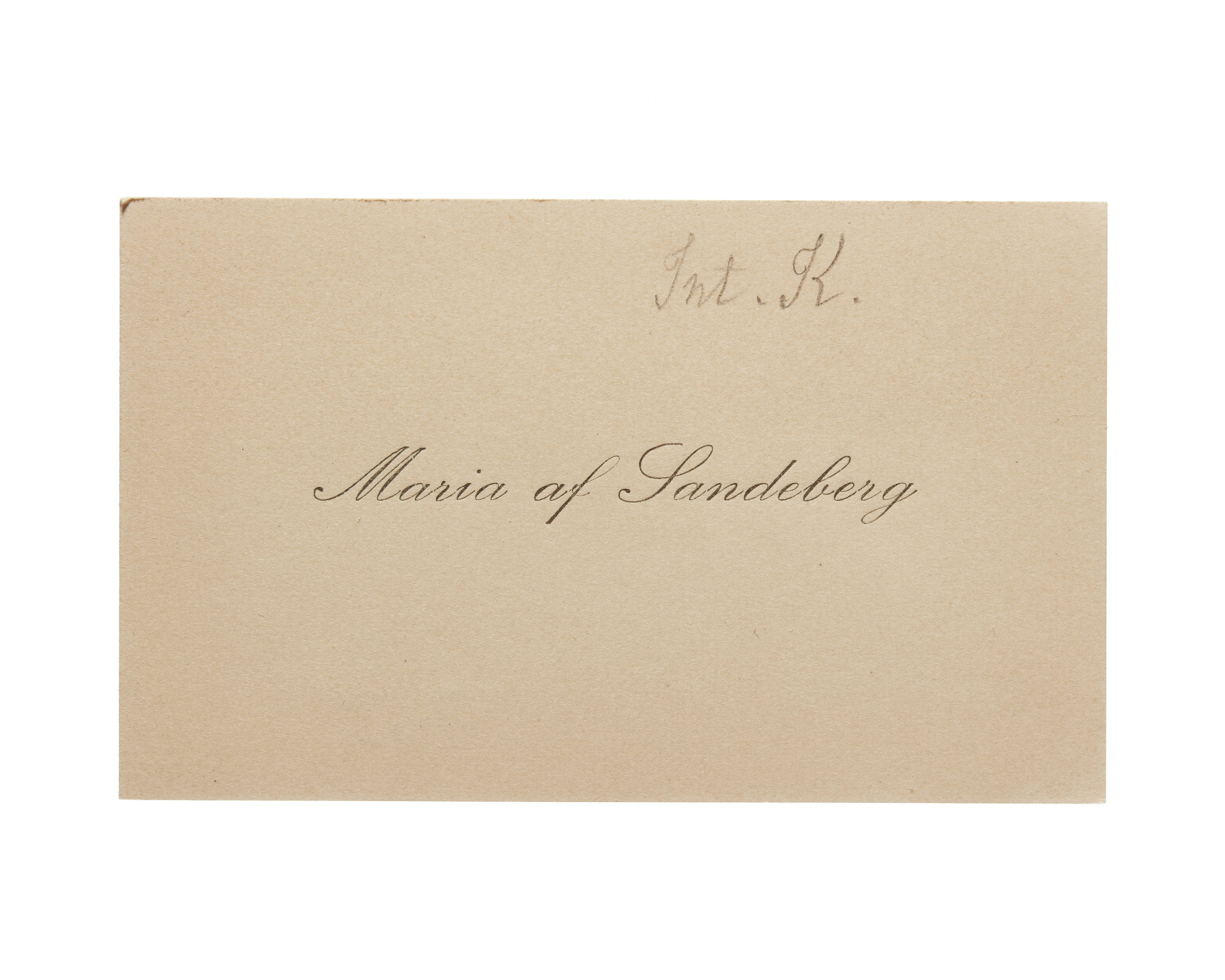 Ett visitkort från Maria af Sandeberg, daterat 1911. Överlämnat i samband med Internationella kvinnoförbundets kongress i Stockholm 1911.