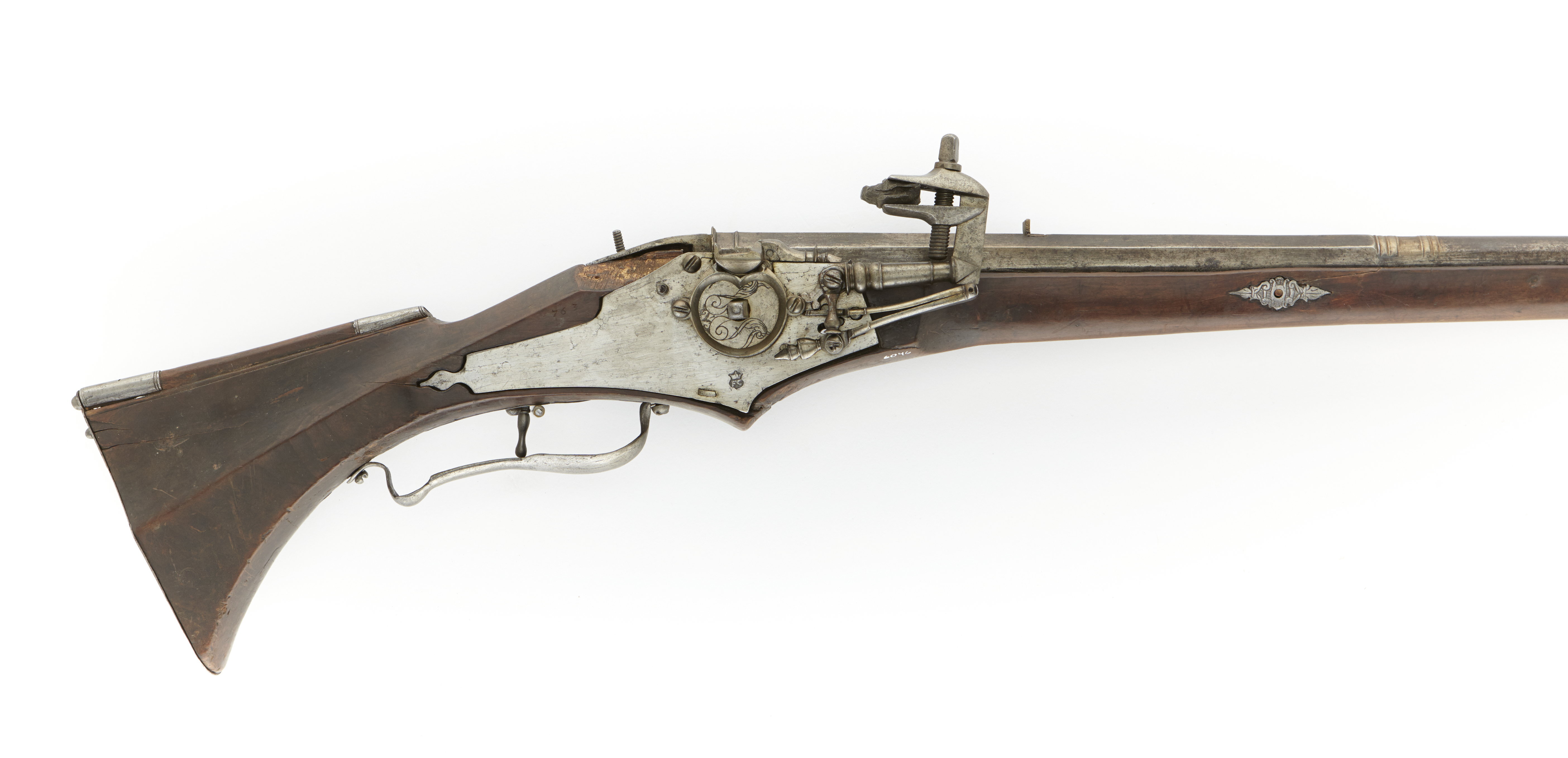 Rund, över kammaren åttakantig, slätborrad pipa av blånerat stål. Trumfen samt partiet mellan rund och kantig pipa är blankt. På kammaren stämpel med "FC" under krona (Stöckel nr 2471, Bayern? ca 1610). Ståndsikte av stål, knoppkorn av stål på trumfen. Framför svansskruv- bladet förhöjd list. Tre piphäften. Hjullås. Kantigt låsbleck, baktill avslutat i profilerad spets. Hjulet fast- skruvat med hjärtformig ring kl. 9 och kl.3. Låg vertikal krutskärm. Hane med lös underkäke. På låsblecket samma stämpel som på pipan. Hel stock av brunt trä, muskotnötliknande kolv, utsvängd efter låsbleckets nedre kant. Sluten laddstocksränna. Bakplåt av stål. Kolvrygg med rörliknande överkant, stålskodd i båda ändar. Brickor till låsskruvar och pipstift ursprungligen av rombiska, graverade stålplattor, två saknas. Näsband av stål - går i ett med rörkan. Varbygel, vidgad och skålad för avtryckaren, den senare profilerad. Bakre låsskruven avsedd för karbinring, håller även bälthake på plats. Tillbehör : Svavelkis i blymantel. Märkt : 763 ovanför låsblecket, stanstyp 5376.