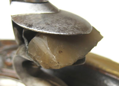 Gulbrun flinta, rektangulär med grovt tillslagna ojämna sidor och sluttande finare spets med rak kant. Mantel av grått bly.