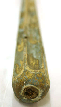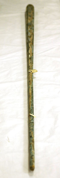 Framåt avsmalnande sexkantig lans, målad i blått och guld, med avbrutet grepp. Lansens framdel är kannelerad och dekorerad med 85 guldfärgade, uppåtgående eldslågor. 185 mm från överkanten sitter en islagen järnspik. På lansens främre del sitter en etikett fäst med ett mörkt häftstift med handskriven text i tusch: "Gripsholm 1945 // nr XVIII: 8" samt i blyerts: "Drottningholm // 1799-1800?".