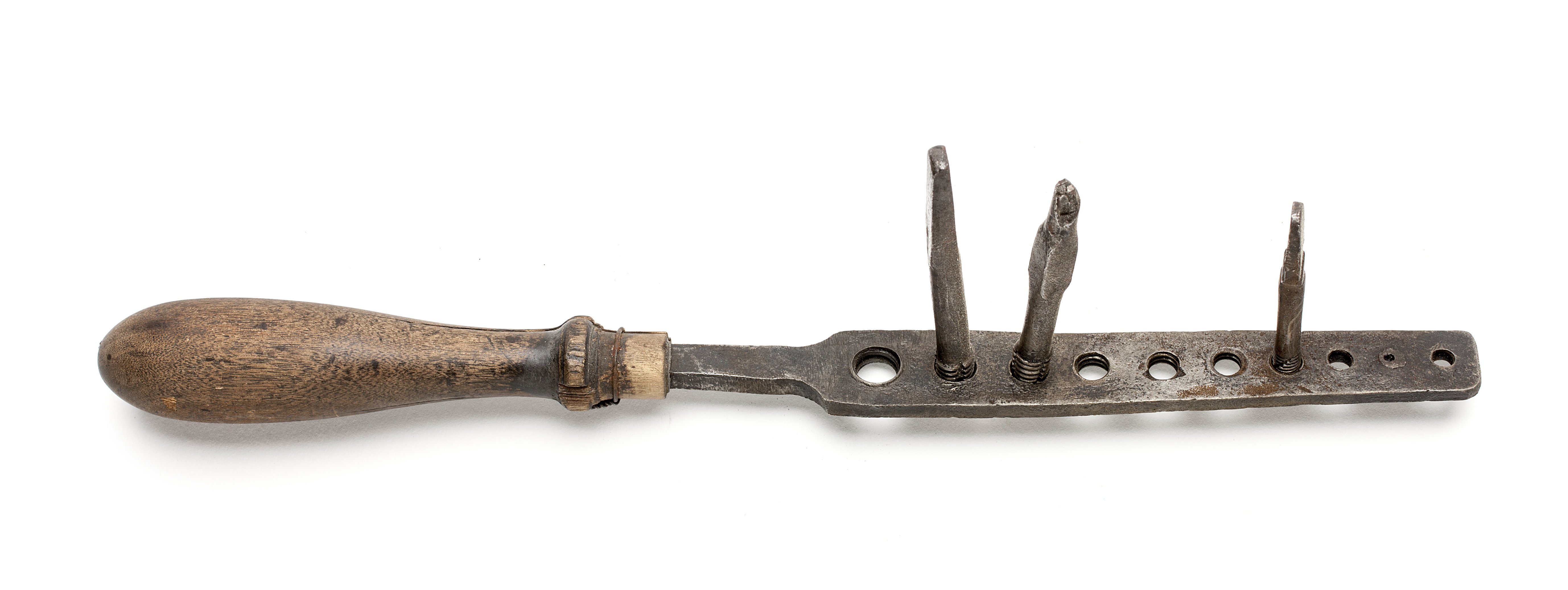 Rektangulär, mot spetsen avsmalnande platta. Tio gänghål, varav ett är igenpluggat och tre har kvarsittande gängtappar. Svarvat skaft av lövträ.