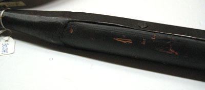 Blad av svärtat stål. Stötklingan uppåt avsmalnande med mötande skär och låg rygg ner till holken. Yxblad med spetsiga ändar och svagt konkav egg, H 145 mm. Haken snett nedåtriktad, triangulär med rundad nacke. Vid korset inåtsvängda utskott, de främre avbrutna. Blad övergående i holk, konisk med svagt tresidiga sidor. Påsmidda skenor, L 400 mm, fästade med fem nitar vardera. Stång av svrtmålat trä, cirkulärt tvärsnitt diam 30 mm.