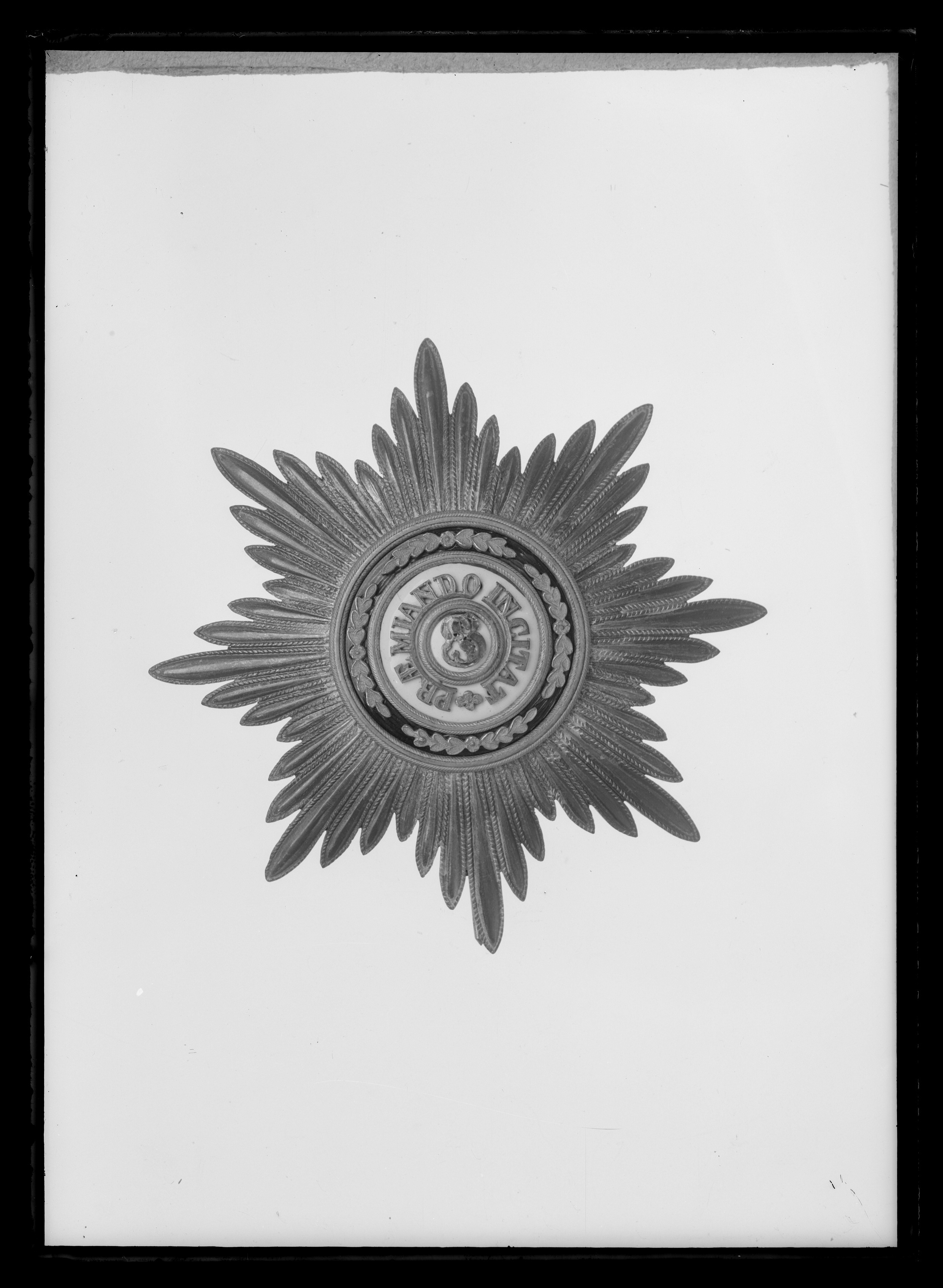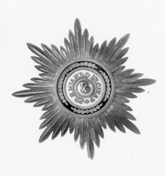 Åttauddig strålstjärna av silver, sammansatt av 48 välvda, spetsiga strålar med repstavskant. Svagt välvd medaljong täckt med vit emalj, därpå fäst namnchiffer av guld och röd emalj: SS. Välvd, vitemaljerad ring, därpå fäst guldtext: "PRAEMIANDO INCITAT". Däromkring en ring täckt med grön, genomsynlig emalj, därpå fäst fyra bladornament av guld. Mellan ringarna samt på utsidan guldringar med blank mittring och repstavskanter. Frånsidan förgylld, på mitten stämplat: Keibel, dubbelörn samt halv stämpel 04. Vertikalt placerad säkerhetsnål.