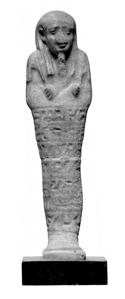 - Af lergods, med kvarsittande rester af ljusgrön glasyr. Längd: 15.3 cm.; bredd: 4.1 cm. Anm. Figuren afslagen å midten samt hopsatt. Om denna figur har amanuensen vid Victoria-museet i Uppsala filosofie licentiaten Pehr Lugn lämnat följande upplysningar: Usjebtifigur i mumieform. Texten oläslig men torde ha innehållit en version af kapitel VI i Dödsboken. Från Mellersta riket (omkring år 2000 f. KR.) till sen tid var det sed i Egypten att lägga ned i grafven hos den döde ett större eller mindre antal graffigurer, s. k. usjebti ' (egentligen schawabti), ett egyptiskt ord, som plägar öfversättas med »svarare» men . ursprungligen torde ha betecknat det träslag, hvaraf figurerna förfärdigades. De som härröra från äldre tid, äro vanligen groft tillyxade i trä, men senare vinnläde man sig om ett mera konstnärligt utförande. Då användes som material icke så mycket trä som fastmer alabaster, kalksten, bränd lera och i synnerhet fajans. Detta sistnämnda material utgöres af fint arbetad lera, öfverdragen med blå eller grön glasyr, ofta i mycket klara och lysande färger. Fajansfigurerna pressades i allmänhet i formar; för förnäma och rika personer tillverkades de ej sällan i hundratal. Träfigurerna äro öfverdragna med asfalt eller på annat sätt målade och försedda med inskriptioner i svart, brun eller gul färg. Äfven usjebti af annat material ha öfverdragits med färg. Ofta stå figurerna på en fyrkantig sockel, stödda mot en ryggpelare liksom de egyptiska statyerna. Under 19. dynastien (1350—1205 f. KR.) uppträda usjebtifigurerna i de lefvandes dräkt med framtill utstående ländkläde, fint veckad linneklädnad och sandaler. De för faraonerna afsedda pläga bära kungadräkt eller åtminstone kungahufva med urseusorm. Oftast ha dock usjebtifigurerna mumieform med lindorna ibland angifna i särskilda färger; endast ansikte, hals, armar och händer äro synliga. Armarna äro korslagda öfver bröstet, och händerna hålla hackor eller ibland de symboliska tecknen för OSIRIS och Isis: ded-pelaren (ryggraden) och den magiska knuten. På ryggen, undantagsvis 1 händerna, bära de vanligen en säck, kanske afsedd för att forsla bort sanden, som äfven i den andra världen tänktes drifva in öfver landet från öknen, eller måhända för att förvara utsädet vid sådden. Om halsen bär figurinen ibland en amulett, och öfver bröstet ser man understundom själen i fågelgestalt med människohufvud. Hufvudet är höljdt af det tredelade gudahåret. Männen bära icke sällan gudaskägg. Usjebtifigurerna äro vanligen försedda med respektive ägares namn och titlar i hieroglyfskrift, ofta föregångna af ordet shd (»lysande»). Därjämte återfinner man längre eller kortare utdrag ur kapitel VI i Dödsboken, ibland hela detta kapitel, ehuru i olika variationer. Usjebtifigurerna äro små porträttfigurer af den döde, afsedda att tjäna som ställföreträdare för honom, i händelse han i dödsriket skulle bli kallad till dagsverksarbete, som fellaherna plägade bli i denna världen. Gåfva till Wilhelmina von Hallwyl, f. Kempe, 2 April 1922 från hennes kusin godsägaren Adolph Hök. Kända tidigare ägare, enligt uppgift af godsägaren Adolph Hök: 1. Med. dr Fredric Christoffer Theodor Hök, Stockholm, f. 7 April 1807, d. 16 Mars 1877, 8^^ 18 December 1847 med Mathilda Wallis, f. 8 September 1820, d. 9 Januari 1897. Af honom erhållen på 1850—1860-talet af en patient, som hade figuren med sig hem från en resa till Egypten. 2. Godsägaren Adolph Fredrik Hök, Forsnäs, Forssa socken, Södermanland, f. 12 Januari 1849, d. 12 November 1924, son till föregående, gift 10 April 1875 med Sofia Augusta Wallis, f. 2 April 1854.