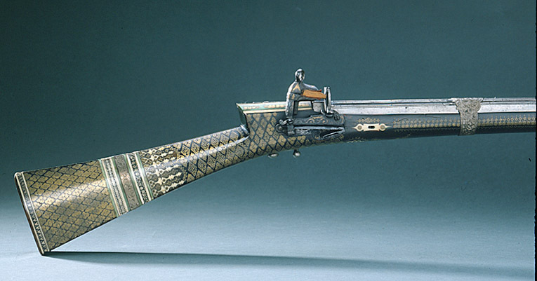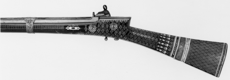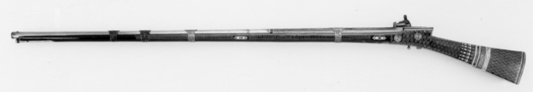Rund, slätborrad pipa av stål med fyrsidig kammare, fasade och räfflade kanter med påslaget silver. Svansskruvblad och pipans bakre del dekorerade med blom-och bladornament av påslaget silver. Längs kammarens ovansida bladranka av påslaget guld. Framför kammaren och vid mynningen ornament av påslaget silver. Riktemdel: Bladformigt sikte av silver på svansskruvbladet. Knoppkorn av koppar. Fästning: Fyra pipband av silverbleck, drivna och graverade med volut och bladdekor. Snapplås av stål av turkisk typ. Plant låsbleck av stål. Kantig hane med lös överkäke. Ringformig käkskruv. Batteri med räfflat eldstål med plan baksida. Hanen, låsbleckets nederkant, eldstålets baksida och stålbleck mellan batteriets nederkant och hanens studel ornerade med blad och rankor av påslaget guld och silver. Utvändig slagfjäder. Fästning: Två låsskruvar. Kulformig avtryckare. Mörk helstock av trä, lackerad(?) så att den liknar horn. Franskliknande, rak, sexsidig kolv. Smalare på ovansidan. Smal kolvhals, skarp kolvnacke. Kolven med yttäckande ornering av mässingsstift och dito rosetter inlagda med svart. Likadan dekor på framstockens sidor. Plan bakplåt med rosettformig inläggning av ben. Runt kolven silverband med graverad volutdekor, omgivet av inläggningar av vitt och grönfärgat ben, delvis graverat och ifyllt med svart. Längst bak runt kolven geometrisk bård av inlagt ben samt mässingsrosetter. Runt avtryckare och krysskruv profilerad platta av ben med inslag av grönt ben, mässingsrosetter och stift. Rosettformiga låsskruvbrickor av ben med mässingsrosetter. I framstocken två skåror för gehäng, profilerade skoningar av ben. Tillbehör: Laddstock av stål med knoppformig ände (fastrostad). I st.f. flinta en träbit insvept i rött ylle.