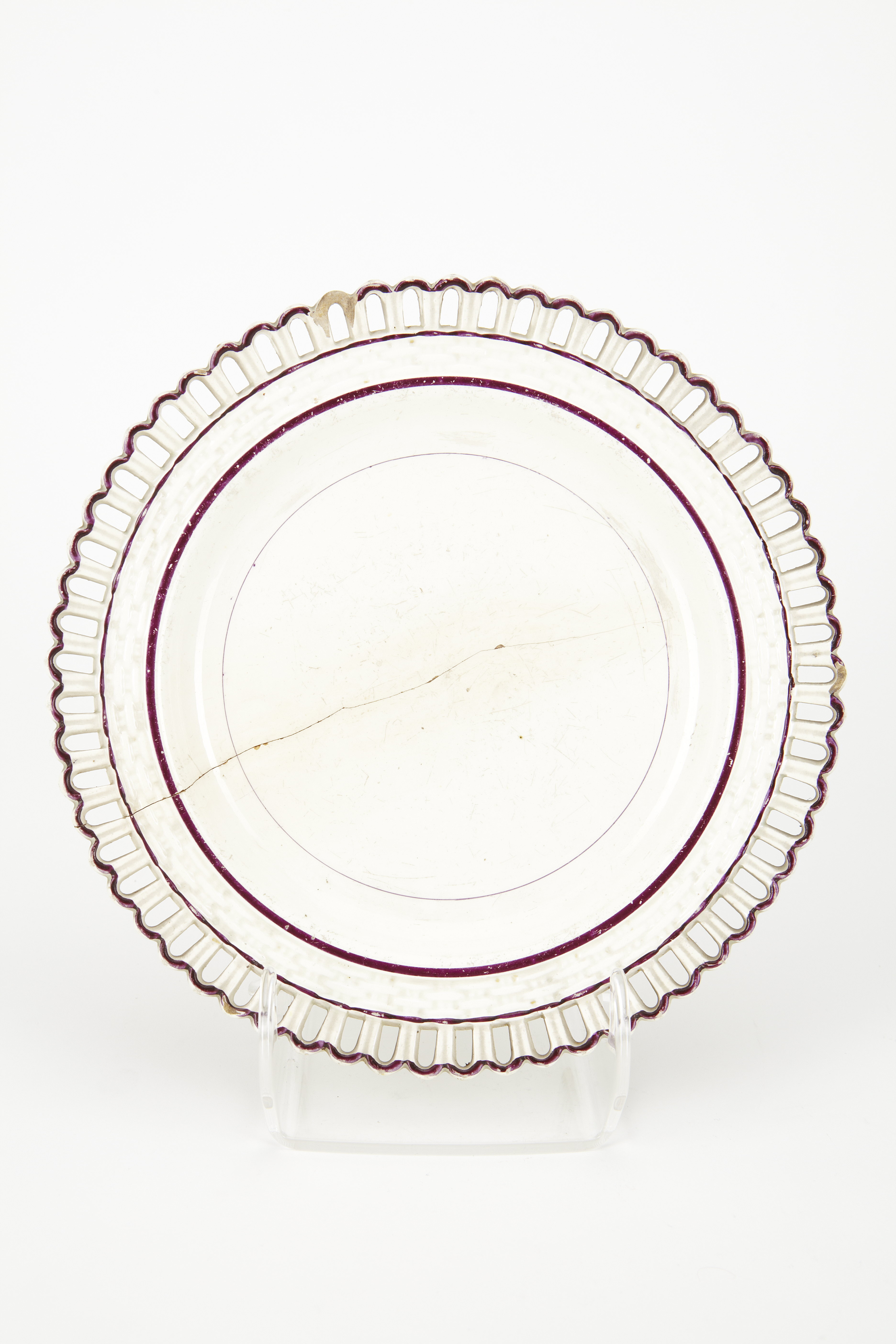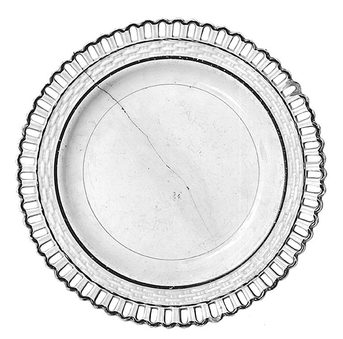 TALLRIK. Av s. k. flintporslin. Glasyren något grågul. Rund, flat, med kälformig långsluttande kep och snett utstående, rakt brätte med dekor i relief; på låg smal fotkant. Inre delen av brättet med flätmönster i relief, yttre delen genombruten i ett mönster av bågar (s. k. romerska bågar). På insidan runt botten en smal rand i gredelint, kring kepens överkant en bredare dylik i samma färg, runt flätningens och bågarnas yttre del likaledes en dylik. På bottnens utsida en stämpel. Höjd 2,1 cm, diameter 21,9 cm