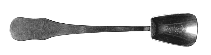 SALTSPADAR, sex stycken. Förgyllda. Blad avlångt, skåligt, något avsmalnande inåt samt med rundade ytterhörn och tvär innerända. Skaft smalt, platt, avsmalnande mot bladet och tvärt uppsvängdt vid skaftroten, på ytterändan en utvidgning med svagt konturerade kanter och rundad ytterända. Vikt: 7-7,5 gr. Längd: omkring 10,2 cm. Blad, bredd:1,8 cm. Skaft, längd: 7,6 cm. Svenskt arbete, Stockholm, från 1851. Olof Bogren, mästare 1843. Inköpta av Wilhelm Heinrich och Johanna Kempe under 1850 talets förra hälft hos guldsmeden O.J. Bogren, Stockholm. +++++ *SALTSPADAR, sex stycken förgyllda, Olof Johan Bogren (1843-1853), Stockholm, 1851. L. 10,2 cm. Nr. VII:K.III:G.c.1.