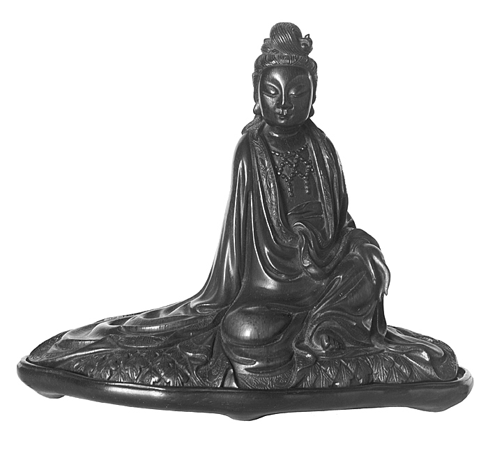 VINBÄGARE, i form av Guan-yin (buddisternas barmhärtighetsgudinna) på fotställ. Skuren av ett noshörningshorn, halvt genomskinlig. Gudinnan sitter med böjda ben och en hand på knäet. Slutna ögon och öron med förlängda snibbar (tecken på visdom) och en lång och vid klädnad. Underlaget beklädd med utåtvända spetsiga blad med graverade nerver liggande i fjällmönster. Underlagets undersida är skålig och den utgör bägaren. Fotstäl av jakaranda, ovalt med oregelbundet konturerad kant, anpassad efter bägarens underlag samt på fem fötter. På översidans mitt ett inskuret samlarmärke i sigillskrift. Inköpt av Wilhelmina von Hallwyl 1930 på utställning i Östasiatiska Samlingarnas lokal, Sveavägen 65, Stockholm. Betald 20 mars 1930. Pris: 33 £.