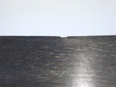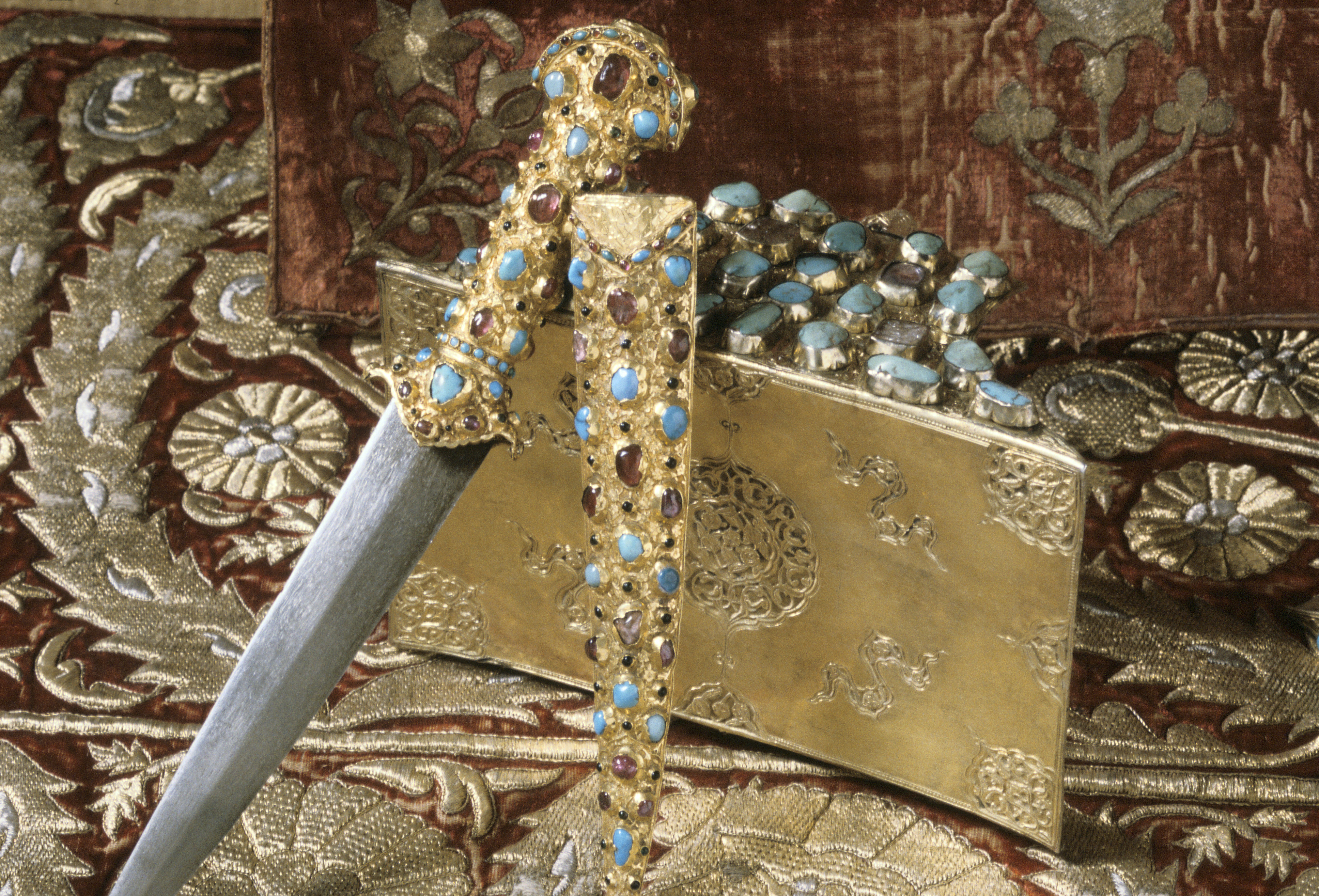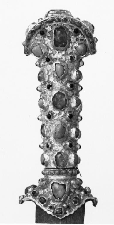 Fäste överdraget med guldplåt, ornerad i ett oregelbundet, drivet och ciselerat ytmönster samt rikt smyckad med kistfattade ädelstenar, varav 40 rubiner och 54 turkoser samt svartgröna, mindre stenar, samtliga "au cabochon". Fästets överdel bågformigtutvidgat uppåt, nederdelen med en nedåt vinkelformigt utdragen krage. Klinga damaskerad, mörkgrå, något bakåtböjd, jämnt avsmalnande mot spetsen och slipad med två jämnbreda skär.