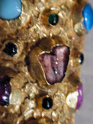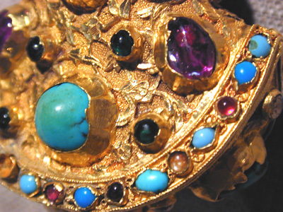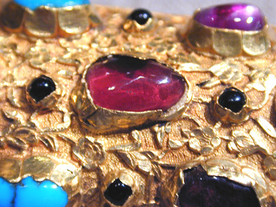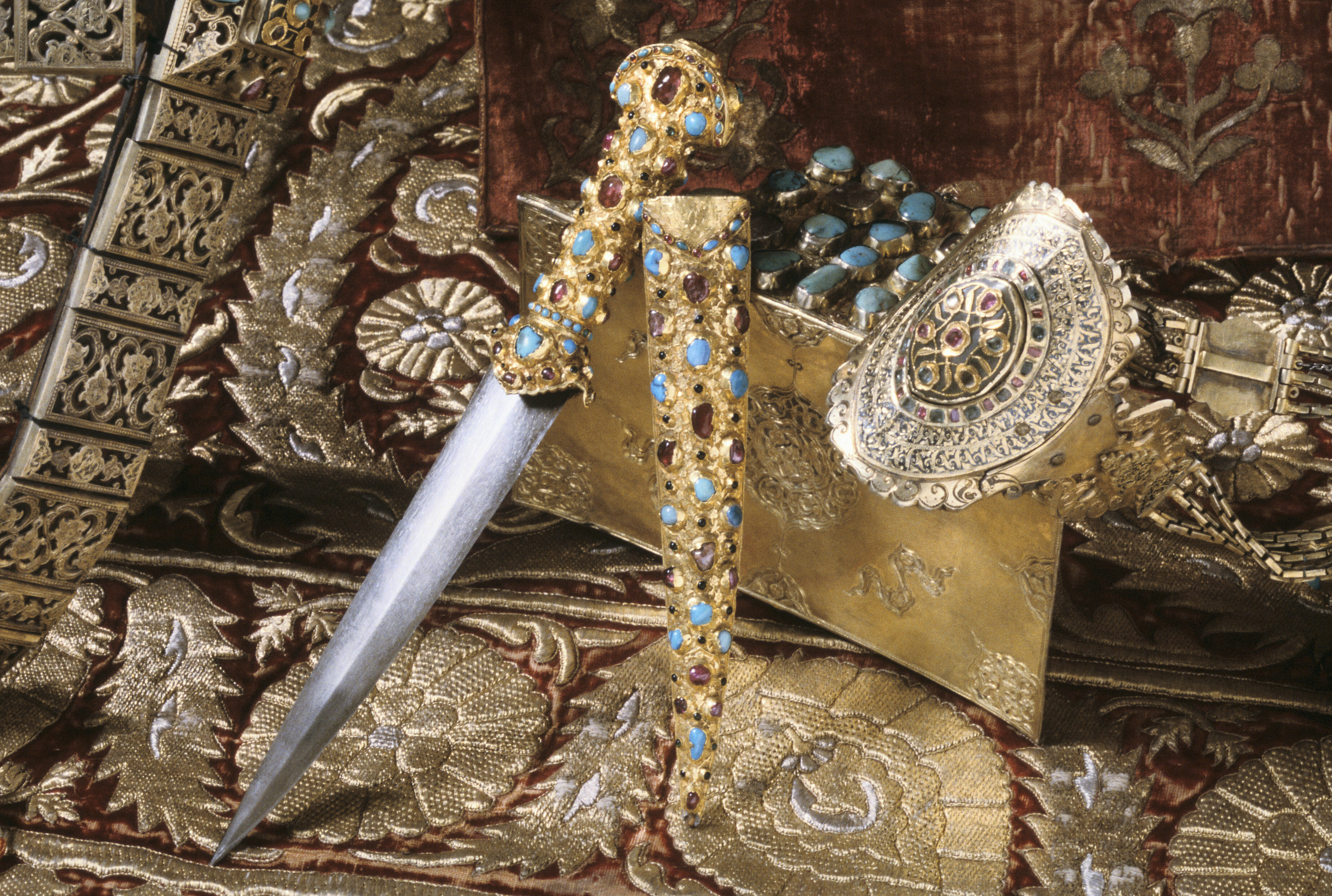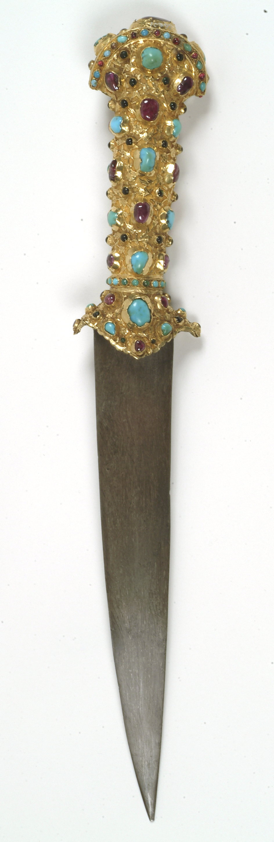 Turkisk dolk, fäste helt och hållet öfverdraget med guld, rikt infattadt med ädla stenar, nämligen 51 ametister och rubiner samt 93 turkoser och andra gröna stenar ....