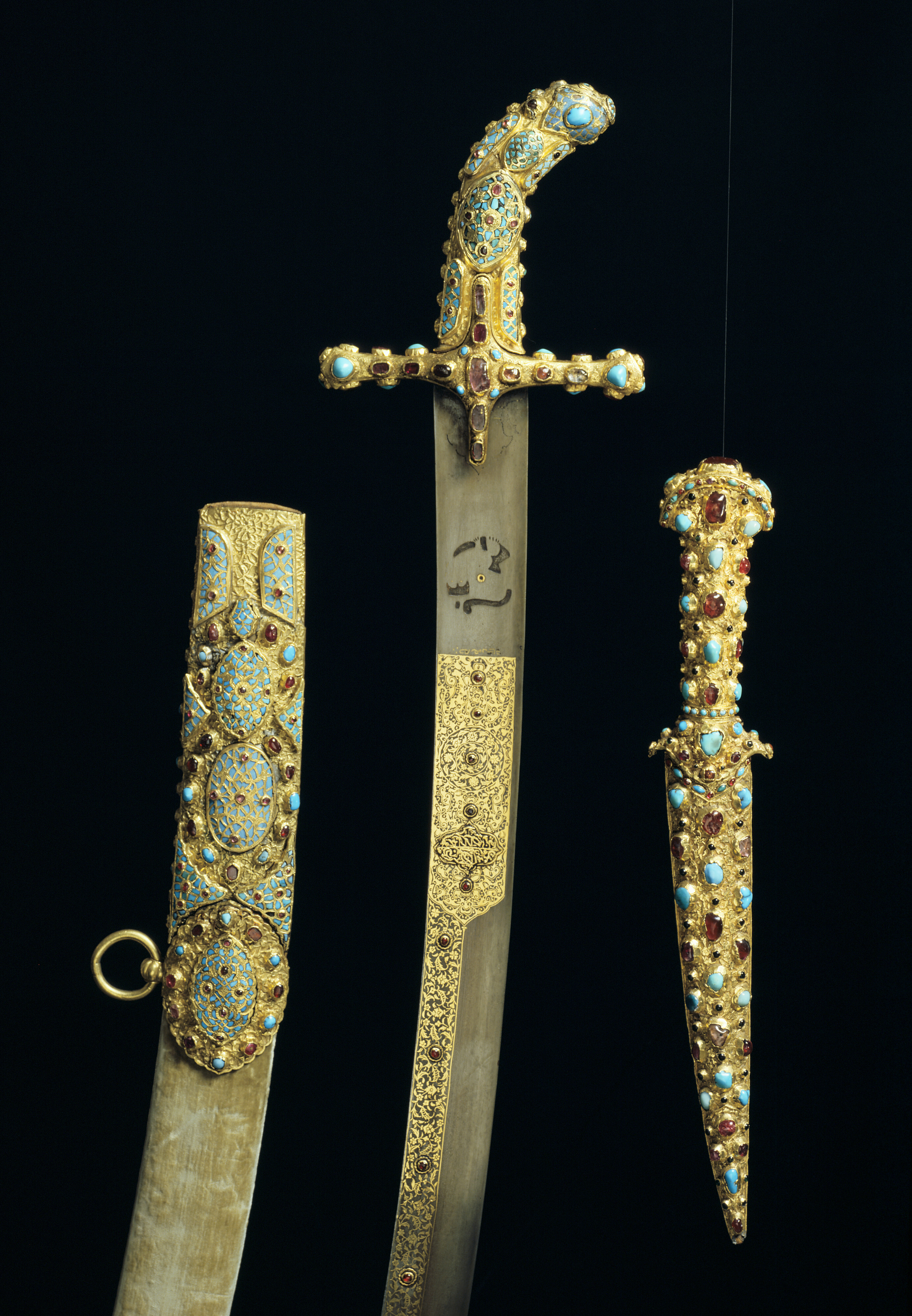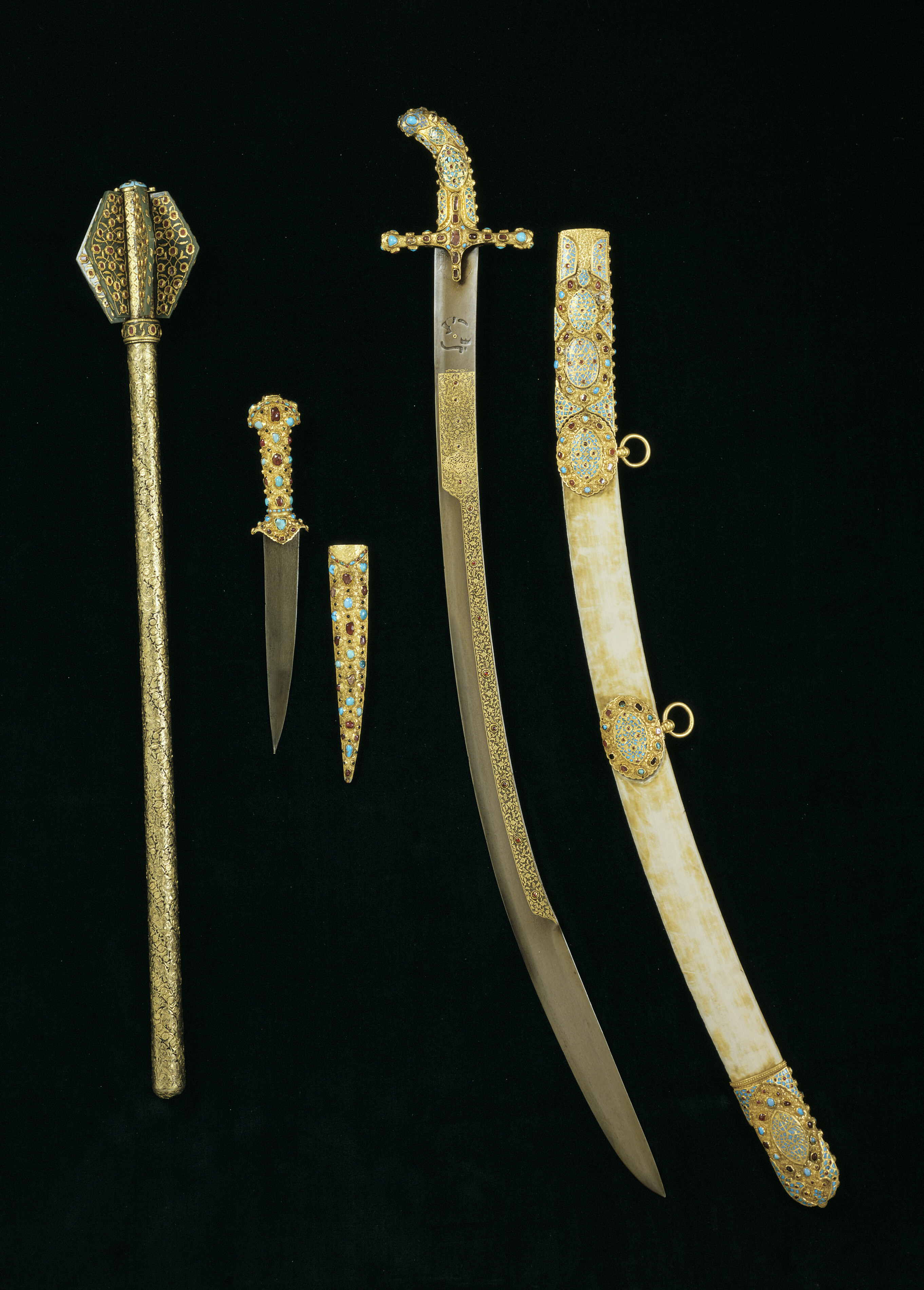 En Persianisk Darth, öfwerdragen med Guld Skaftet och Slijdan alt öfwer besatt med Turkoser, Rubiner och Glasstenar Nembl.