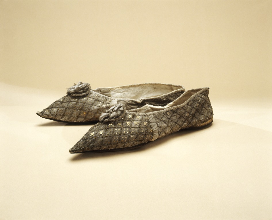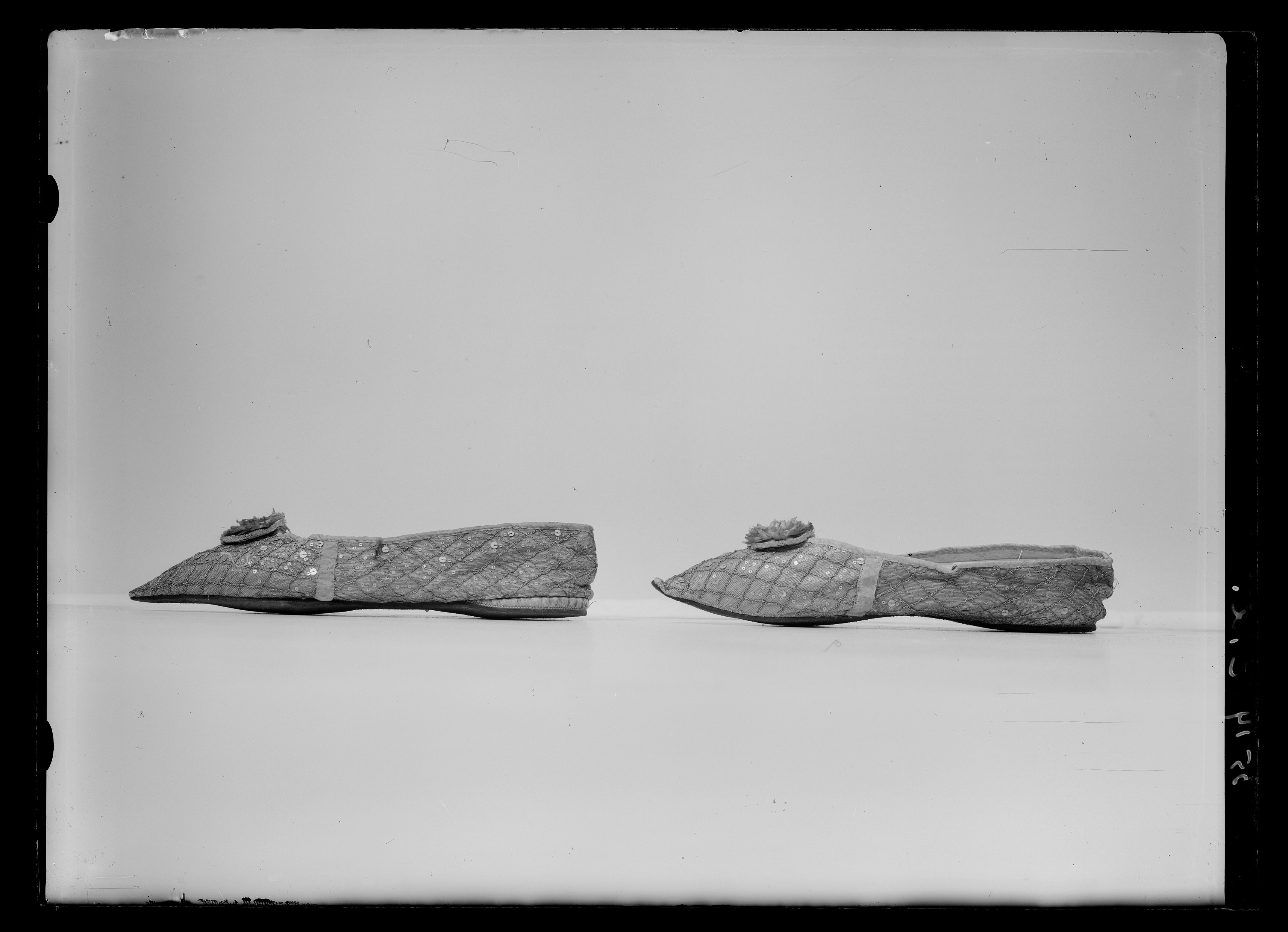 Pumps av rak modell med spetsig tå. Av silverlamé varöver i rutnät broderats med tambursöm, i varje ruta har 4 små guldpaljetter sytts fats runt en större i mitten. Framtill i ringningen en rund rosett av plisserat vitt siden, över sid- och baksömmen har ett 10 mm brett, vitt sidenband sytts. Detta utgör också kantskoning. En låg klack (kilklack) 7 mm hög, har kilats in mellan ytter- och innersulan. Sulan framtill vändsydd men randsydd vid klacken. I tåpartiet foder av vitt siden, inre sula och bakkappa av vitt skinn. Modellen är skuren i ovandel och två sidostycken, en spetsig tå och har en liten kilklack insydd mellan sko- och slitsula. Silvertyget är dekorerat med romber av guldtråd utförda i tambursöm. Varje romb är smyckad med en stor och fyra små guldpaljetter. Framtill är skon smyckad med en bandros av benvitt siden. Skon fodrad framtill med siden och i bakkappan med benvitt getskinn så även innnersulan. På slitsulan finns korsformiga pinnhålsstämplar.