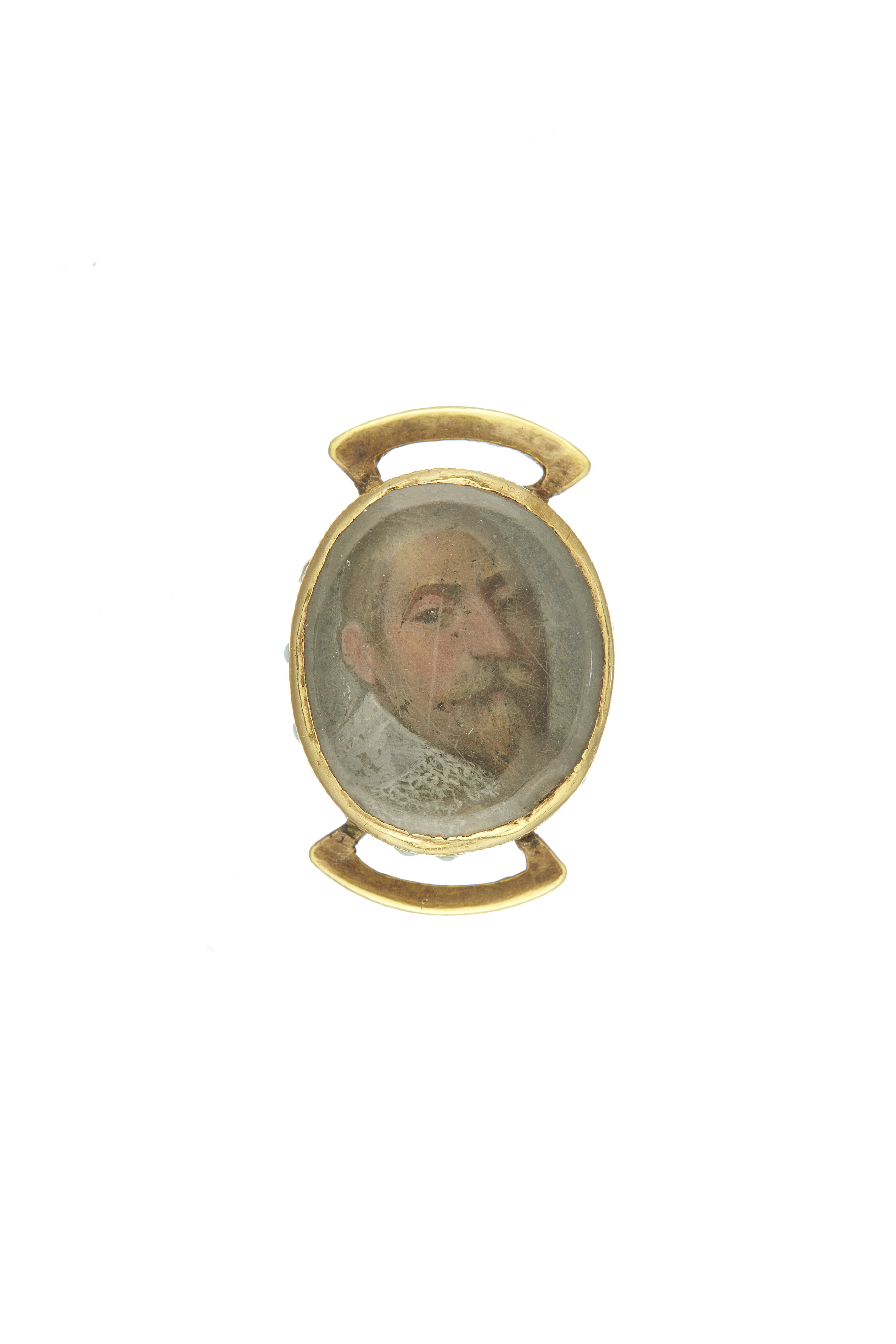 Gouache på metall(?). Bröstbild, fas h., spetskrage, gul rock, hög ansiktsfärg. Fattad under glas med fasad kant i oval bracelette av guld med räfflad kant, därpå droppar av turkosblå emalj. Baksidan likaså täckt med turkosblå emalj. Två bandbyglar av guld.