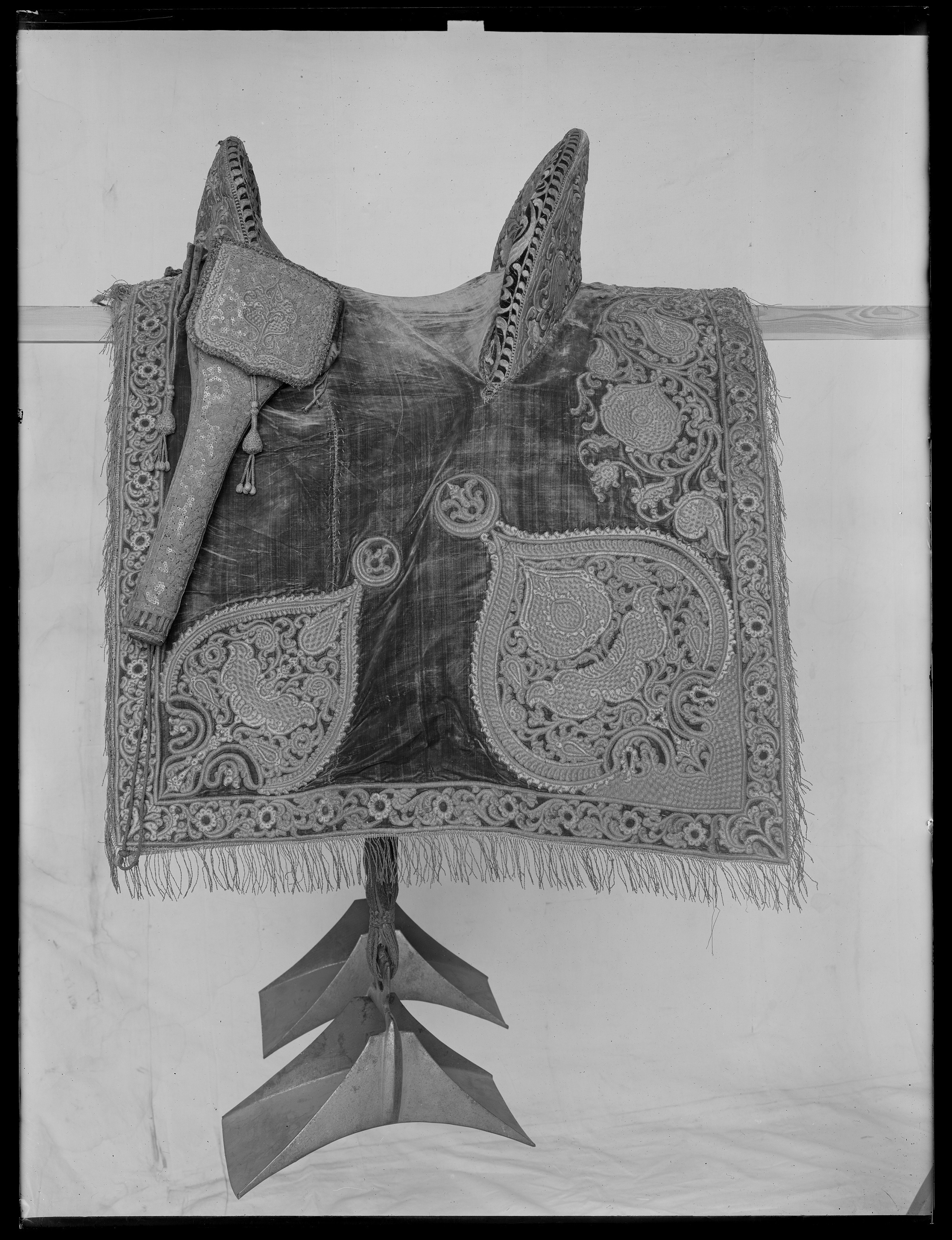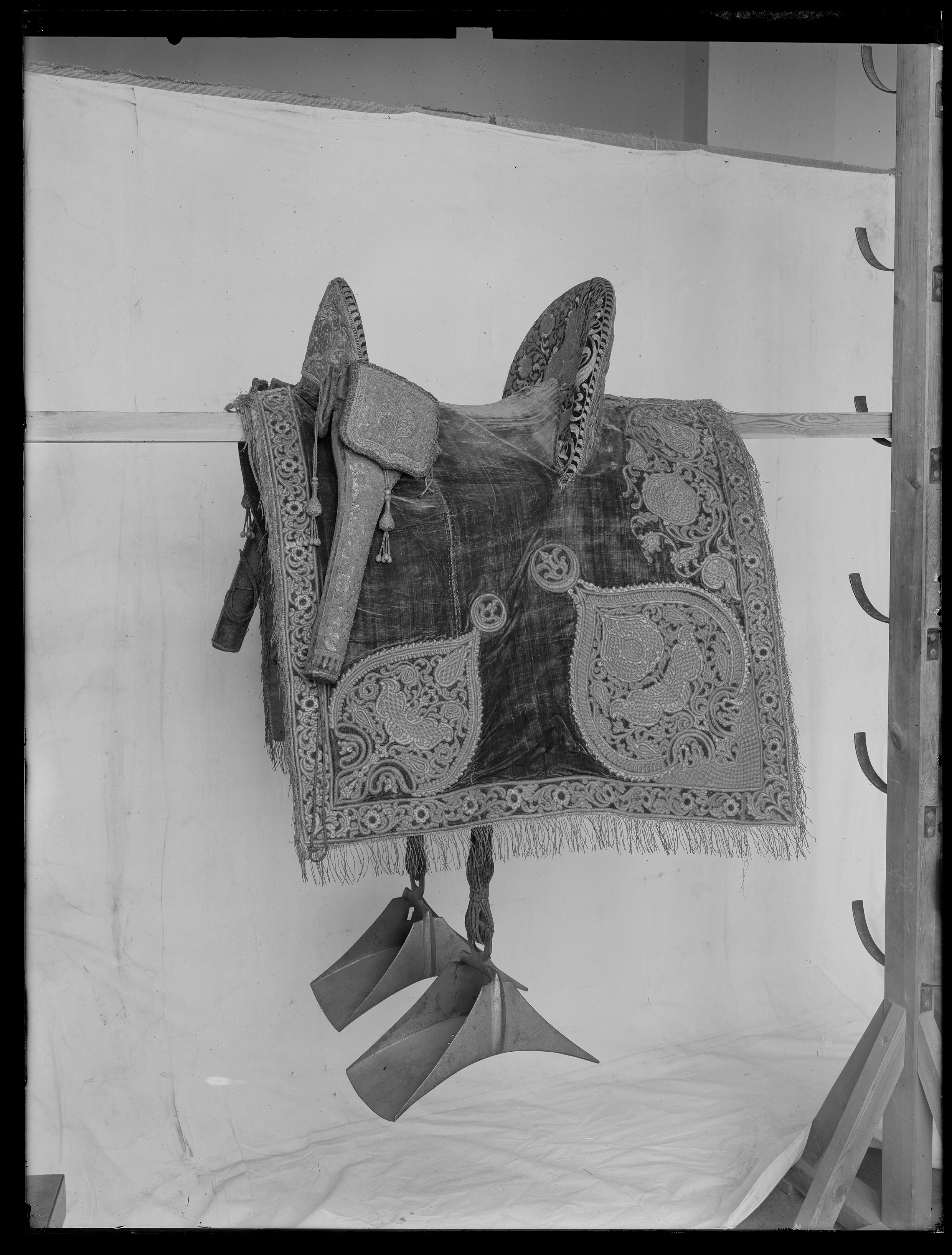 - Turkisk sadel af mörkrödt sammet, rikt broderad med guld och silfver, med lös sits, broderad på samma sätt; pistolhölster, öfverklädda med rödt sammet med rikt broderi af silfver, guld och paljetter, samt försedda med små broderade ammunitionspåsar af samma tyg; bukhjol af ylle med inväfdt guld samt messingsöglor;