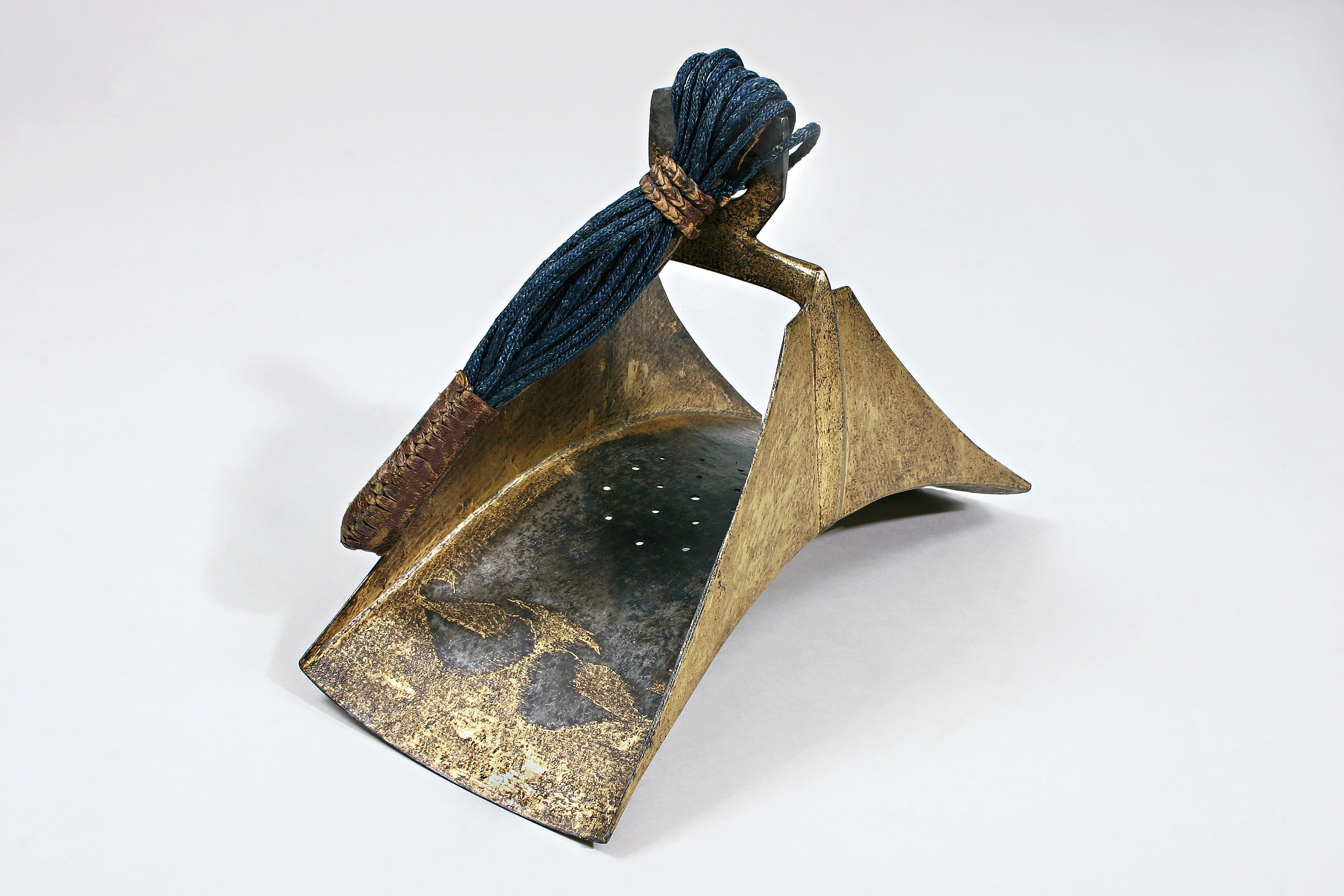 Stigläder, förstärkta med mångdubbla flätade snören af blått silke; stigbyglar af järn, förgylda, samt ås teget genombrutna med tjugu runda hål.