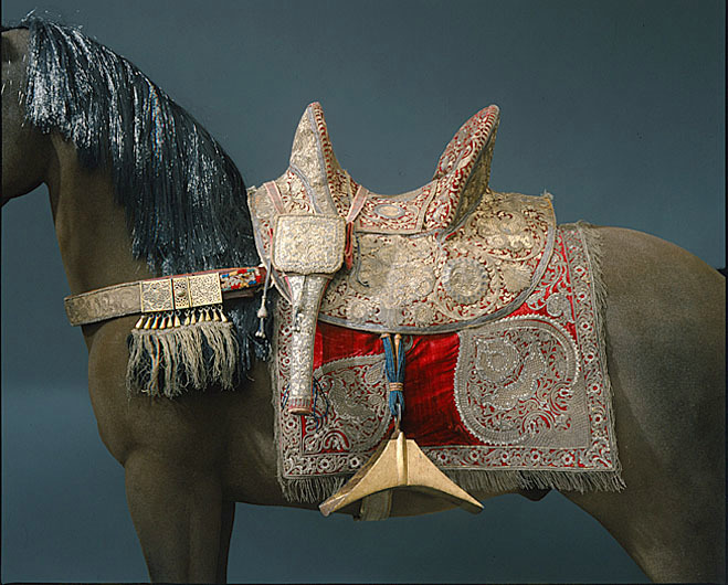 - 1 Dito (Turkisk sadel) af rödt sammet, broderad med guld och silfwer; 2 pistolhölster af lika tyg och broderi; 1 gjord af reggarn med inväfett guld samt silfwer öglor; 1 förbygel af rödt läder med guldbroderi, 6 st utgraverade brockor af silfver med 24 st silfverkläppar med frans af swart silke och guld och 2ne söljor af silfwer; 1 hufwudlag af rödt sammet med guld broderi, 4 stora rosor af förgyldt silfwer, 2 snibbar med berlocker och 2ne tampar med öglor och ringar af silfwer; 1 tygel af rödt silke med inväfvet guld; 1 betselstång; 1 par stegbyglar af förgyldt jern samt 1 schabrak af rödt sammet, rikt broderadt samt försedt med guldfrans.
