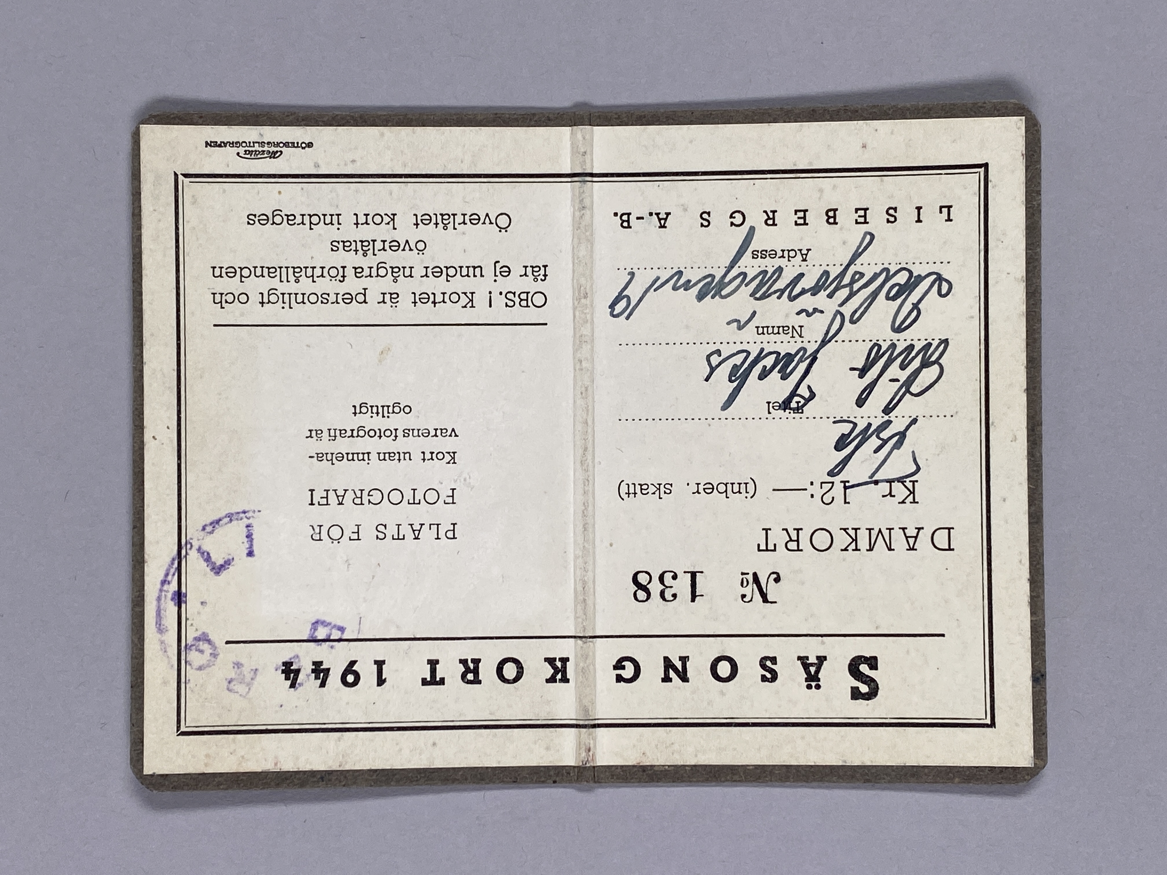 Lieselotte (Lilo) Jacks säsongskort på Liseberg 1944. Lieselotte var ett av de barn som kom till Sverige från Nazityskland med barntransporter som Mosaiska församlingens hjälpkommitté ordnade. Liseberg kom att bli en viktig plats för Lilo.