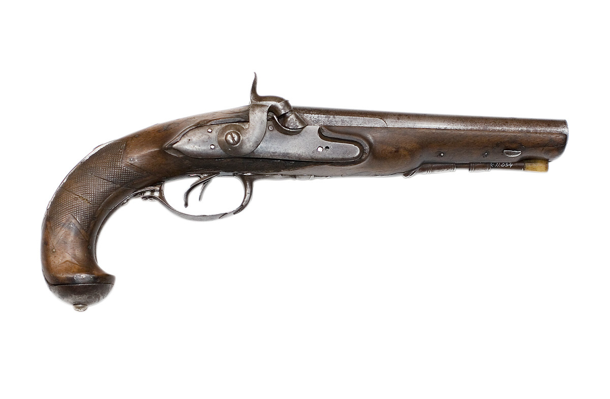 Slaglåsdubbelpistol, 1800-talets början, har möjligen haft flintlås.