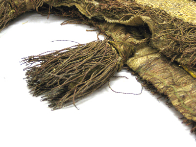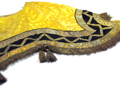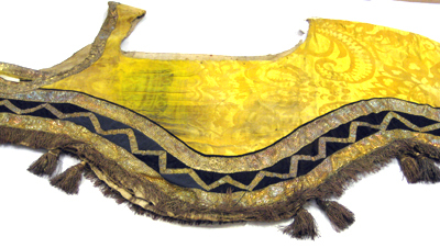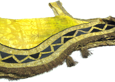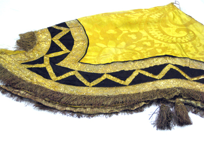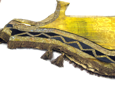 Tornerschabrak av gul sidendamast, vågformigt skuret nedtill och med en utskärning för sadeln upptill. Hål för svansen samt öppet fram med ett med bronsspännen fasthakat stycke vid bogen på vilket sitter två hyskor av brons samt två naturfärgade linneband som knyts med motsvarande två linneband på höger framstycke. Schabraket kantas nedtill av svart siden och med två breda guldgaloner av förgylld silvertråd och gul silkestråd, b.55 mm. Mellan de breda guldgalonerna är påsytt en smalare guldgalon i ett viggmönster, b.18 mm. Likaså kantas schabraket på sidorna, fram- och bak, av guldgalon. Nederst kantas schabraket av en 55 mm lång frans av röd silkestråd tvinnad med förgylld silvertråd. Vid fransen är påsytt sex tofsar i par, två och två. Tofsarna är av tvinnad röd silkestråd och förgylld silvertråd och under fransen ligger ett styvt stycke av förgyllda lan för att få ut vidden. Tofsarnas knopp är av trä, överklädd med förgylld silvertråd. Tofsarna sitter fästade på smala band av tvinnad förgylld silvertråd och dess totala längd är 145 mm medan själva tosen är 100 mm lång. Schabraket är fodrat med naturfärgad säckväv.