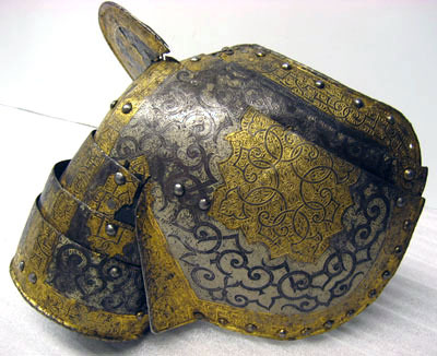 - 1 Sluten Hjelm af drifvit Jern, rikt incrusterad med GUld och Silfver, med en stoppad SIdentygs mössa