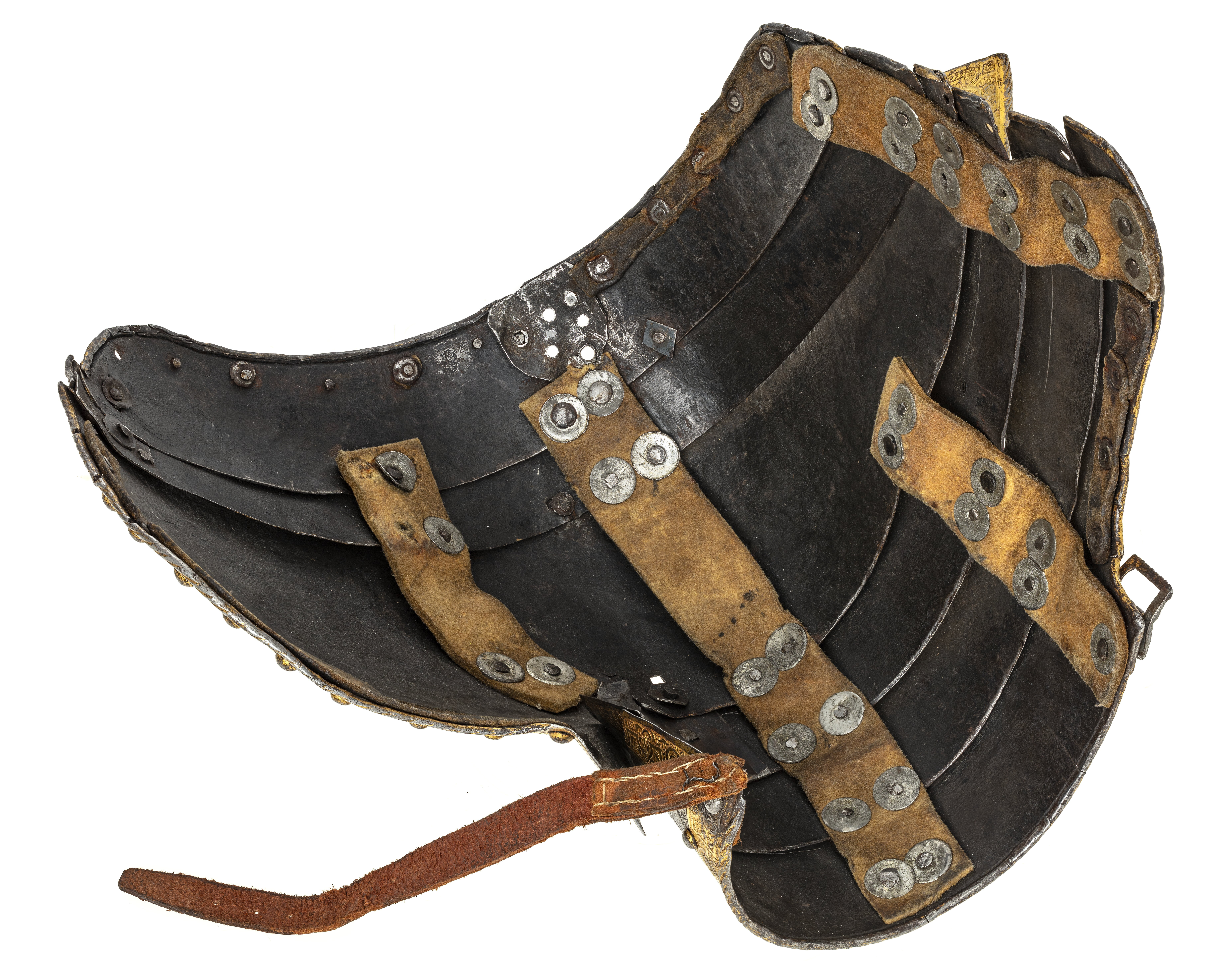 bröstharnesk med rörliga betäckningar för axelvecket, 2:ne slöjor och tornerhake med ledgång, bukbetäckning i 3 delar, fästad vid bröstharnesk, 2 lårlappar, hvardera i 4 delar med 2:ne slöjor, ryggharnesk med höftbeteckning i 2:ne delar och 2:ne rörliga spännskenor,