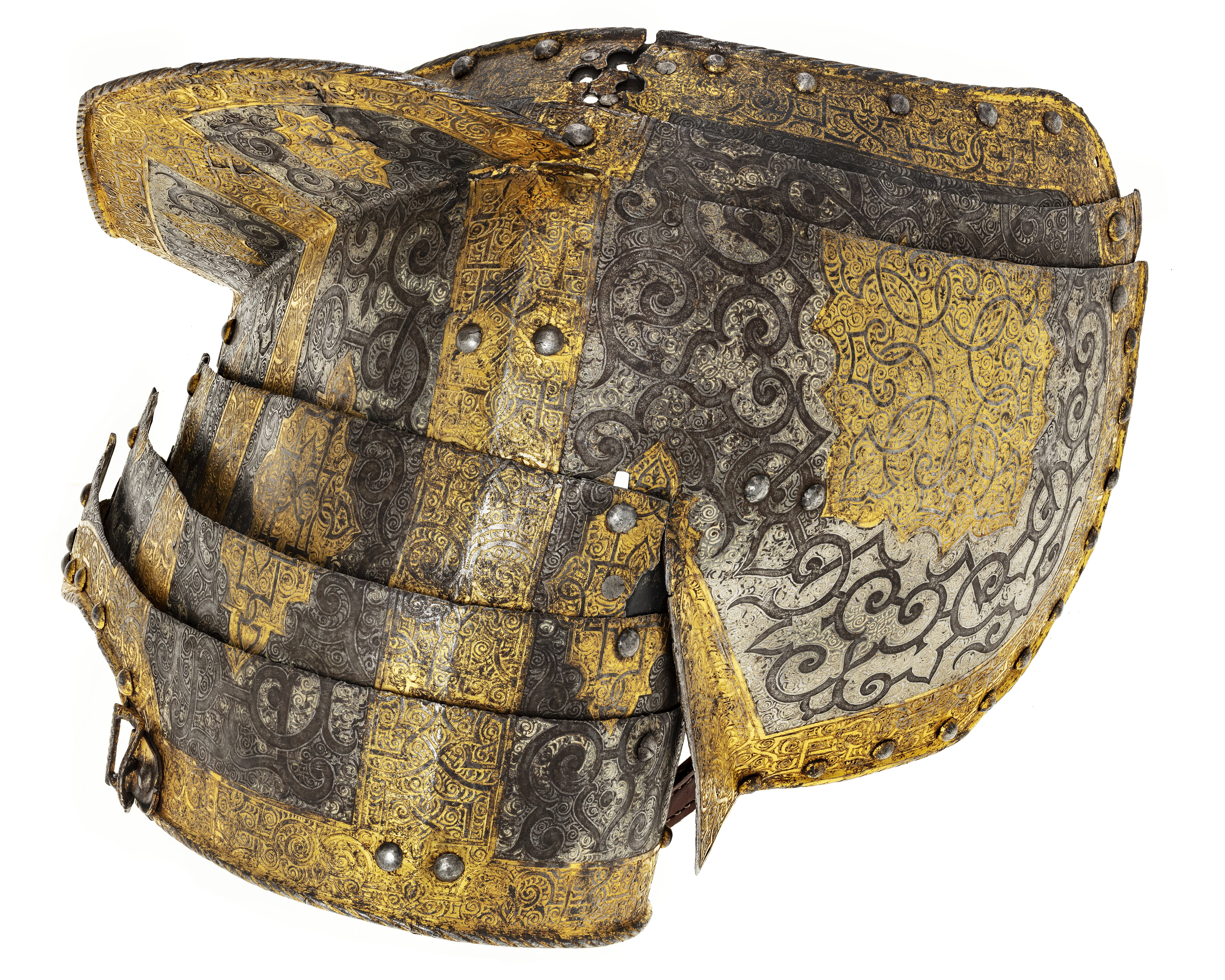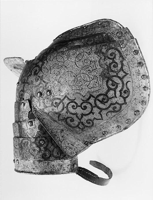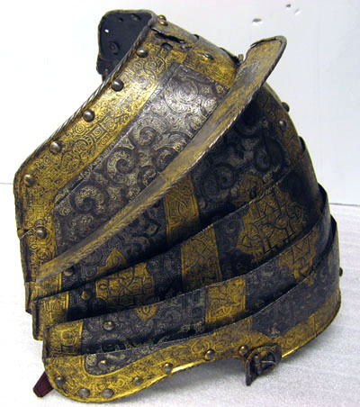 - 1 rustning af jern, helt och hållet etsad i ornamenter, hvilka äro dels förgyllda dels ifyllda med en hvit massa, rustningen, som uppgifves hafva tillhört konung Christian II, består af: hjelm i 5 delar med slutet visir, hakbetäckningen att öpna på midten, kammen hög, starkt bakåtsluttande, för hjelmbusken en hylsa, muttern på ena sidan af visiret jemte knappen till fjedern på öfre visiret borta, hjelmen invändigt fodrad med stoppning, öfverklädd med sidensars,