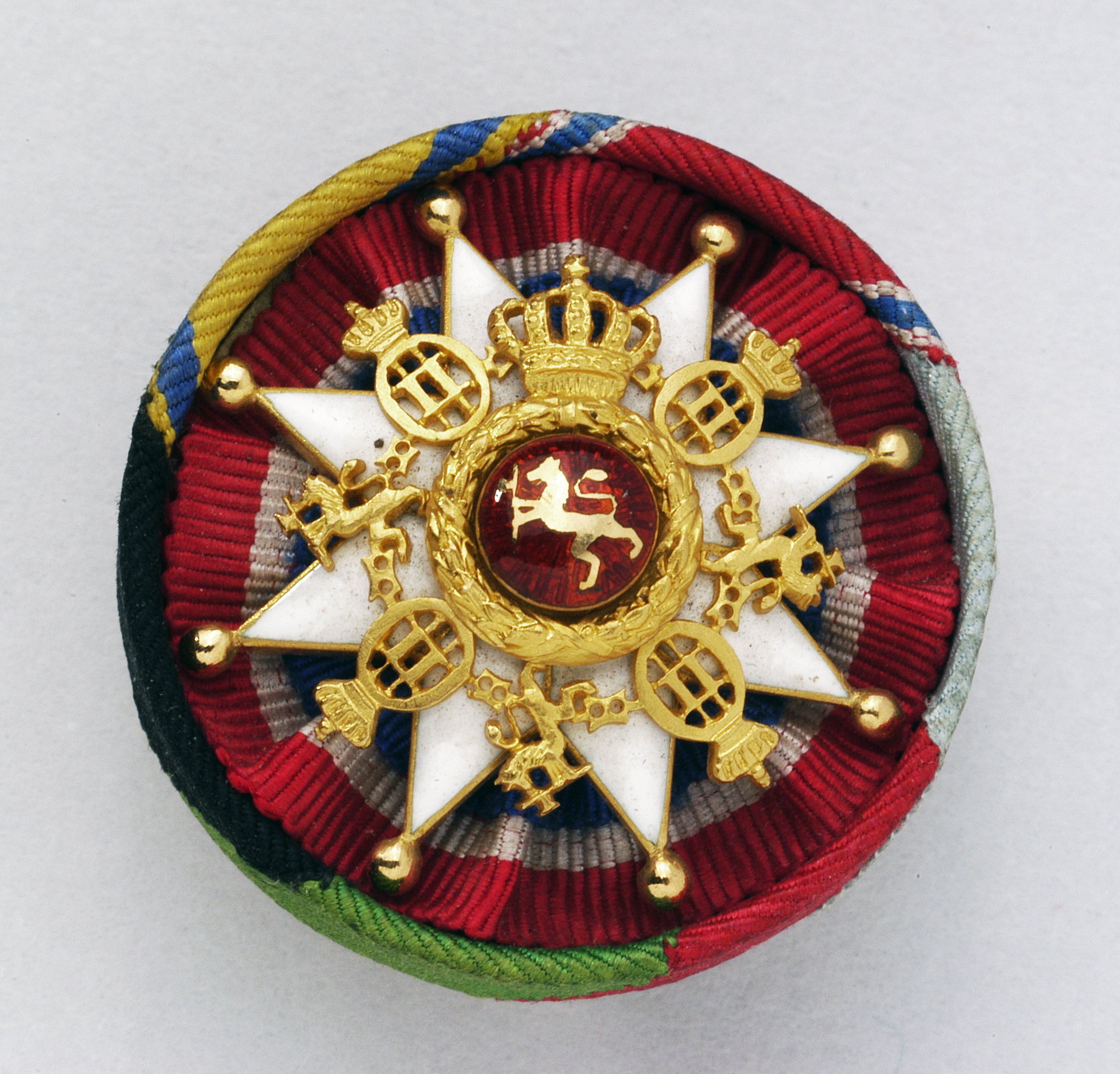 Ordensknapp, invändigt klädd med band för Norska lejonets orden samt miniatyr av ordens kraschan.