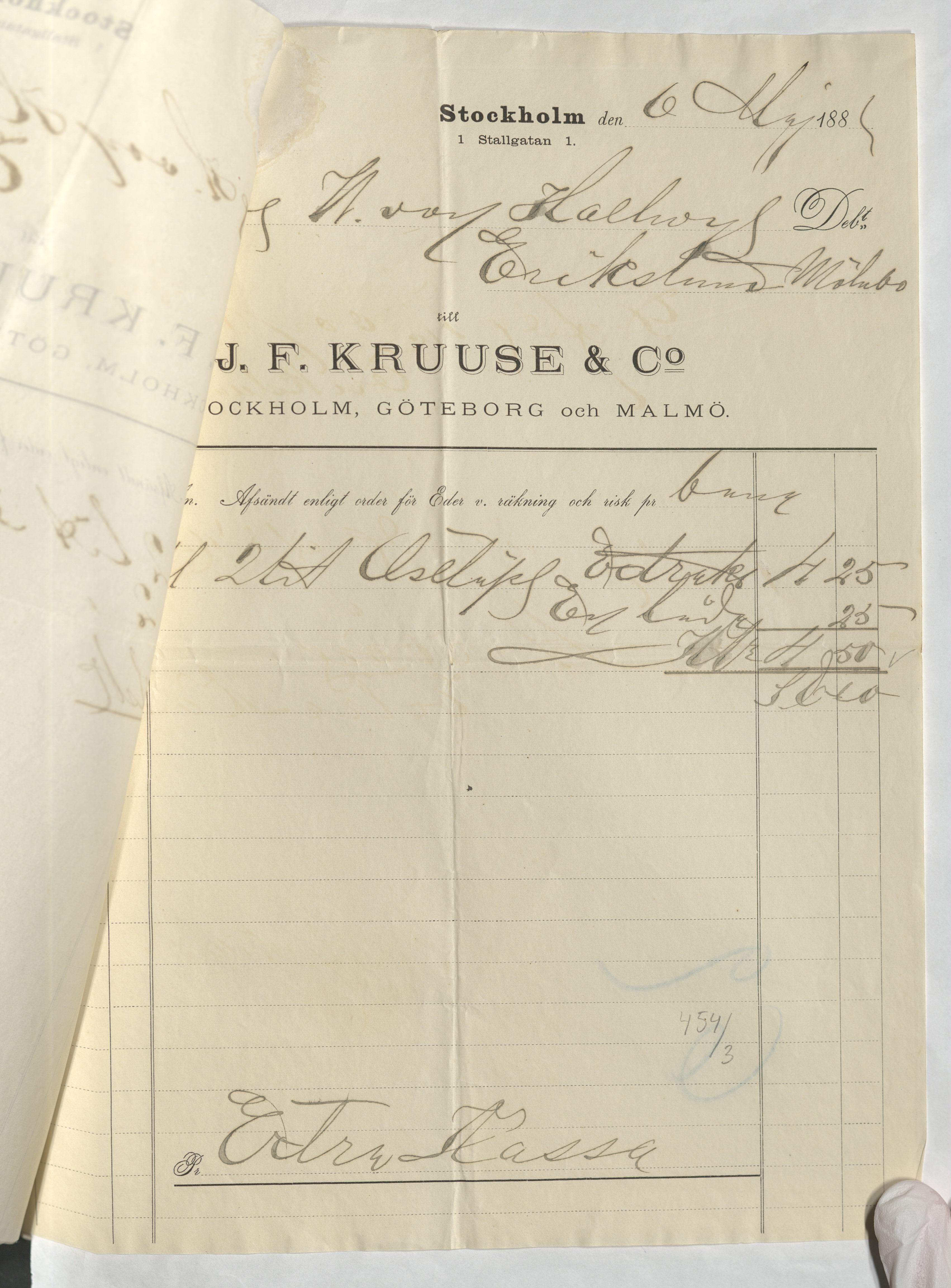 Kvitto från J. F. Kruuse & Co. Stockholm, 1881.