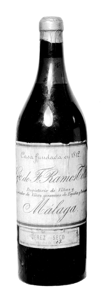 JEREZ SECO, Hijo de F. Ramos Tellez, málaga, från 1868, två helbuteljer Buteljer av mörkgrönt glas. Cylindriska, med sluttande indragen skuldra och smal, något konisk hals, kring vars mynning en bandliknande utsvällning (s. k. stärkring); bottnen skålig. Etiketter, en större och en mindre, i vitt, på den förstnämnda firmanamn m. m. i guld, på den sistnämnda text och årtal i svart. Kapsyl av förtent bly, ofärgad, ovanpå en druvklase i relief. Höjd: 28,5 och 30,5 cm.; diameter: 8 och 8,3 cm. Inköpt av Walther von Hallwyl något av åren 1868- 1917.