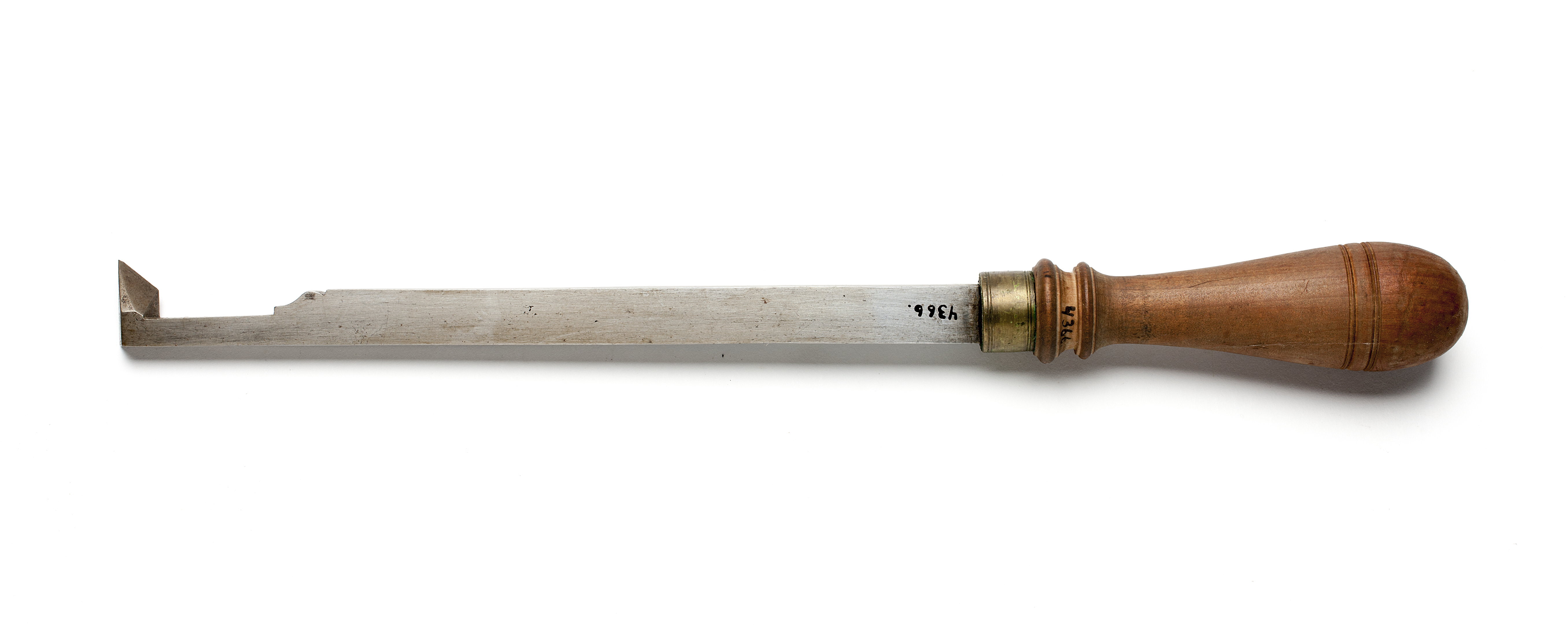 Klinga med rektangulär genomskärning, övergående via profilering på ena sidan i smalare, vinkelböjd ände med sned egg. Stämplat på klingan: "IK" under krona, Johan Kesemaker, Stockholm. Svarvat skaft av päronträ, med två vulster nedtill ("rydboholmstyp"). Mässingsring. Stämplat på skaftet: "I".