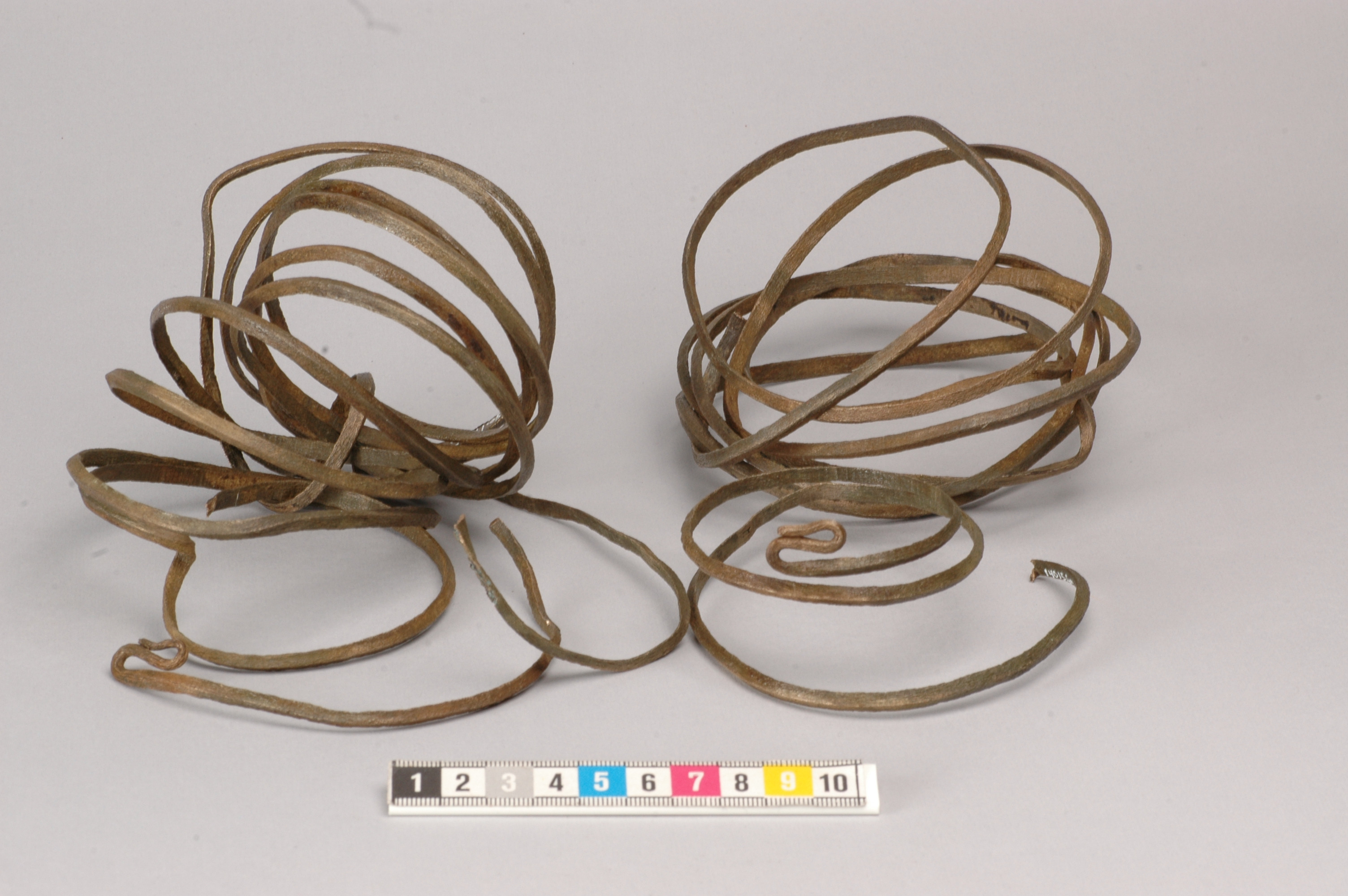 Delar av spirallagd armring av bronsten med trekantigt tvärsnitt. Två fragment har s-formad avslutning.