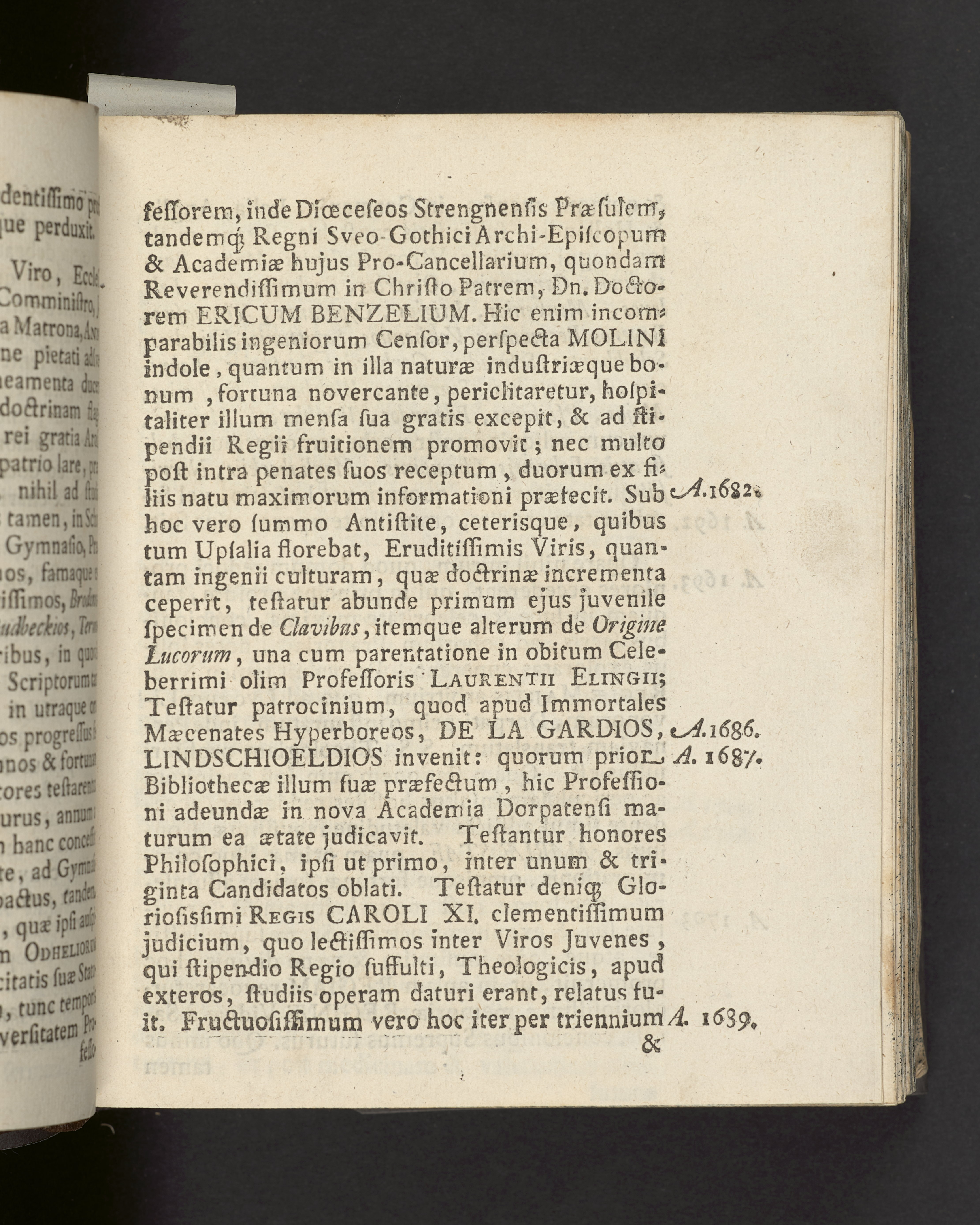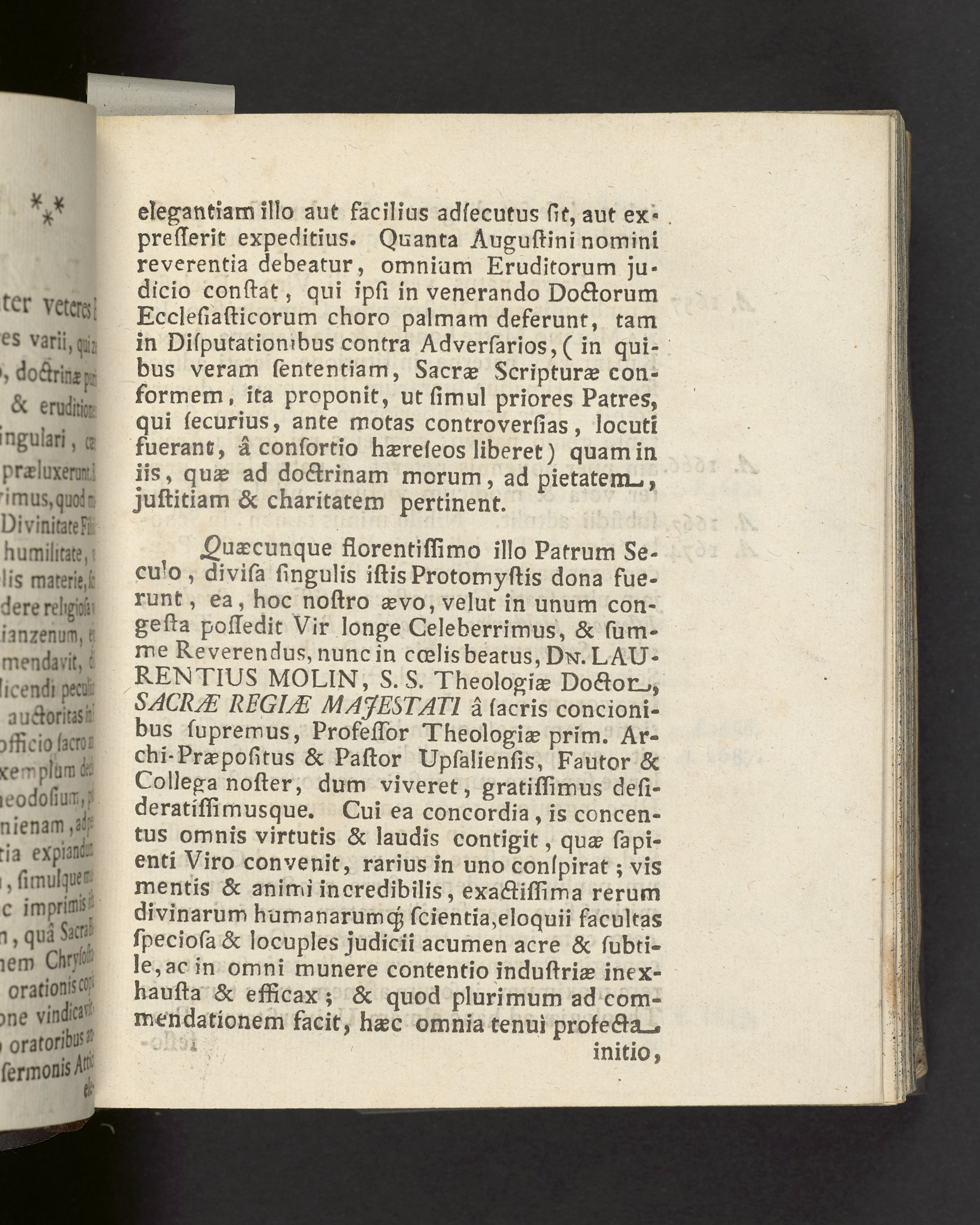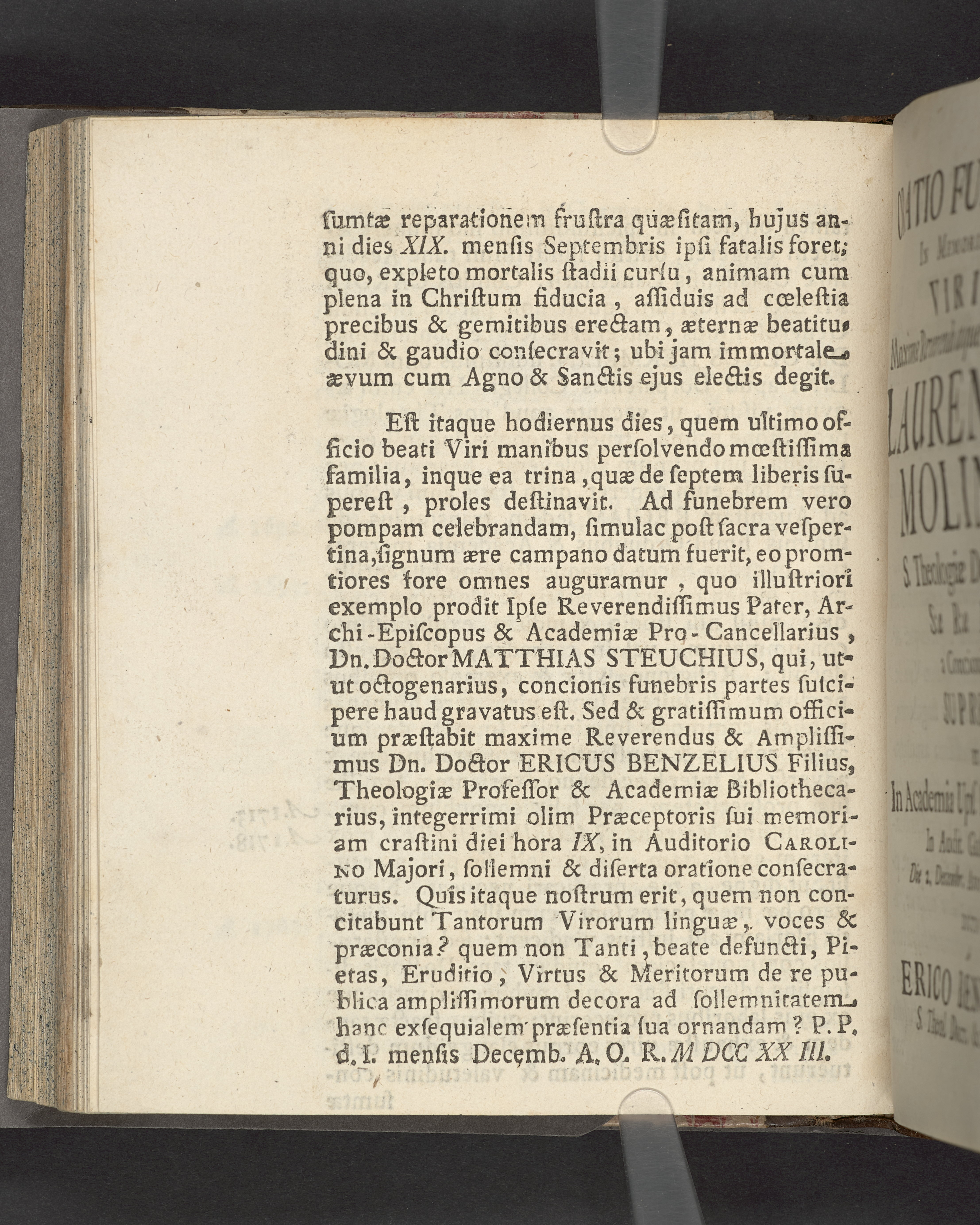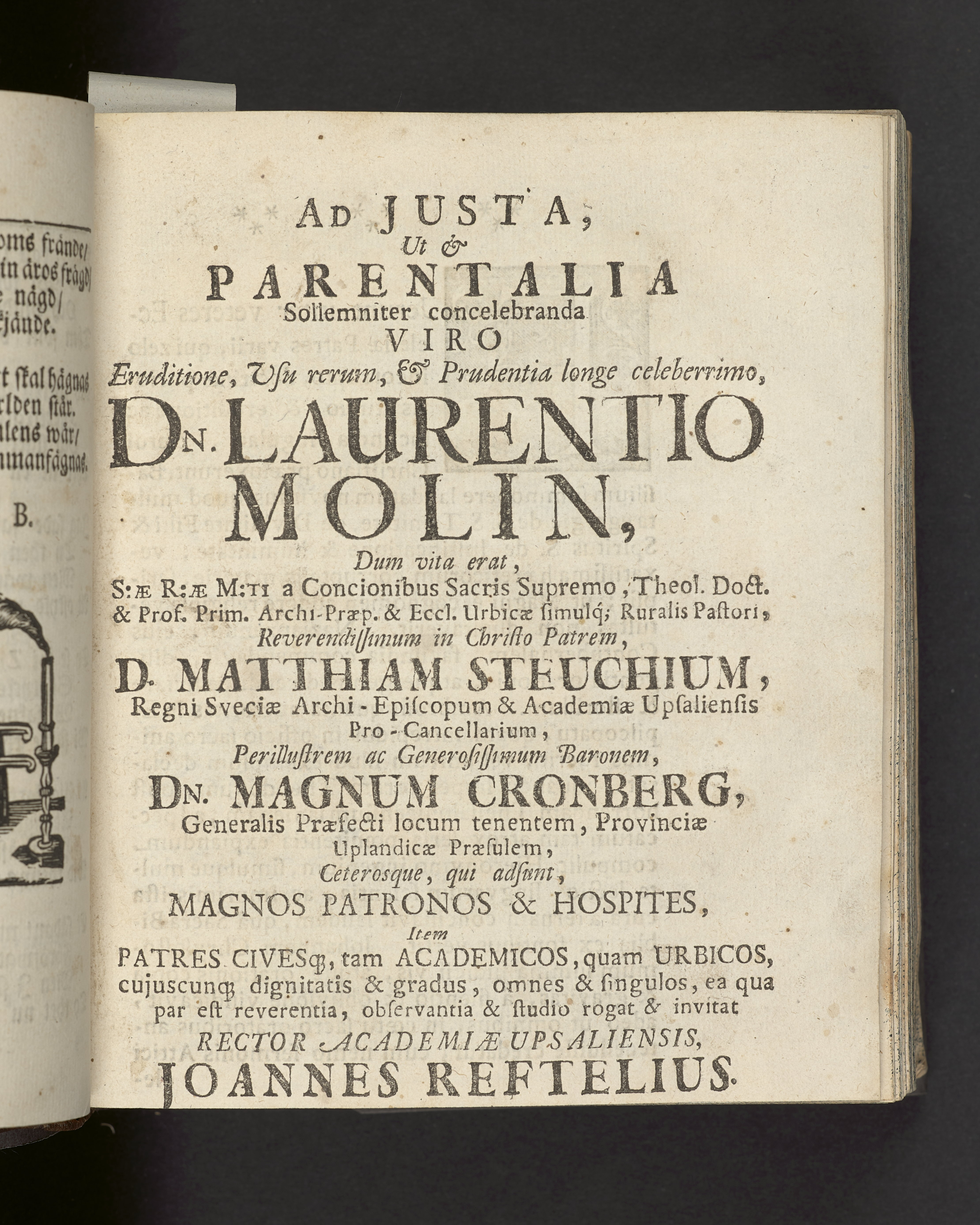 Ad justa, ut & parentalia sollemniter concelebranda viro eruditione, usu rerum, & prudentia longe celeberrimo, Dn. Laurentio Molin, dum vita erat, S:ae R:ae M:ti a concionibus sacris supremo, theol. doct. & prof. prim. archi-praep. & eccl. urbicae simulq; ruralis pastori, reverendissimum in Christo patrem, D. Matthiam Steuchium ... Magnum Cronberg ... rector academiæ Upsaliensis Johannes Reftelius.