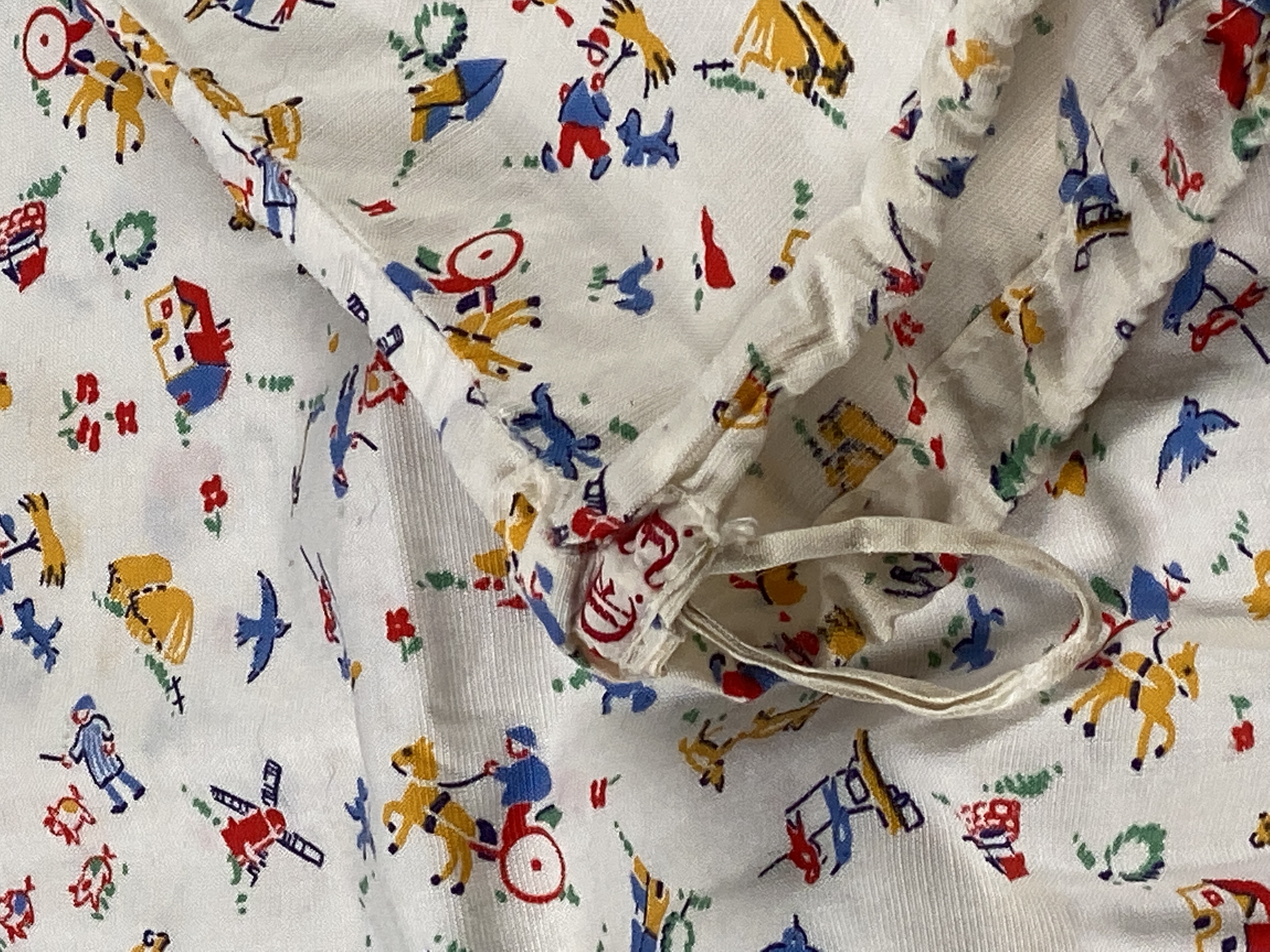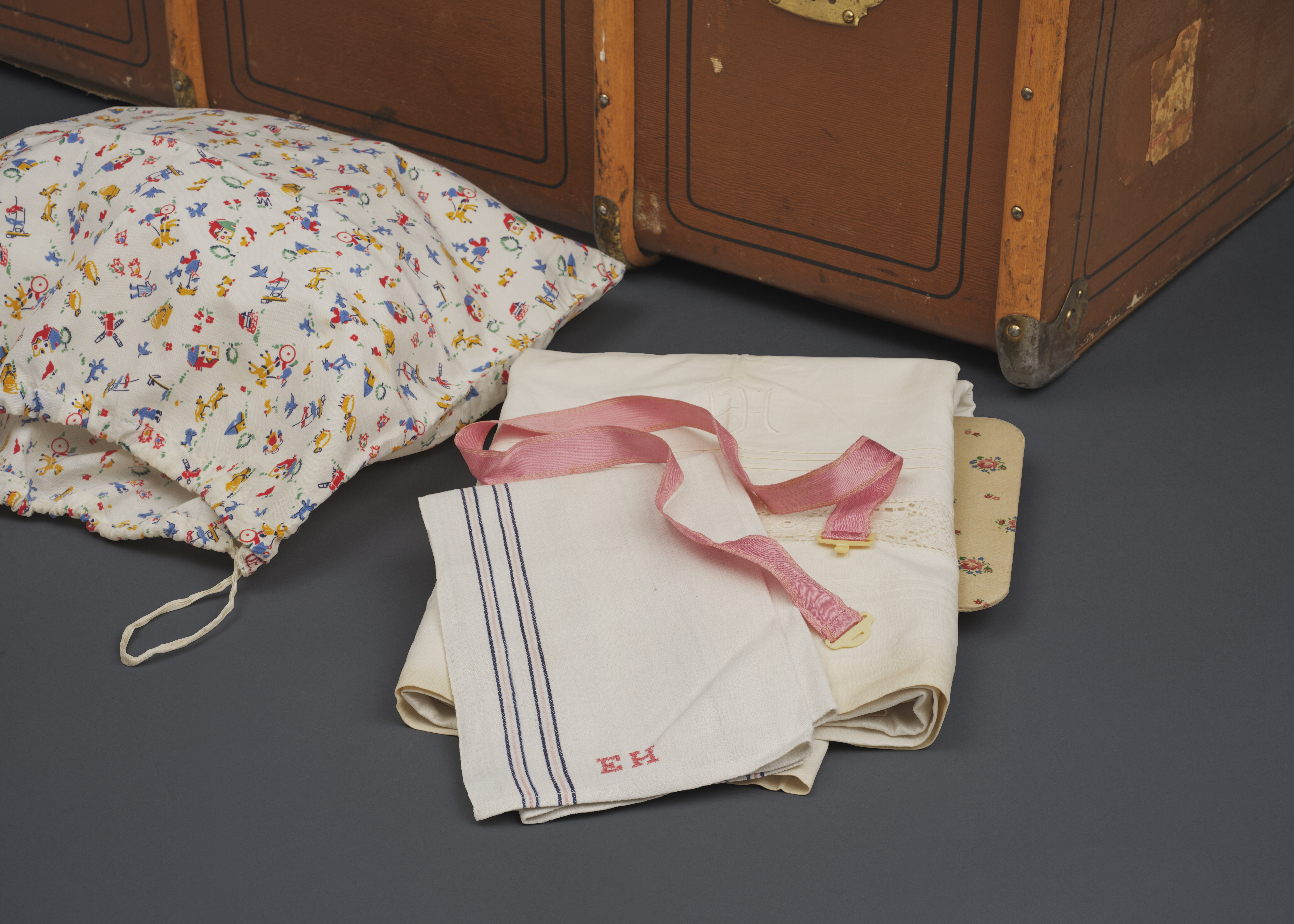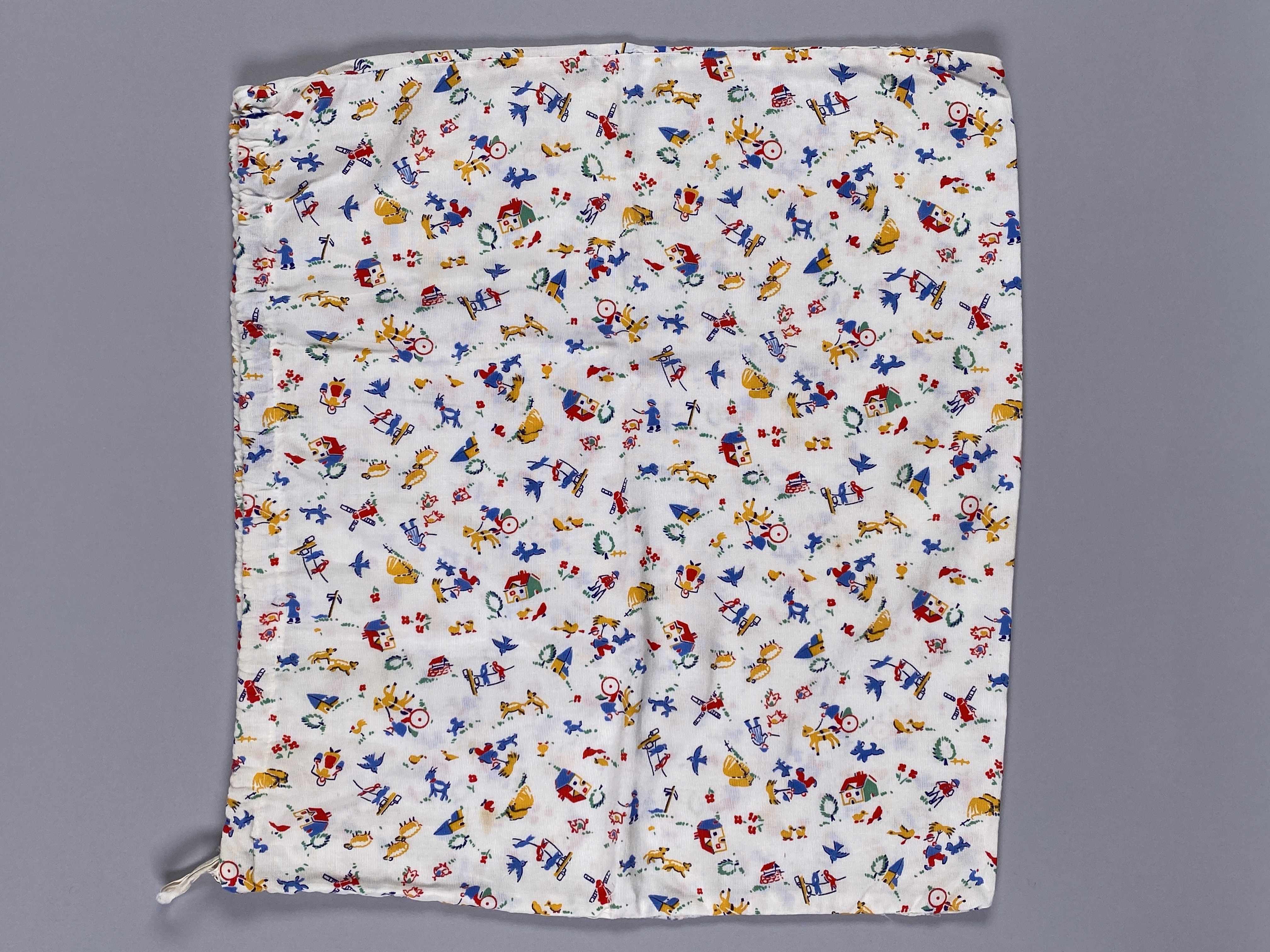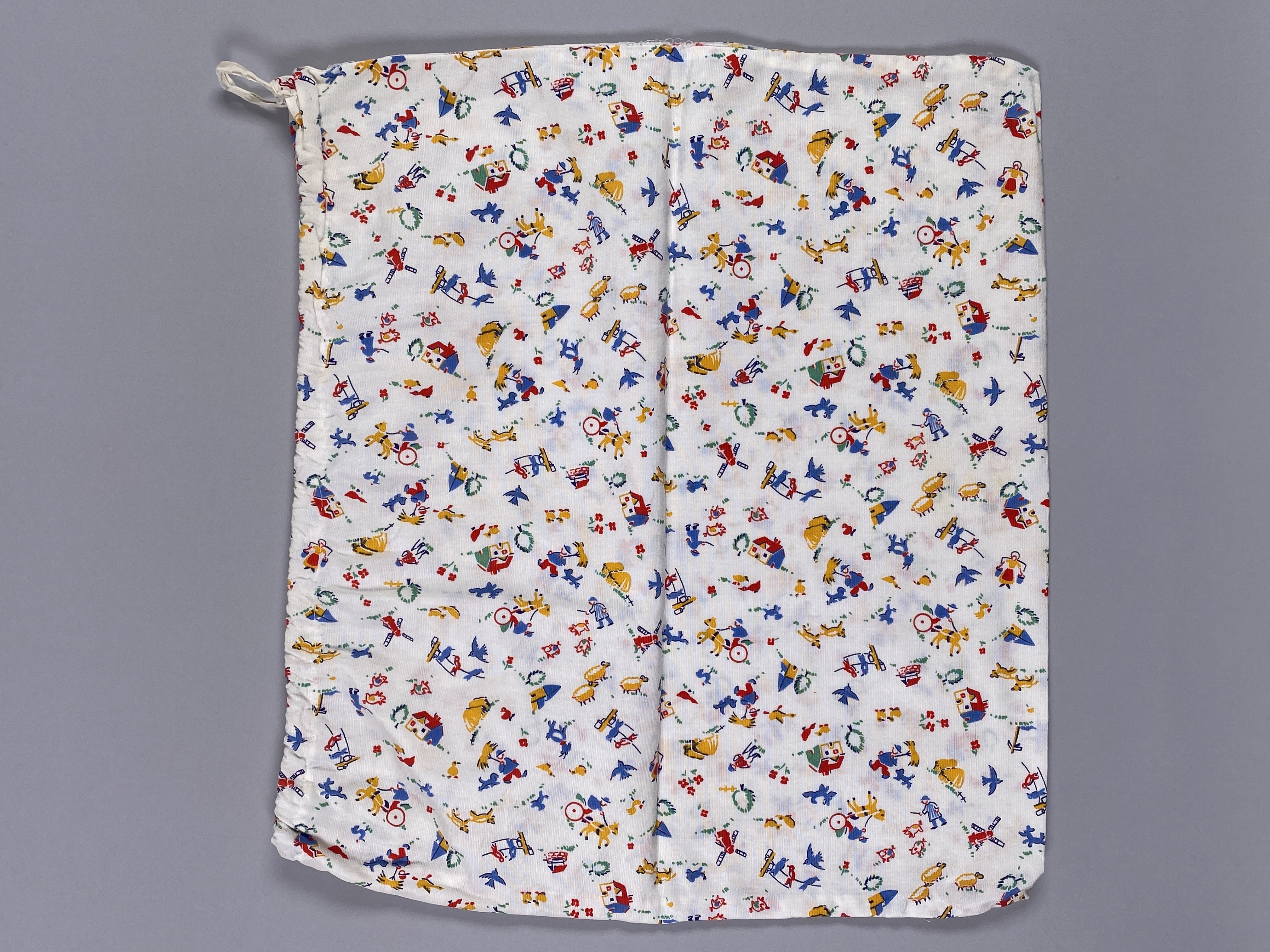 Tvättpåse i bomull. Tryckt tyg med motiv från landsbygden, till exempel en väderkvarn, ett hästekipage, får, en kyrka osv. Kanal sydd i påsens öppning i vilken löper en bomullssnodd. Vid kanalens öppning, på påsens översida finns ett textilband med initialerna "E.I" broderade i rött (för Eva Israel).