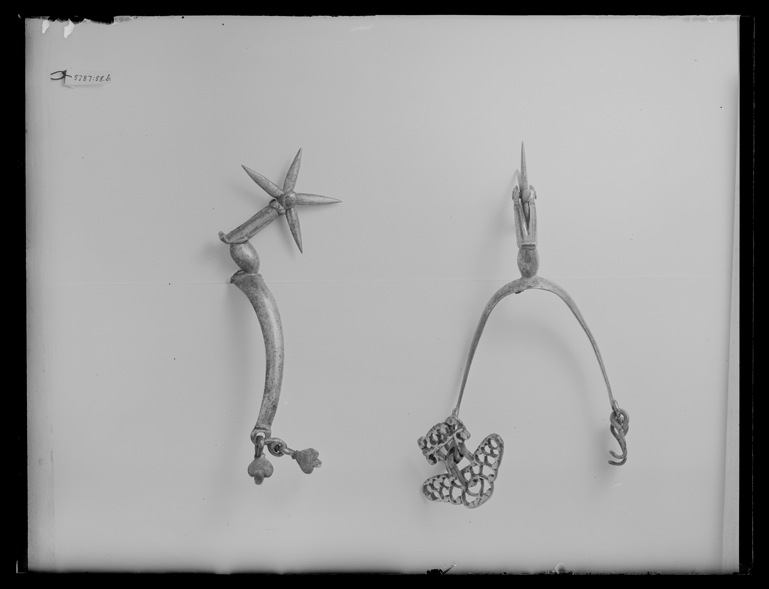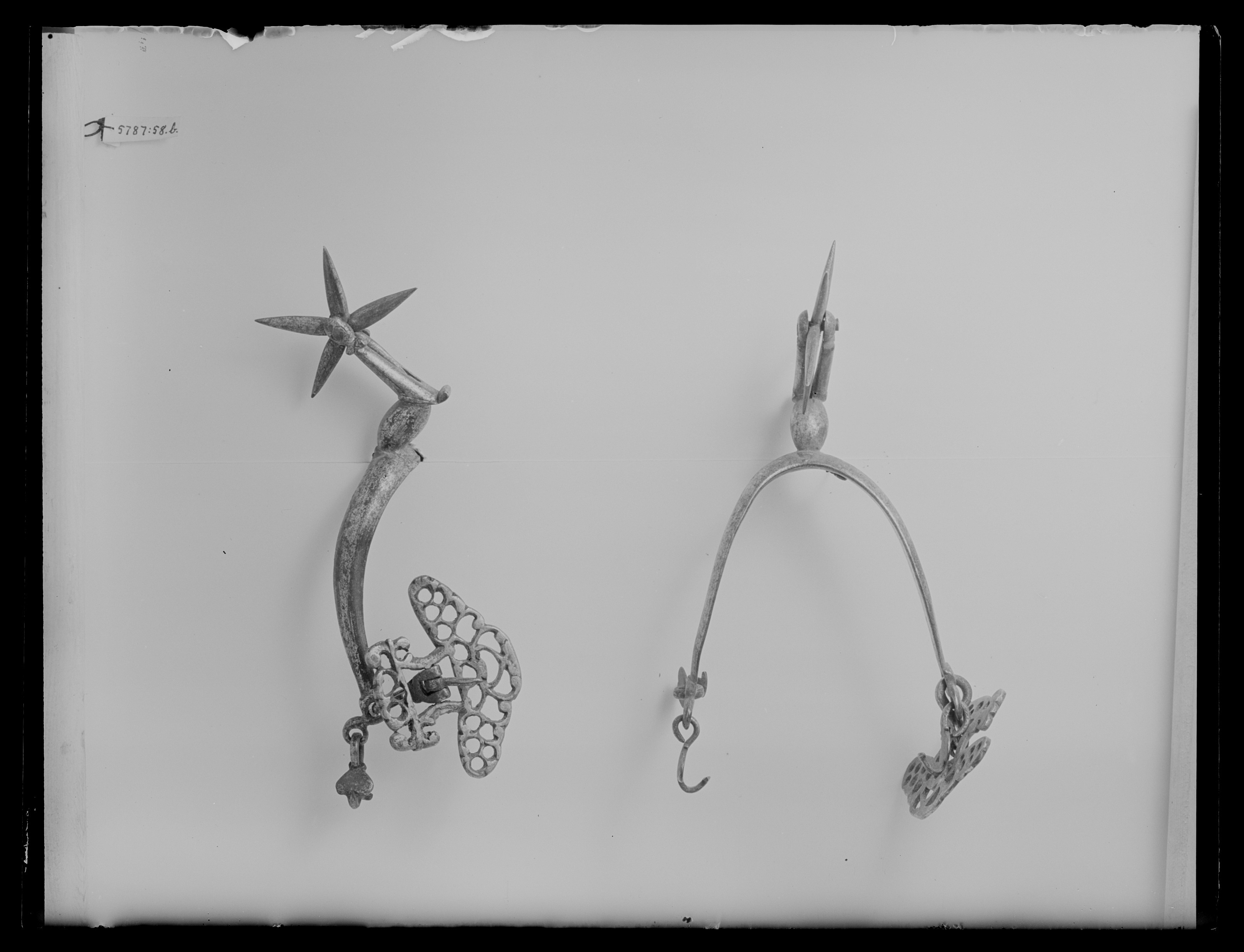 Sporre av förgyllt stål. U-formade, något böjda skänklar med konvex utsida. Ändarna böjda med hål med i ena änden två hakar, i andra änden en hake och en stor genombruten sölja av förgylld mässing. Hals, med oval fot, böjd i vinkel. Femuddig klinga.