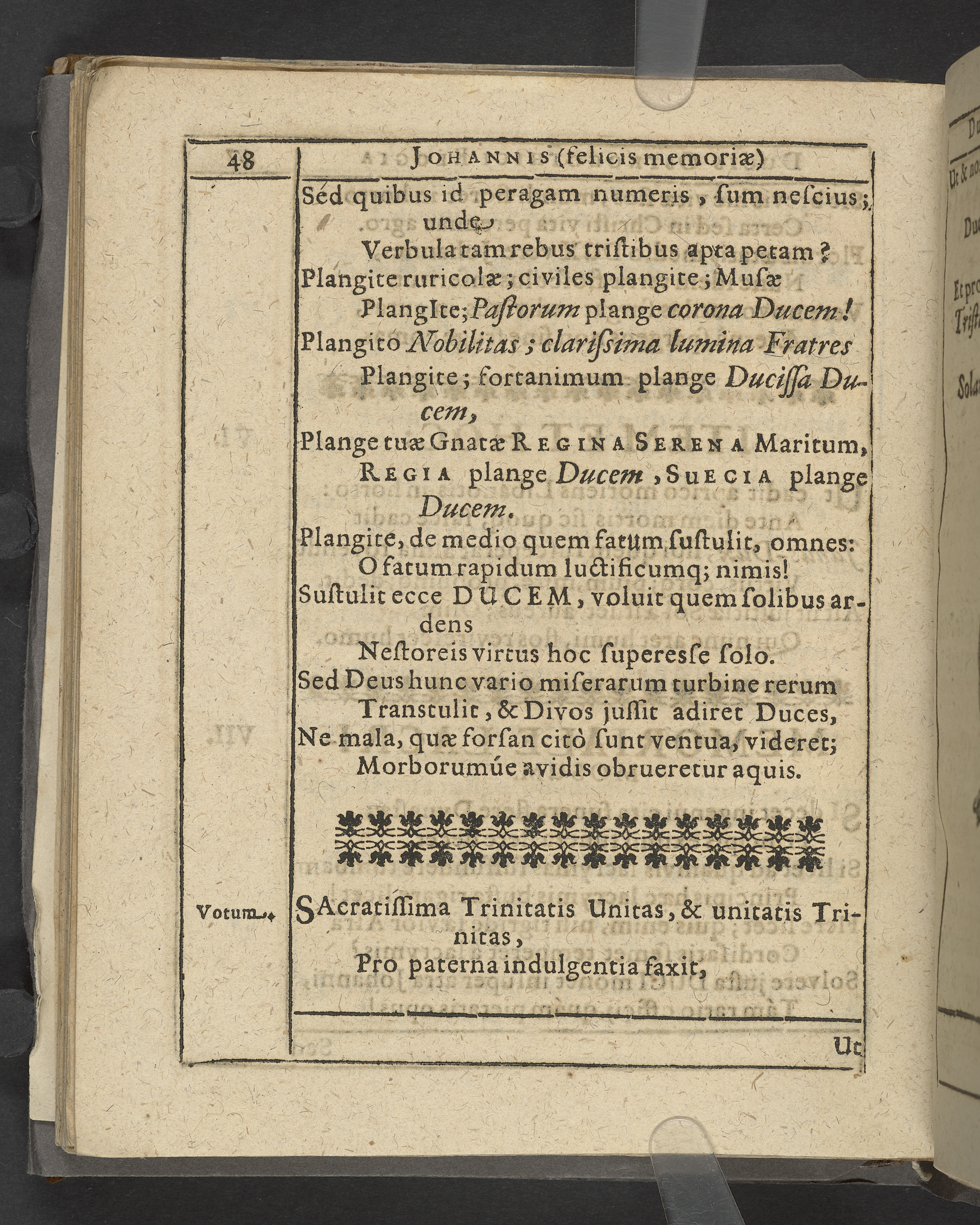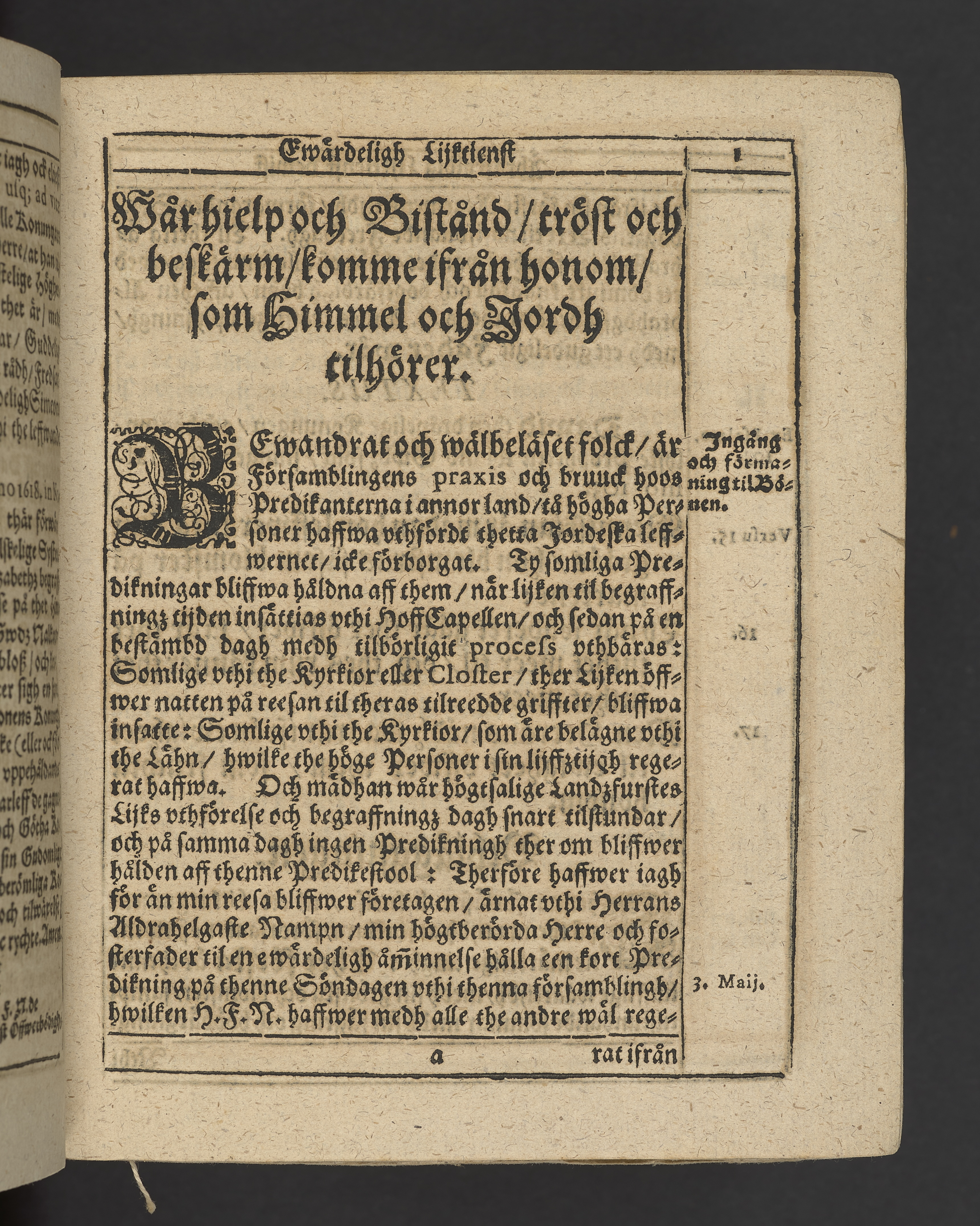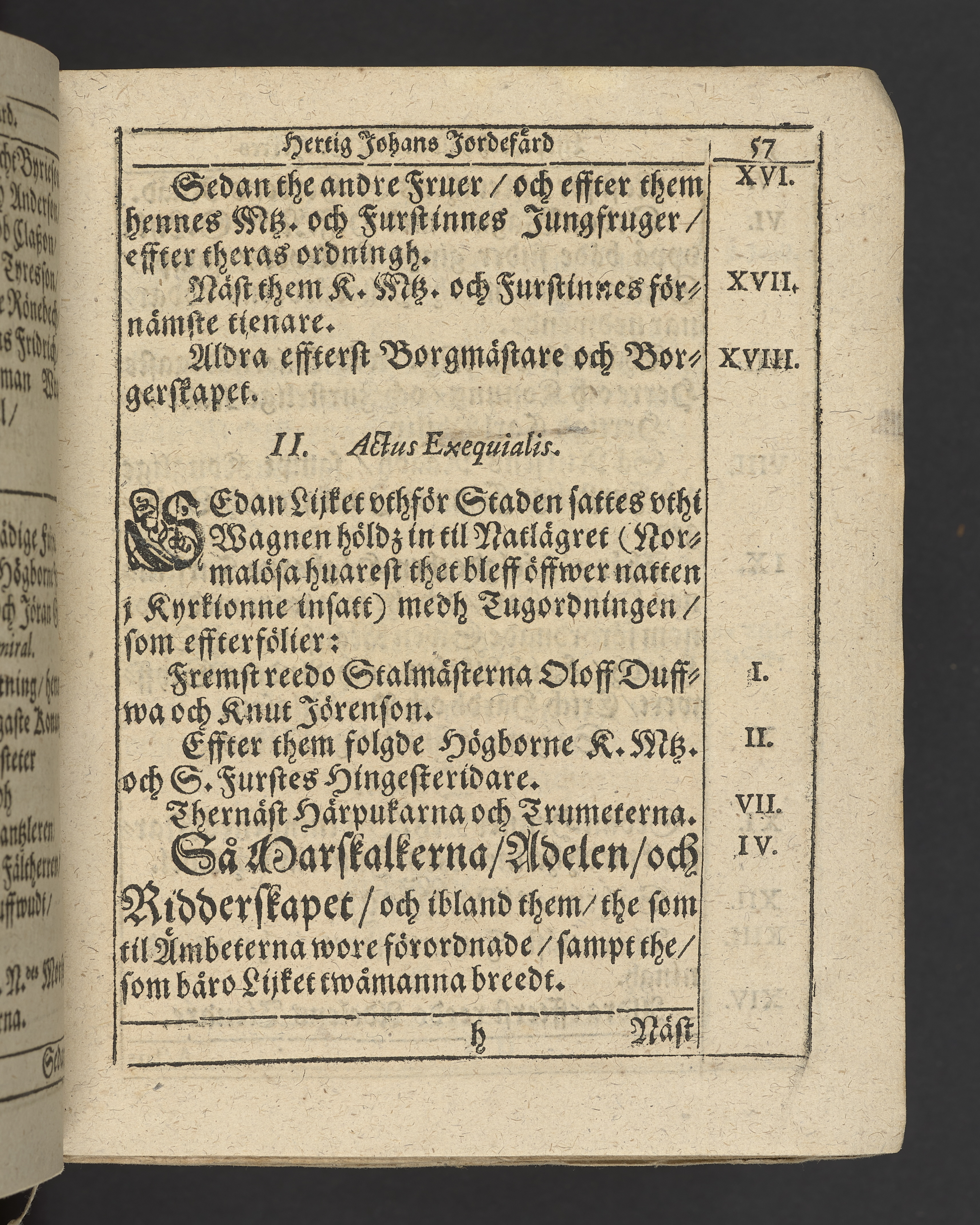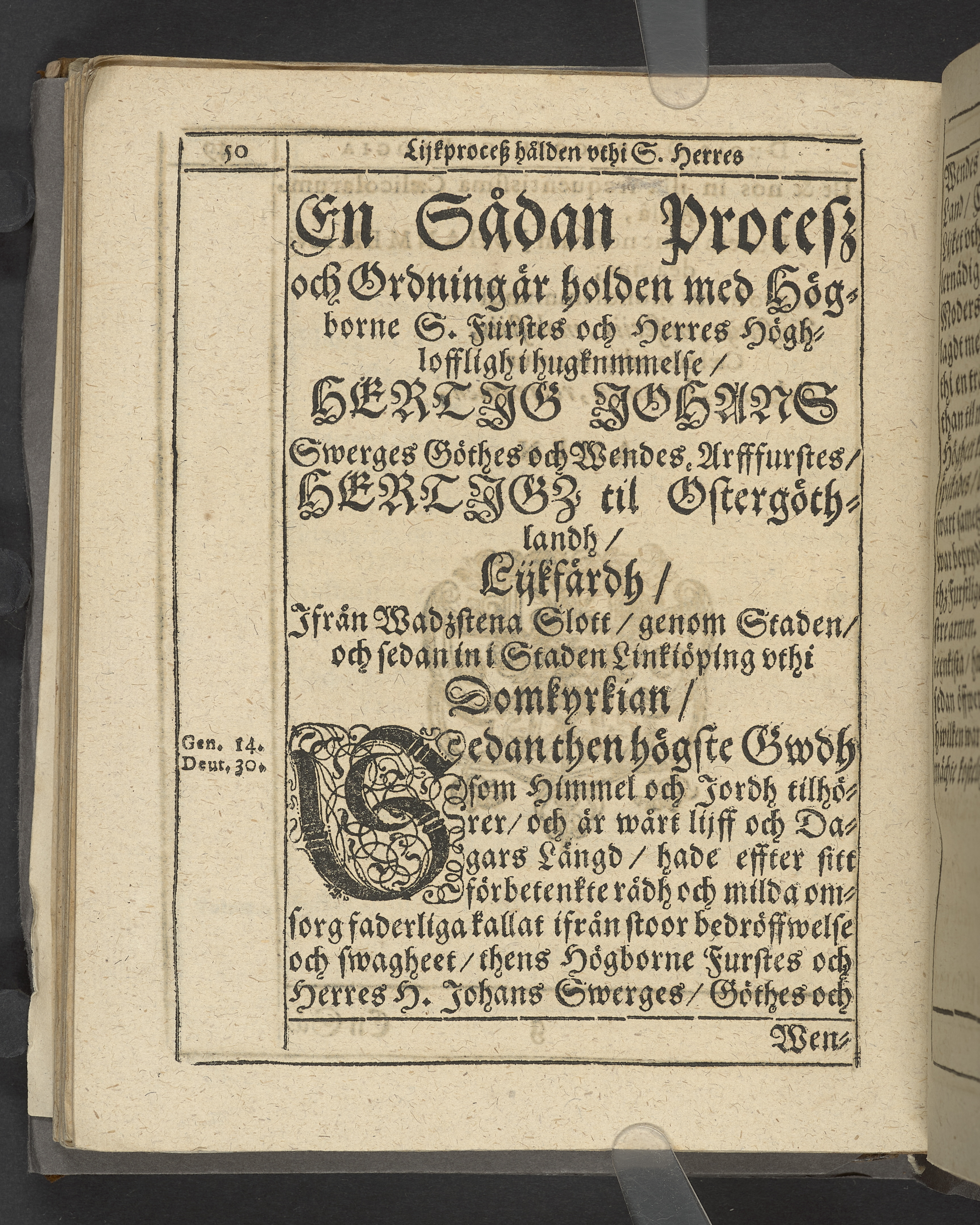 ...Ähraskyldige lijktienst, bewijst... Herr Johan, Sweriges... arfffurste... i hugkommelse... MDCXIIX... uthi thet wäsgöthiske S. Helenae tempel. Widh ändan är... furstens epicedia medh lijkprocessen; såsom och thens salige furstinnes, F. Mariæ-Elisabethz Næniæ infogade, eodem authore... Stockholmiae ex typographeo Olai Olai.