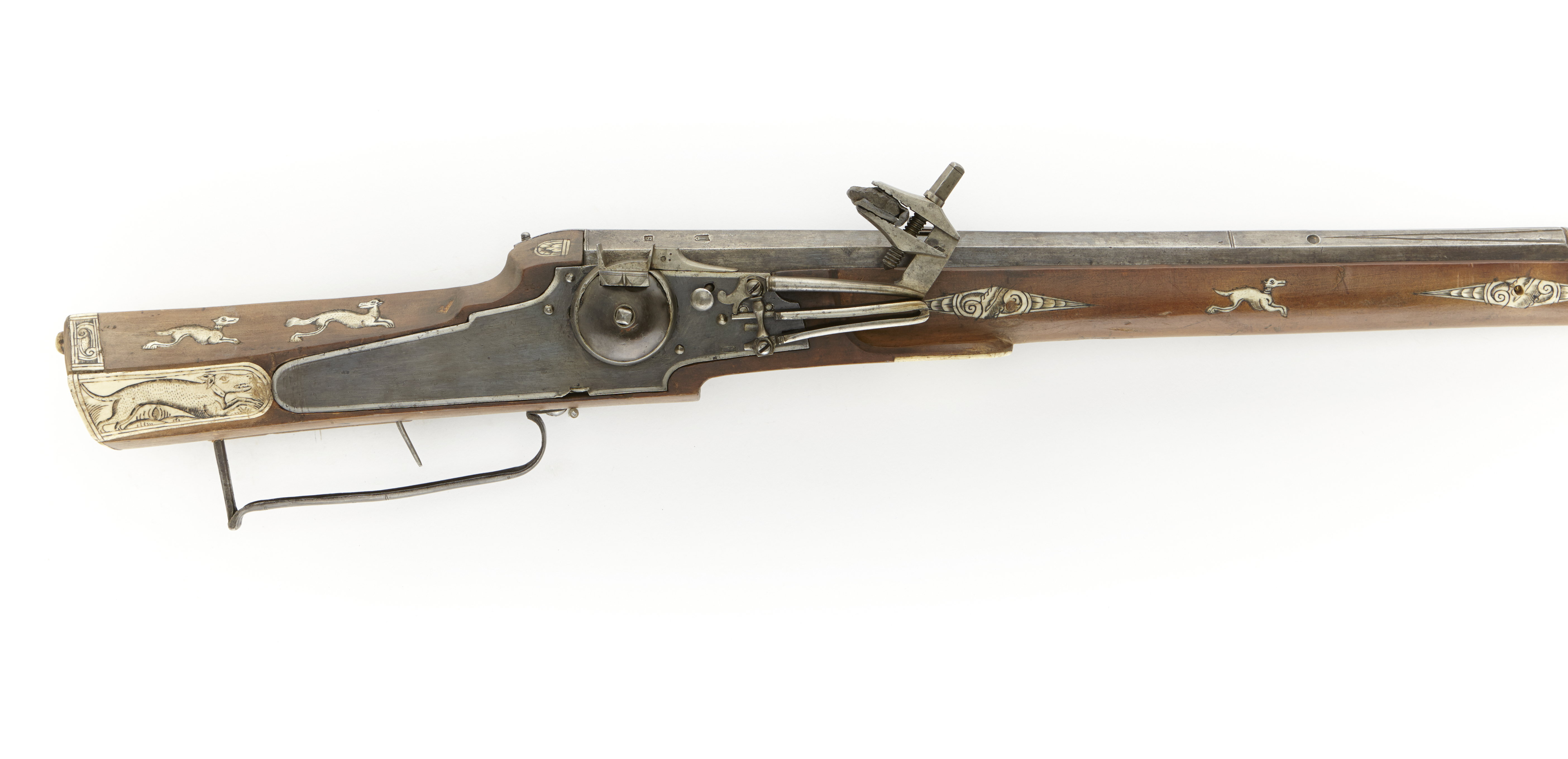 Rund, över kammaren åttkantig, slätborrad tornpipa av blånerat stål. På kammaren stämplat "M-S" (Stöckel nr 4044, Sachsen? ca 1615-ca 1630). Två ggr. stämpel med nyckel (Stöckel nr 5625, Sachsen? cirka 1615-1645). Ståndsikte av stål, knoppkorn av mässing. Siktränna mellan kryssskruv och sikte. Pipans undersida med sköldformig stämpel, vari (?) K över hjärta. Fyra piphäften. Hujllås. Blånerat låsbleck av tysk typ - bakåt avsmalnande genom två fall, blanka kanter. Hög, kullrig hjulkapsel, fasthållen medelst ring. Låg, vertikal krutskärm. Hane med lös underkäke. Hel stock av ljust trä, tysk kolvtyp. Sluten laddstocksränna. Bakplåt och stödkula av horn. Stocken inlagd med plattot och figurer av graverat ben. Kolvlådelocket helt av ben med springande hund. På anslaget stor benplatta, framtill rundad, med springande hjort. Två låsskruvar med runda benbrickor. Pipstiften ej ursprungliga, rombiska brickor. Mellan pipstiften springande hundar. Rörka av ben. Trågformig, sk. holsteinsk varbygel. Avtryckare utan snälltryck. Tillbehör : Laddstock med doppsko av ben. Svavelkis i blymantel. 1710 års inventarium p. 12, rum II: "30-362-1 D:o (Stoor Hacke)med blåå pijpa MS. på 2ne nycklar till Stempell beensatt stock, 1 Hiort på Anslage"