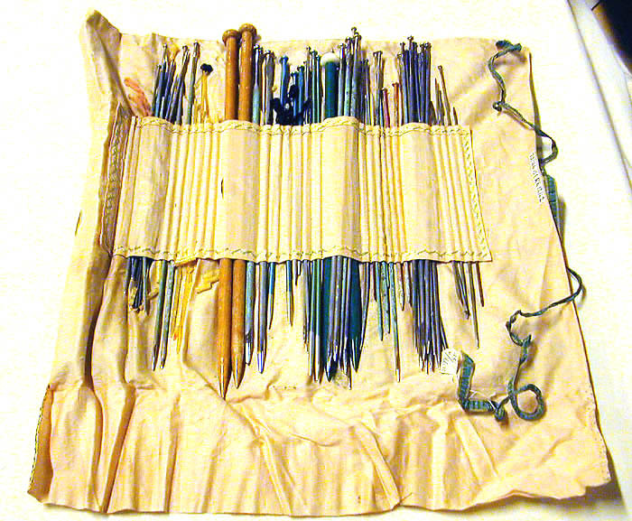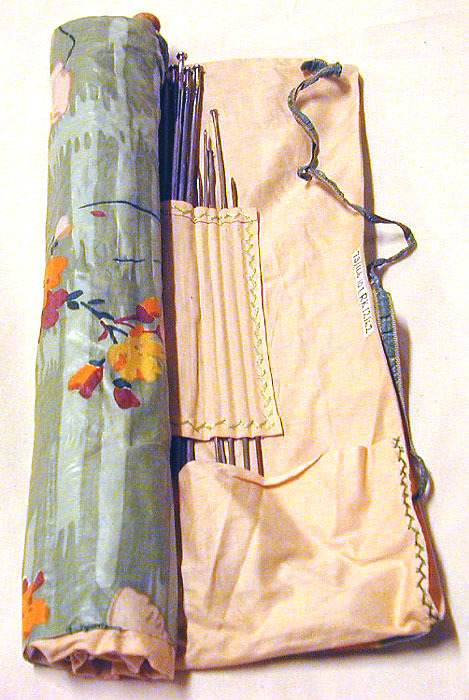 Rektangulärt fodral av blekrosa bomullstyg, på yttersidan klädd med chintz, l: 500 mm,b: 375 mm, som har tryckta blommor i grönt, orange, rött och vitt på grön och ljusgrönbotten. På innersidan är i mitten ett tygstycke sytt tvärsöver med tvärgåendesömmar indeladi 30 fack och kantad med korsad söm i ljusgrönt bomullsgarn. Tyget nedanför det yttre chintztyget går att vika upp så att nålarna säkras är på två sidorkantad med korsade sömmar. Mittför högra bredsidan ett grönt band, l: 790 mm. I fodraletfinns instoppat 57 stickor, 12 strumpstickor och en virknål, till synes hopsamlade under enlängre tid. Räknat från vänster till höger finns i de första elva facken: fyra stickor, storlek 2,5-3,5varav en knuten med rosa ylletråd. Åtta strumpstickor, l: 220-195 mm, ett knippe om femeloxiderade strumpstickor, l: 172 mm och hopknuten med ett rött band, fyra gula och tvågröna stickor, l: 185-312 mm samt en virknål, storlek 3,5. I de två följande facken: två stickor av betsat trä, l: 387 mm och två stickor, storlek 6.I de fyra följande facken: två blå stickor märkta med storlek 8 och 4 mm, hopknutna medmörkblått band. Två gröna stickor, storlek 4, l: 345 mm. Tre stickor, storlek 2,5. Tvågröna stickor, storlek 4, l: 235 mm. I det följande facket: två gröna stickor med vita huvuden, storlek 10, l: 332. Sju stickor,storlek 2,5-4,5, l: 34,2-35,1 mm, samt en strumpsticka, rostig. I de följande elva facken:20 stickor, varav två är bruna i storlek 2,5-3,5, l: 240-350 mm och tre strumpstickor,l: ca 210 mm.