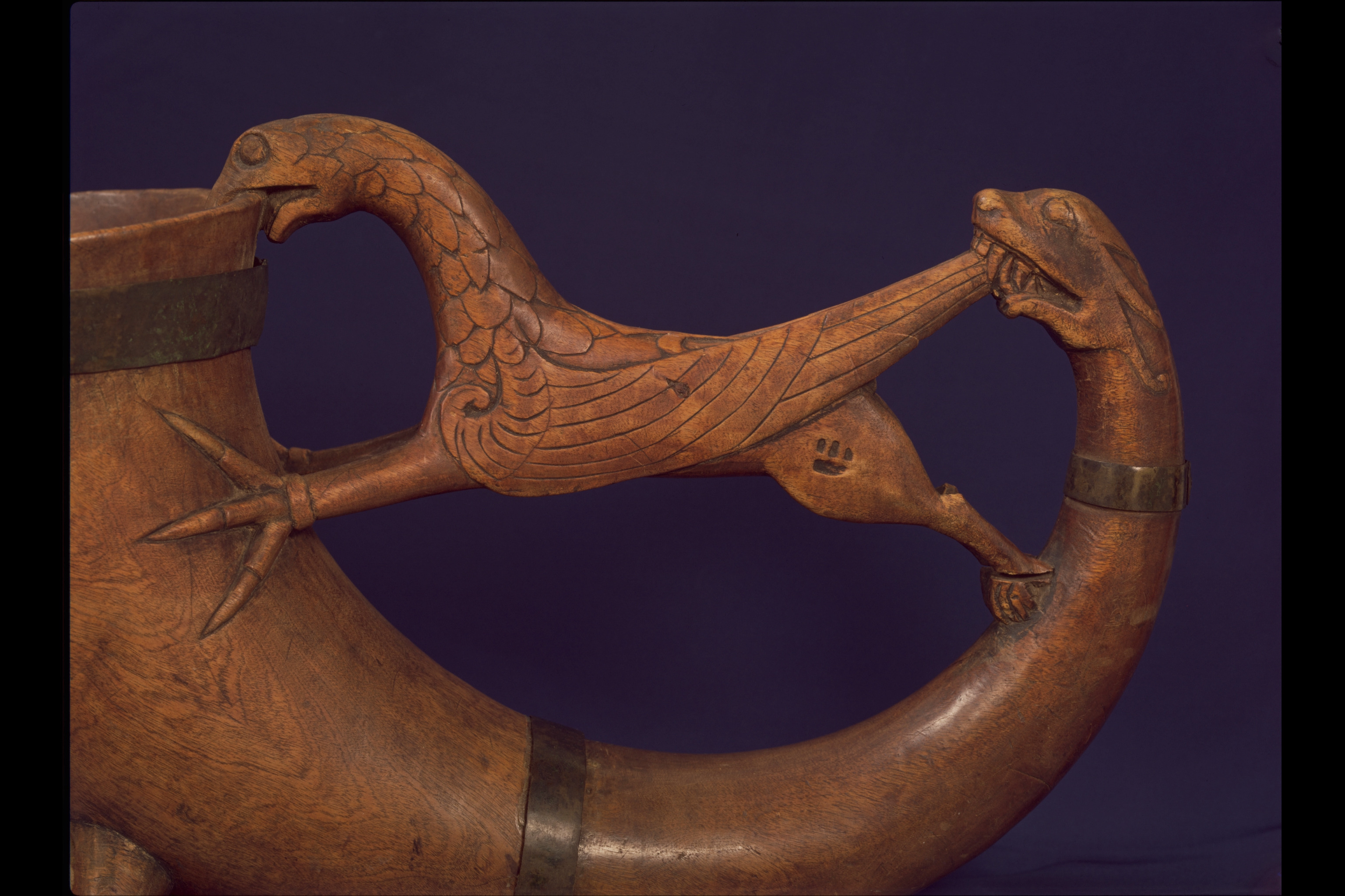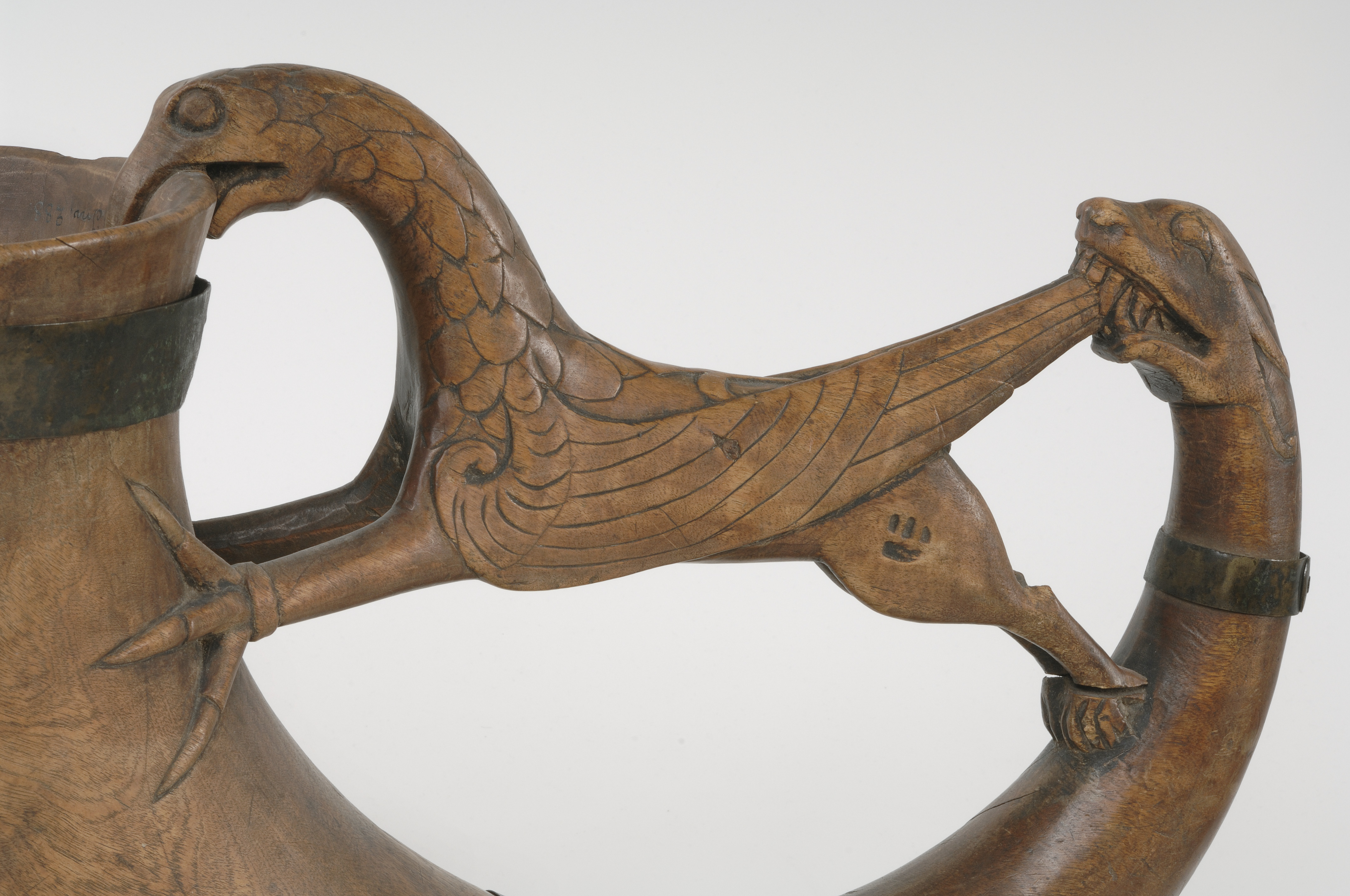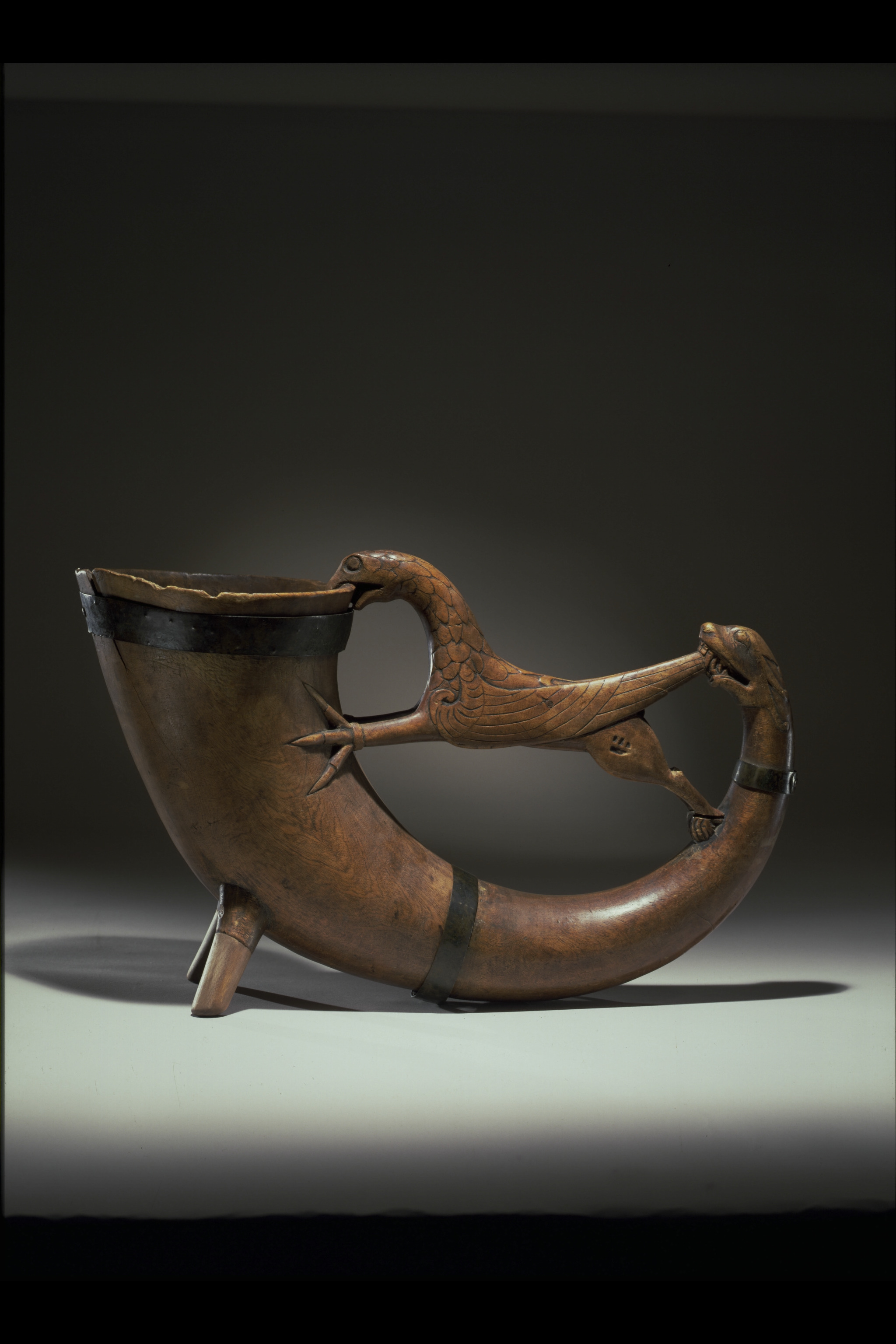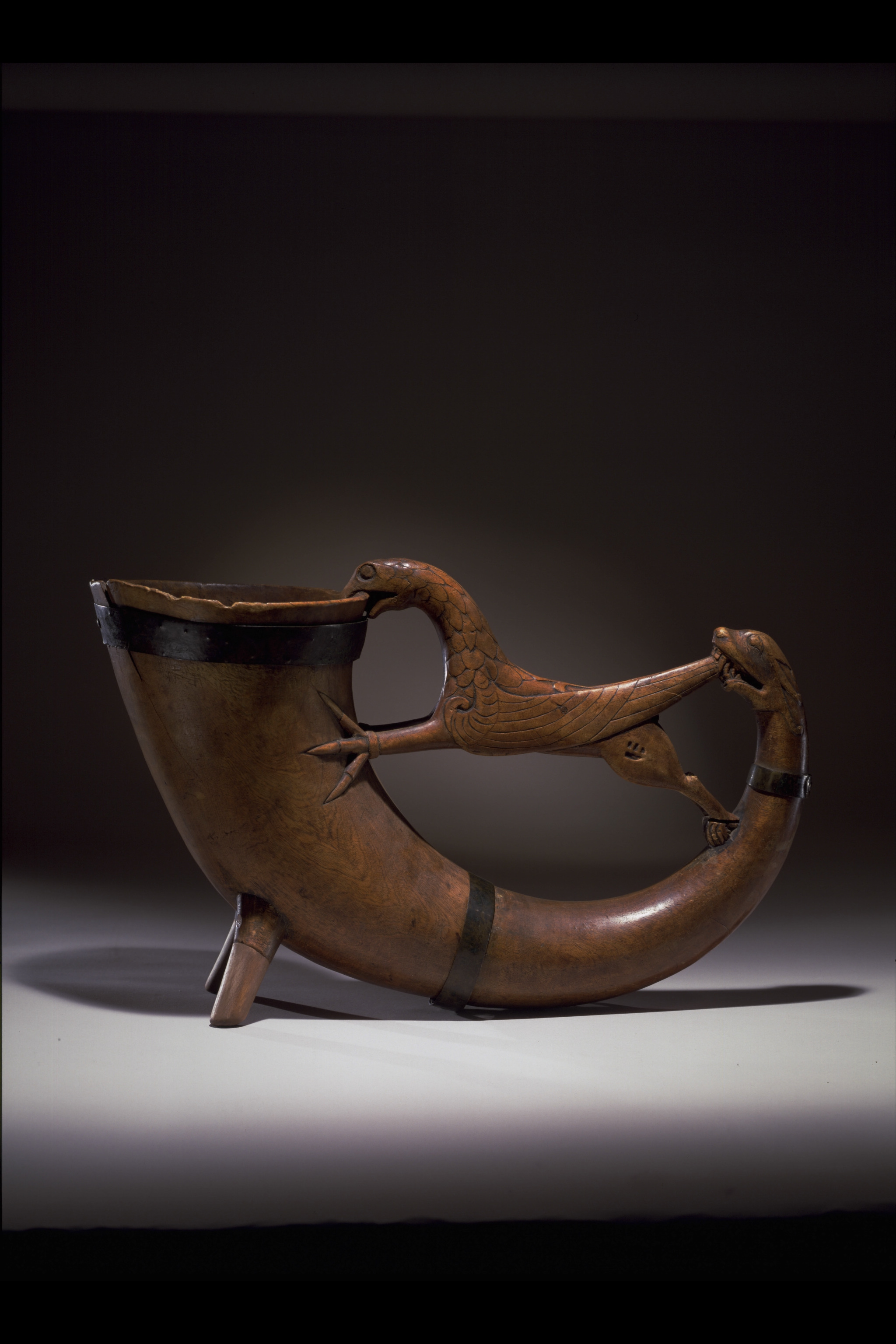 Dryckeshorn av trä med två snidade figurer i form av en drake och en grip. Änden på hornet är formad som ett drakhuvud som vänder sitt huvud bakåt mot kanten. Gripen kopplar ihop ände med kant genom att gripens näbb biter sig fast i kanten samtidigt som draken biter i gripens vingar. Runt hornet finns tre kopparband och den har även två enkla tappformade ben som stöd.