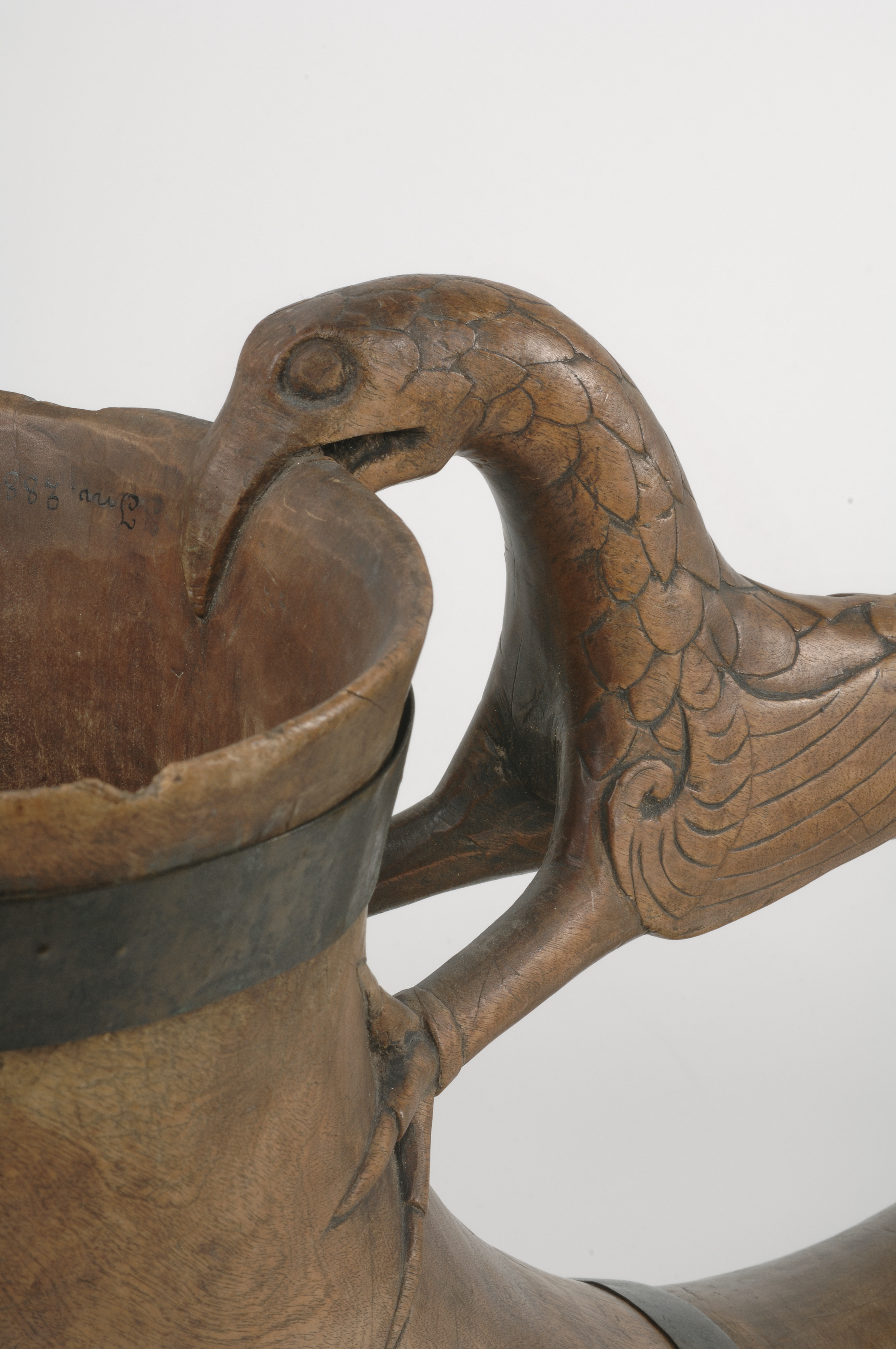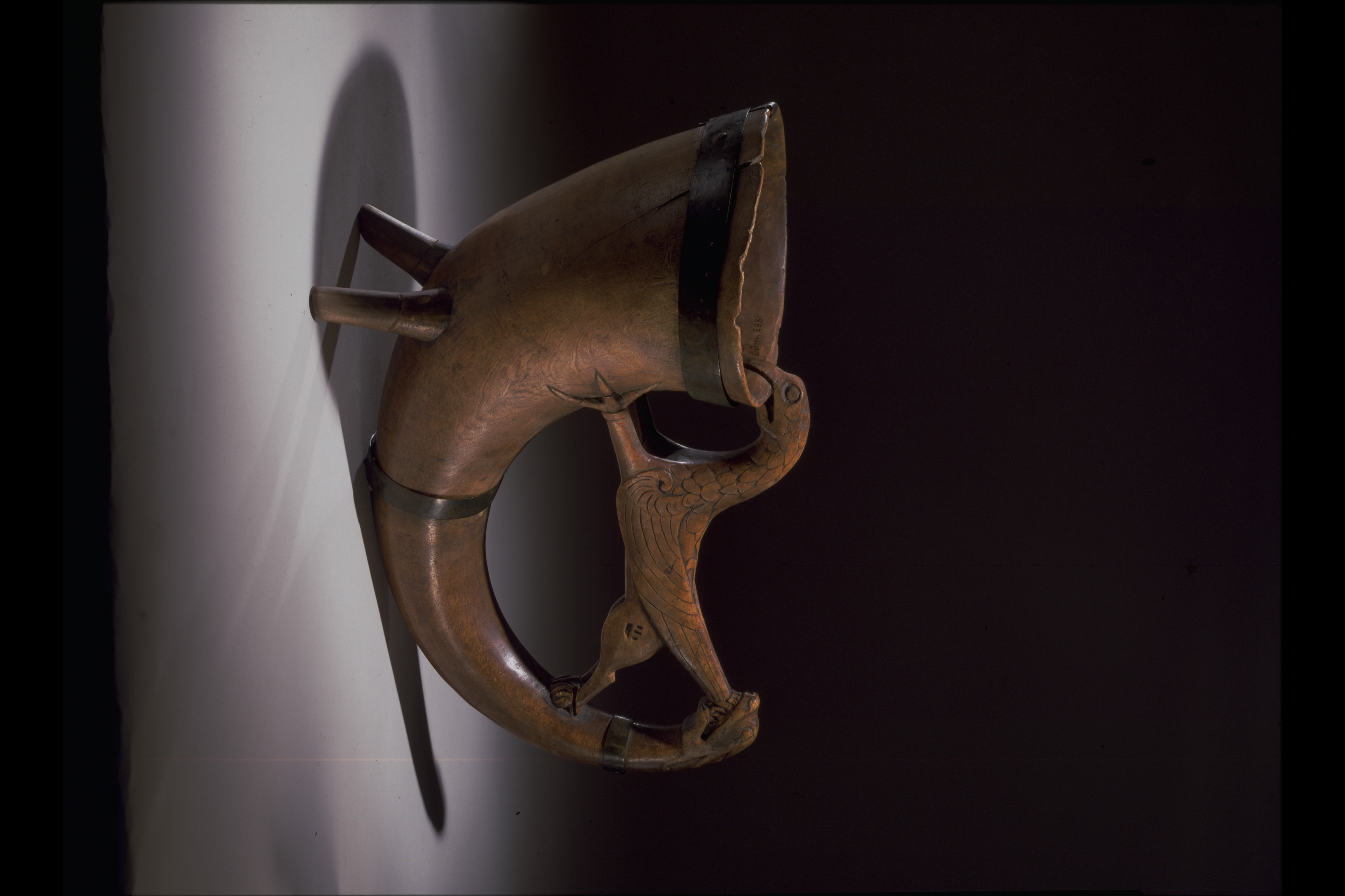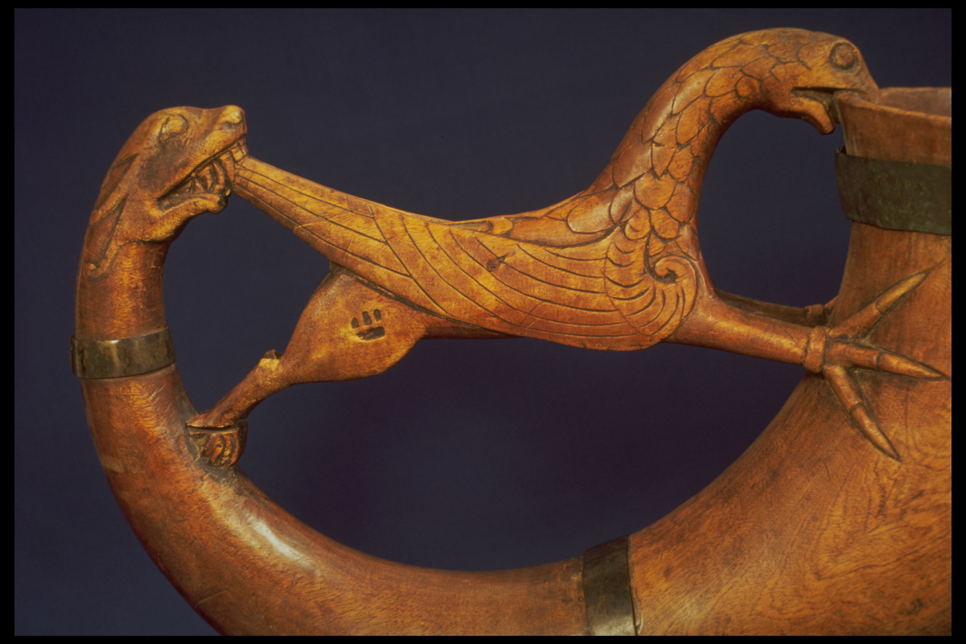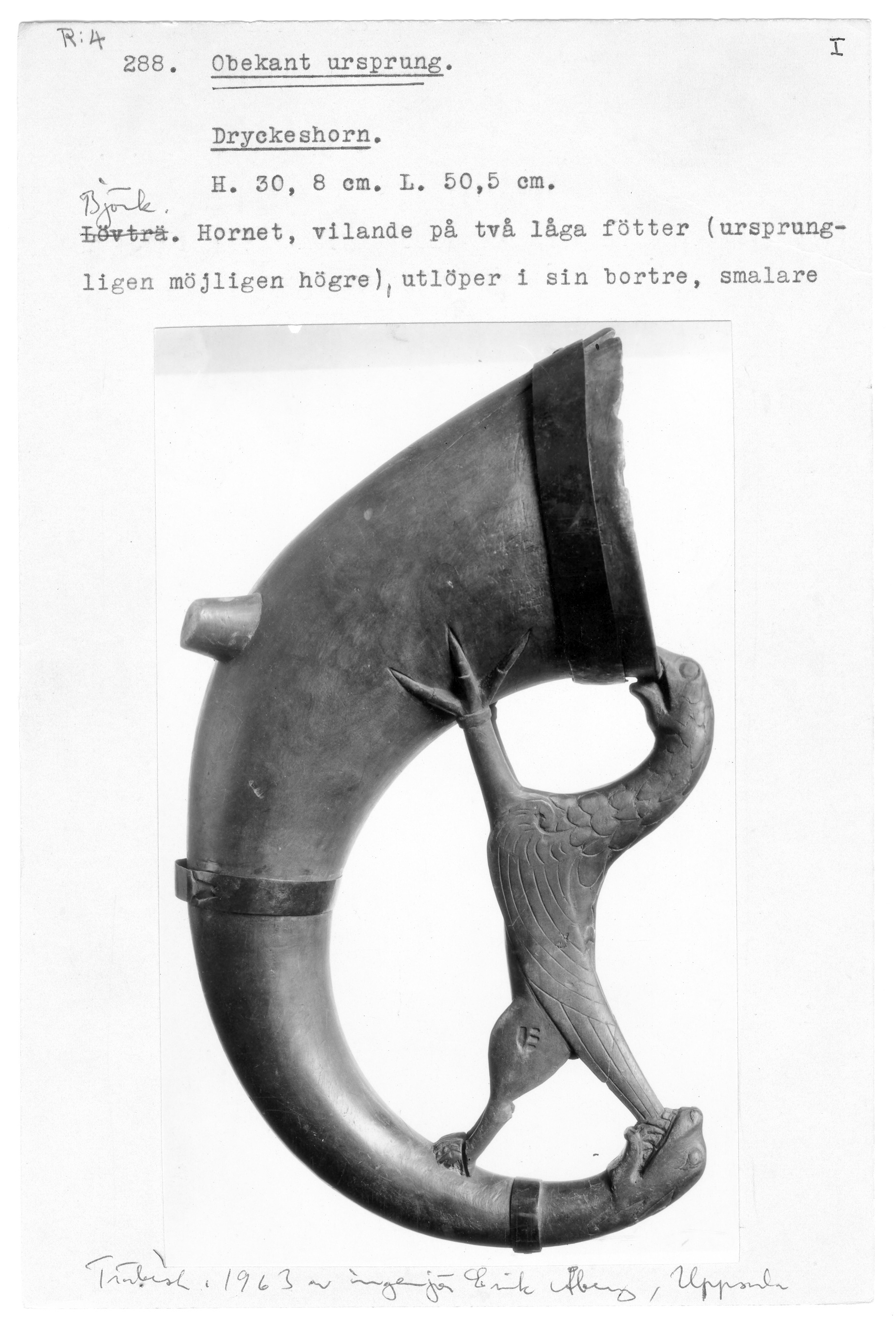 Dryckeshorn av trä med två snidade figurer i form av en drake och en grip. Änden på hornet är formad som ett drakhuvud som vänder sitt huvud bakåt mot kanten. Gripen kopplar ihop ände med kant genom att gripens näbb biter sig fast i kanten samtidigt som draken biter i gripens vingar. Runt hornet finns tre kopparband och den har även två enkla tappformade ben som stöd.