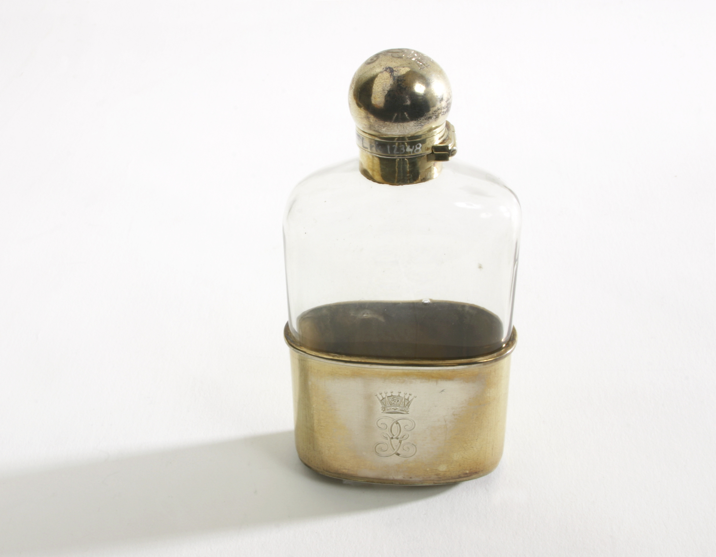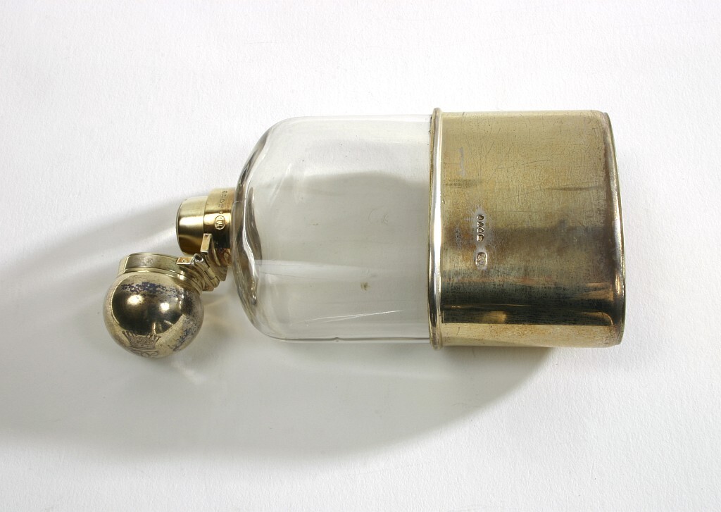 Flaska av färglöst glas, oval genomskärning, nedtill en 56 mm hög silverkant, vilken är förgylld. Locket tillslutes med bajonettfäste. Locket sitter fast i flaskan med gångjärn. Locket är klotformat, med kort, rak hals. På locket Gustav V monogram krönt med kronprinskrona, på halsen stämplar: W.L, 5, lejon, ansikte, c, (1878) samt ett kvinnohuvud i profil. På lockets gångjärn en liten otydlig stämpel, möjligen med en krabba. På flaskans nedre silverkant stämplar: W.L. , lejon, ansikte, C, (=1878), samt kvinnohuvud i profil. I botten firmamärke: LEUCHARS // PICADILLY LONDON // & // RUE DE LA PAIX PARIS, samt i kanten siffran 6 eller 9.
