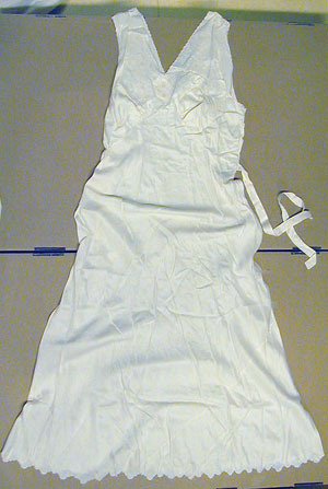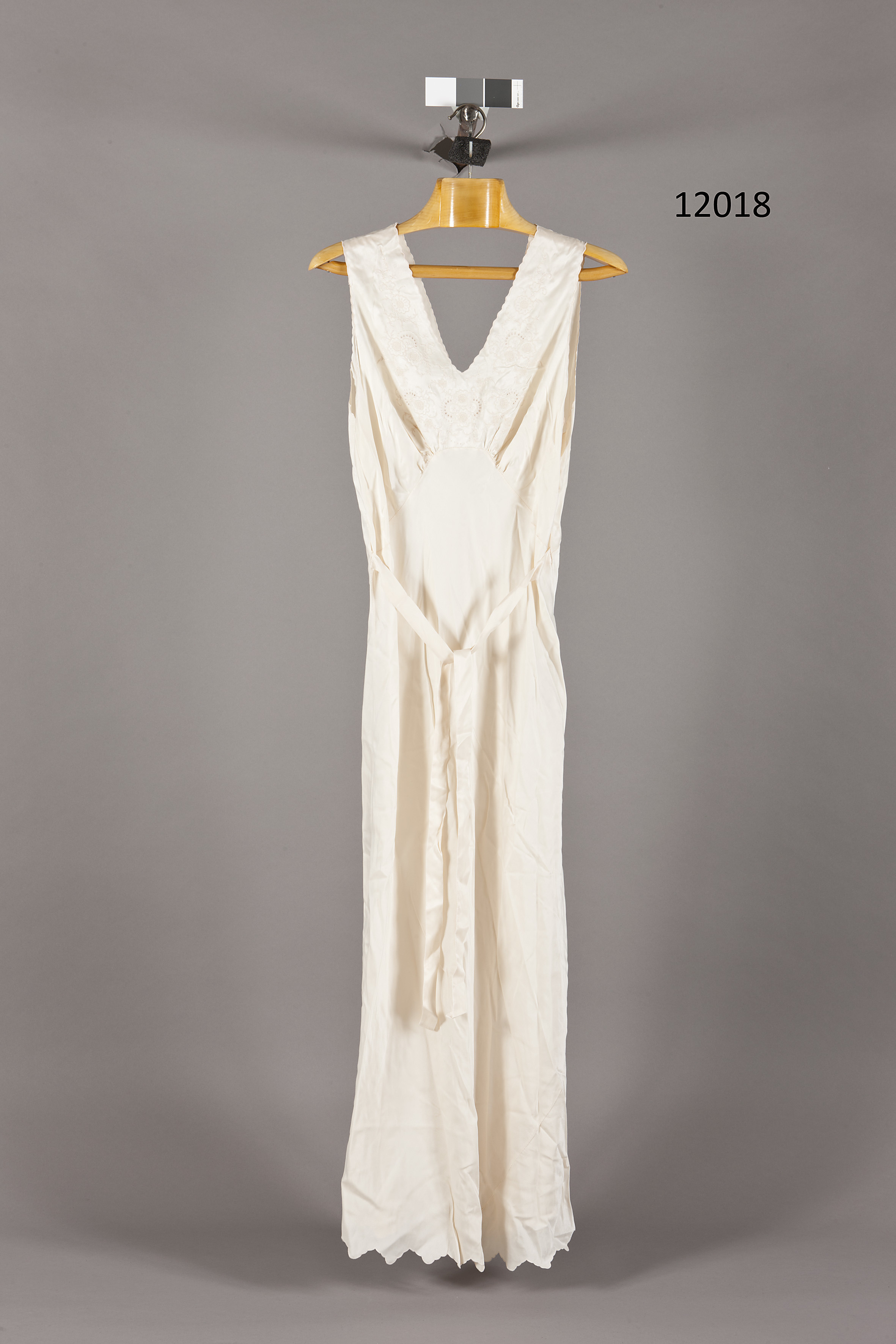 Hellångt nattlinne av champagnefärgat siden, figursytt upptill. En våd fram, b: 530 mm, tvåvåder bak, b: 250 mm. Livsömmen uppsvängd till 105 mm under urringningens spets. Underbysten är framstycket rynkat. V-formad ringning, djupare bak. Framtill broderier, delvisgenombrutna, av mindre blommor, flikiga på stjälkar med blad. Baktill är livsömmen uppdragen i en spets och möter urringningens spets. Axelpartiet b: 80mm. Hela överdelen med svagt vågformig kant broderad med langettsöm. Nattlinnets nederdel itvå våder, b fram: 104 mm, b bak: 99 mm. På framstyckets vänstra nedredel en kil, h: 420mm. På bakstyckets högra nedre del en kil, h: 410 mm. Tyget under livsömmen taget påsnedden. Nattlinnets nederkant tungformig med vågformig kant broderad med langettsöm. Bak iV-ringningen liten lapp med broderat "S" samt hertigkrona. Nedtill i höger sidsömsköldformad lapp med genombrutna kanter med ett broderat "S".
