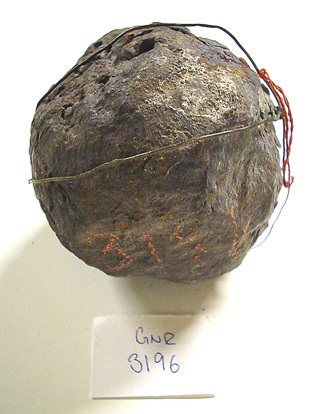 Kanonkula av järn. Mycket angripen av rost, större flisor har försvunnit. Omlindad med ståltråd.