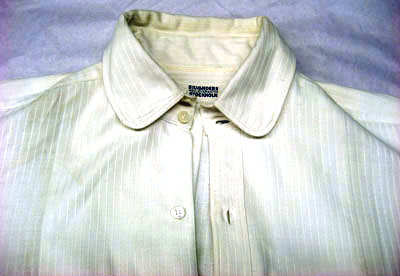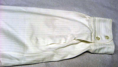 Skjortan är lång och av en vid modell med långa ärmar, sydd av ett fram och ett bakstycke med sidsömmar med sprund i nederkanten, 240 mm höga. Både fram- och bakstycket är rundade nedtill. Framstycket är kortare än backstycket. Skjortan är av vit bomull vävd med ett strukturmönster av vertikala ränder i relief. Mitt fram en halv knäppning som utgår från kragkanten. Fem små runda knappar av pärlemor på höger framstycke och motsvarande fem knapphål på vänster framstycke. De två översta knapparna sitter på själva kragkanten. På vänster framstyckes kant vid knäppningen en markerad bård, 28 mm bred. Stärkt skjortbröst, av ett rektangulärt stycke av ett extra foder av vitt bomullstyg, 375 x 626 mm. På vänster bröst en horisontell, påsydd rektangulär ficka, 100 x 90 mm, med ett 30 mm brett ficklock som knäpps med en liten vit pärlemorknapp. Skjortkragen med rundade snibbar kantade av en dubbel söm. Kragen är smalare bak, 30 mm och bredare framtill, 60 mm. Ärmarna är långa och avsmalnande nedtill. De har 60 mm breda ärmslut med ett 80 mm högt sprund kantat på vardera sida av en 25 mm bred fåll. På ärmslutet sitter två vita pärlemorknappar med motsvarande två knapphål. Bak på kragkantens insida en påsydd vit etikett av bomullstyg, med firmamärket maskinsytt påskrift med svarta bokstäver: "SILVANDERS// HOVLEVERANTÖR// STOKHOLM".