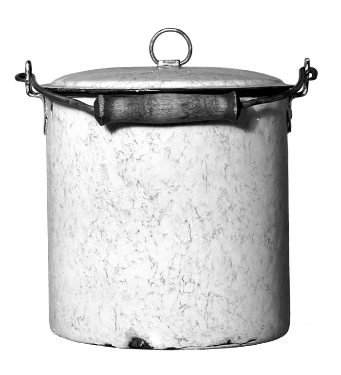 MJÖLKFLASKA (hink) Av emaljerad stålplåt, emaljen utvändigt gråspräcklig, invändigt vit. Cylindrisk, med handtag (grepe) och trycklock. Kring brädden en utstående stav i blått, nedre kanten något avrundad mot botten, denna svagt skålig. Handtag av rundstavig järntråd, bågböjt, i mitten en spolformig gripkavel av björk; handtaget rörligt i två vinkelböjda flikar (öron), utgående vardera från en på flaskan liggande oval platta, fäst med två nitar. Lock lågt, svagt kupigt, med utstående kantfläns; ovanpå i mitten en rundstavig järnring som handtag, rörlig under en övervikt plåtflik, fäst med två nitar; på undersidan en hög sarg. Höjd med lock: 20,4 cm.; utan lock: 18 cm.; diameter: 19 cm. Lock, höjd: 4,2 cm.; diameter: 19,5 cm.