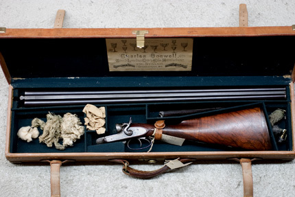 Rektangulär låda av trä, utvändigt klädd med läder, kantsömmar med vitt garn, mässingsskodda hörn. Mässingsslås på främre smalsidan, stämplat: "HANDMADE // SECURE LEVER". Två läderremmar med mässingssöljor. Handtag av läder. Invändigt klädd med grönt kläde, inredd med fack för dubbelpipig bössa med tillbehör. På lockets insida fastklistrat firmaetikett från Charles Boswell, Breech Loading Gun and Rifle Manufacturer, 126 Strand, London.