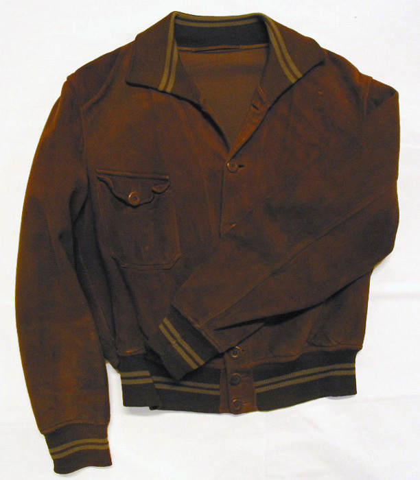 Lumberjacka av brun mocka. Krage, midja samt ärmändar resår stickade i brun ylle med två grå ränder. Hel rygg. Knäppes med sju knappar av brungrå horn. Krage av resårstickade ylle. Raka axlar och isydda armar vilka avslutas med resårstickning. I midjan en tätslutande resårstickning av ylle. Vid resårstickningar, som just vid i knappar och knapphål övergår i mocka sitter två knappar, tätare än i övriga knäppningar. En bröstficka med lock på vadera sidan, vilka förslutes med en knapp var, av samma typ som övriga. Foder av brun diagonal, vilket på höger sida vid midjan samt ovanför höger ärmhåla lappats eller förstärkts med rödbrunt ylletyg.