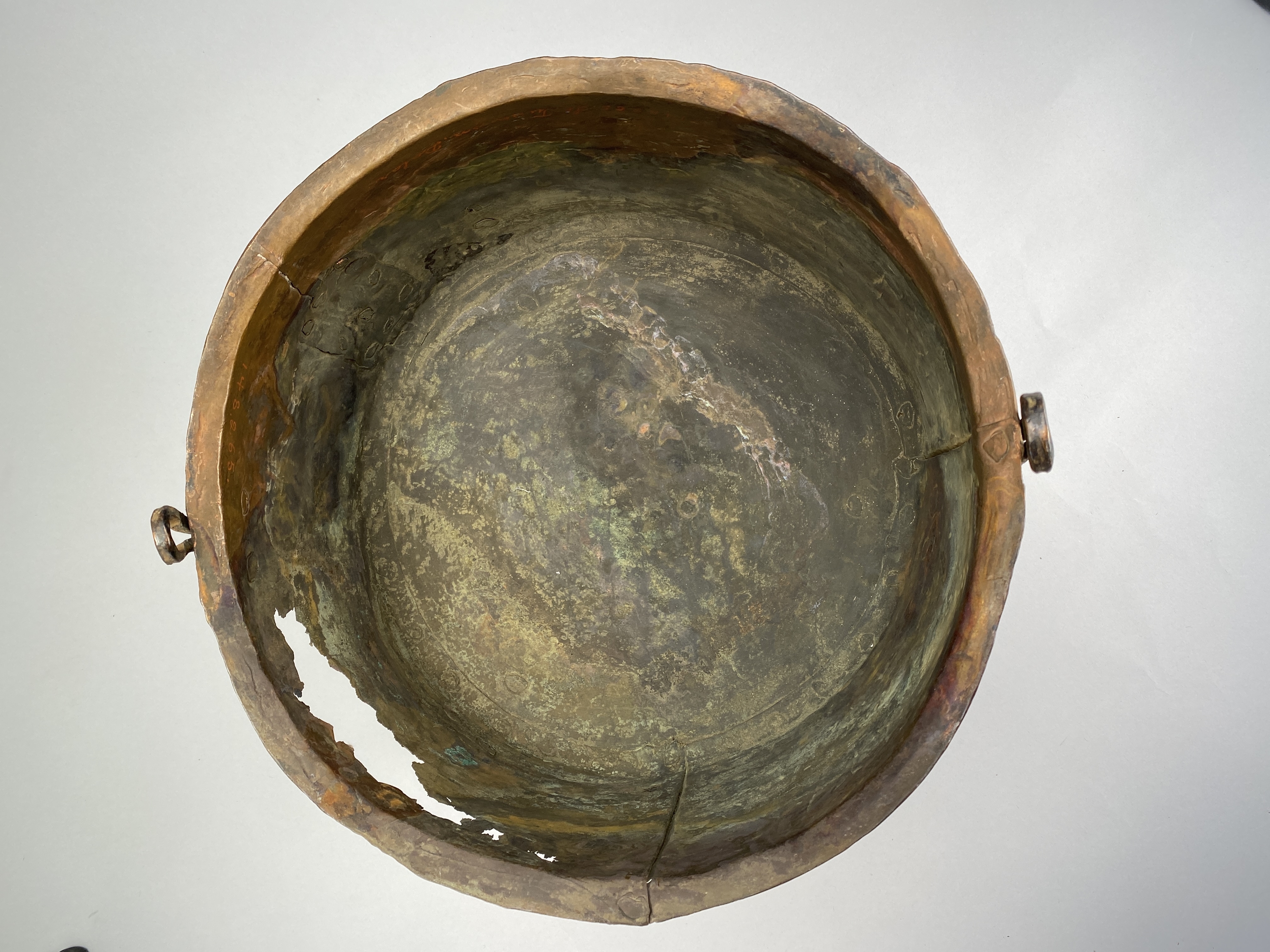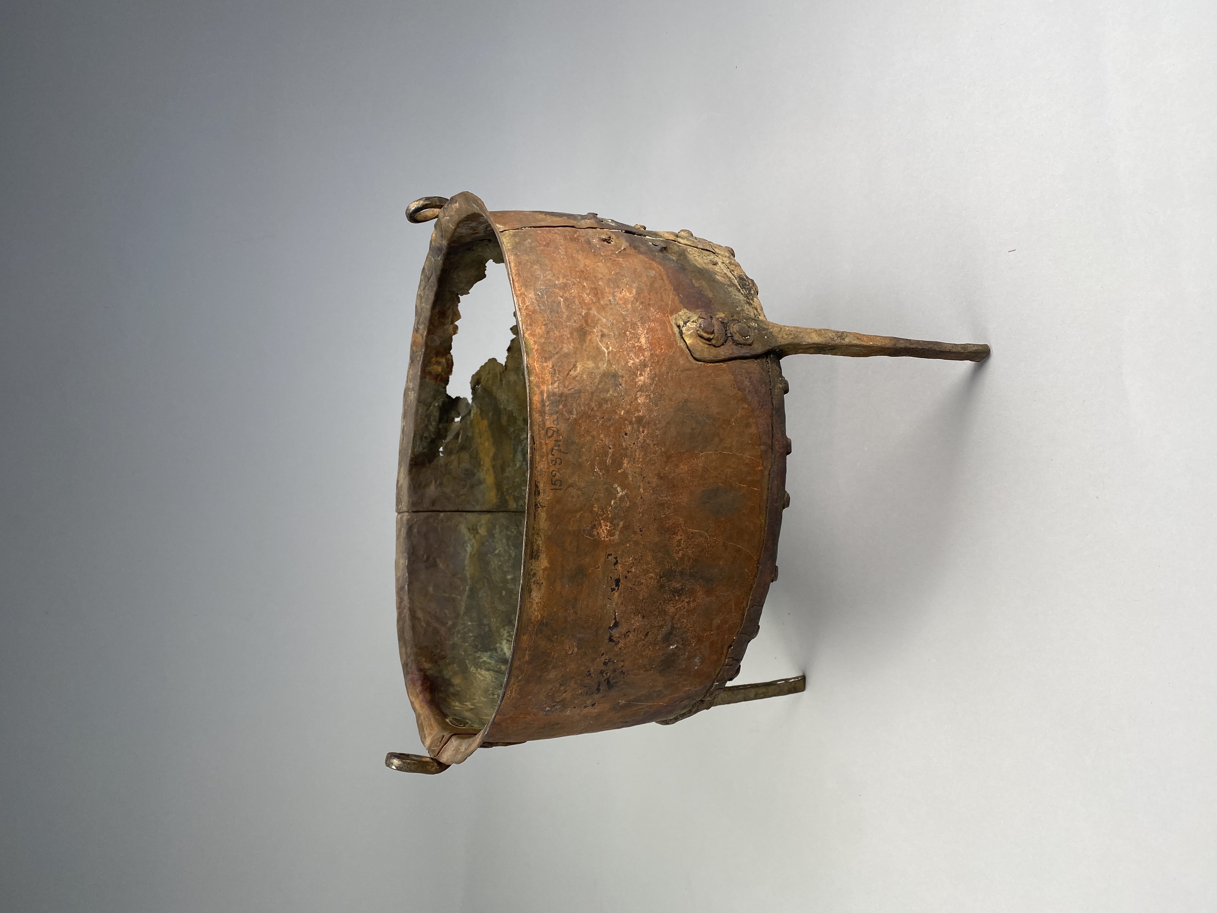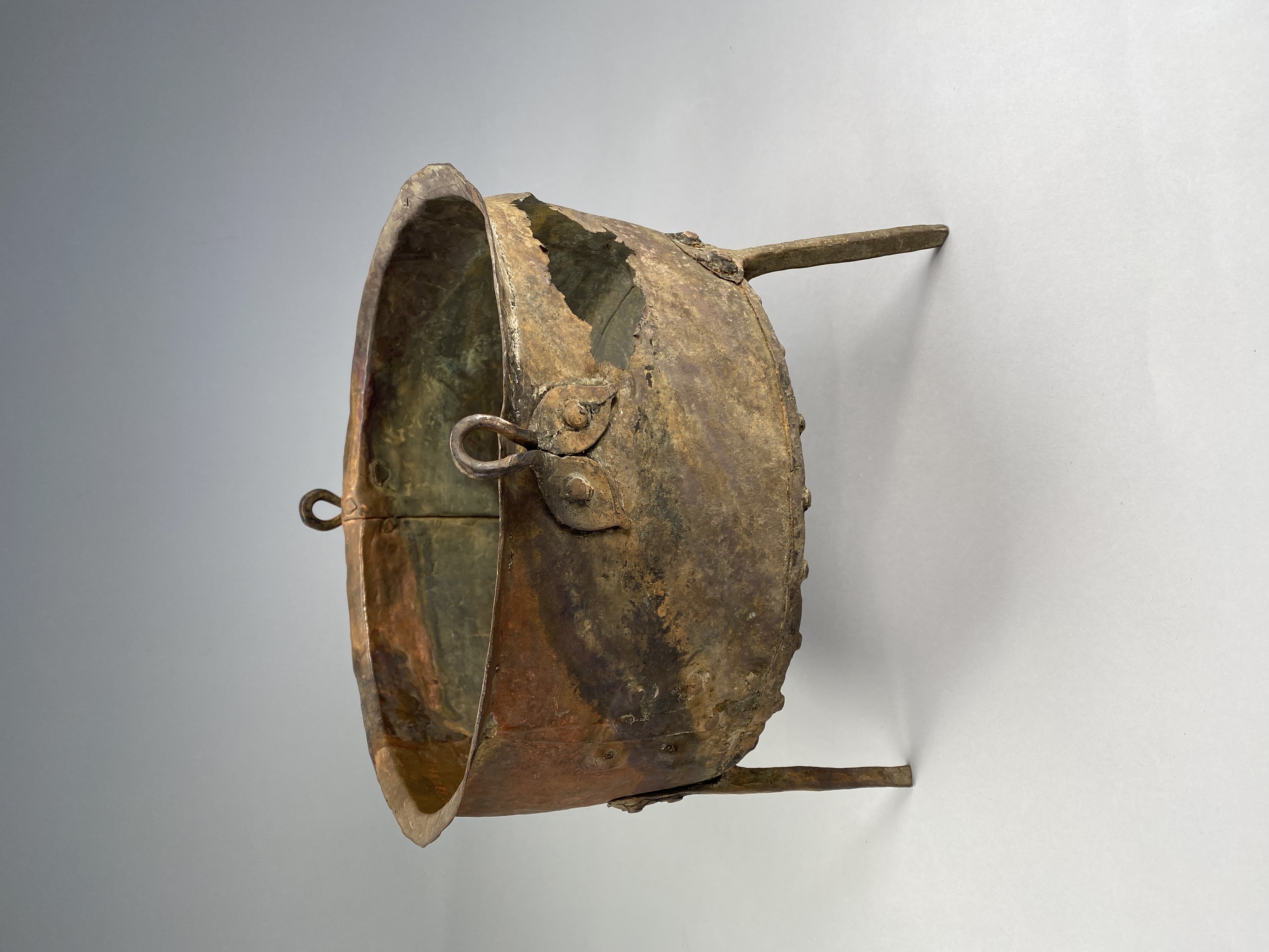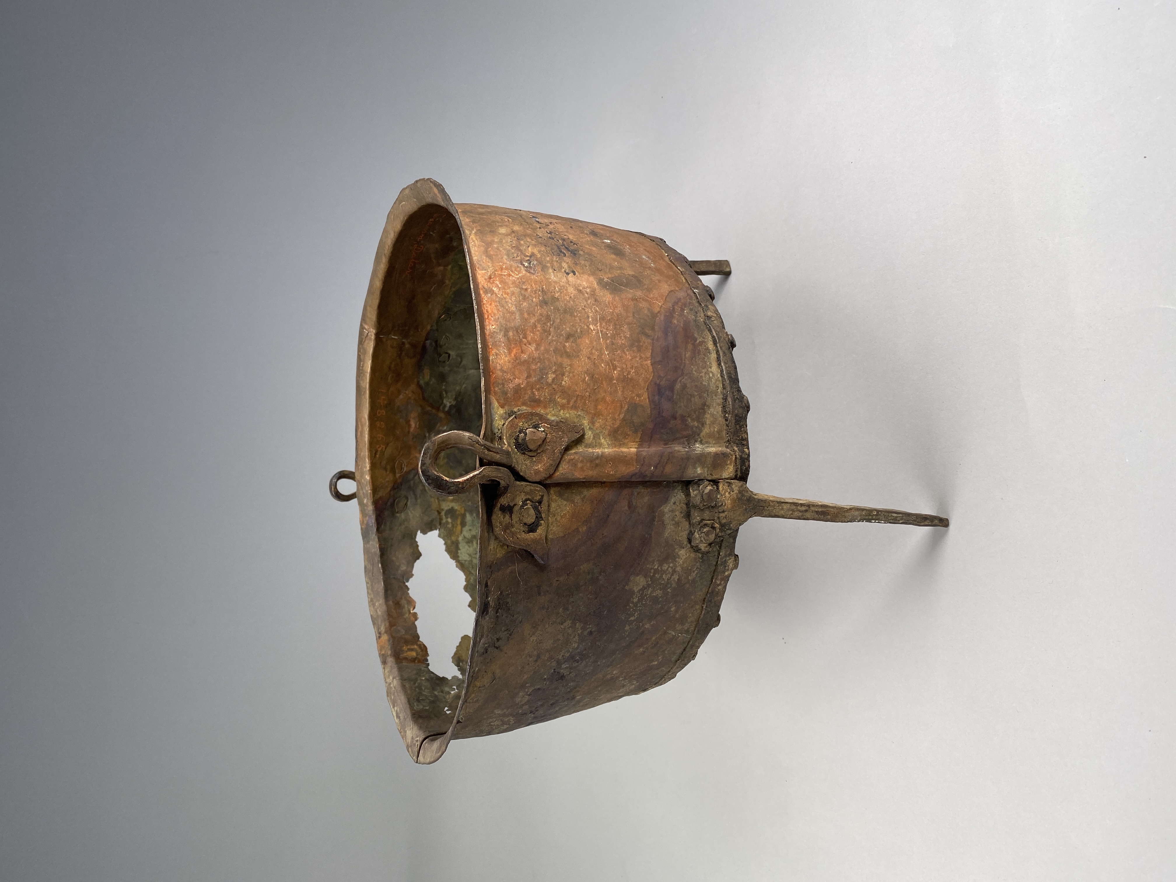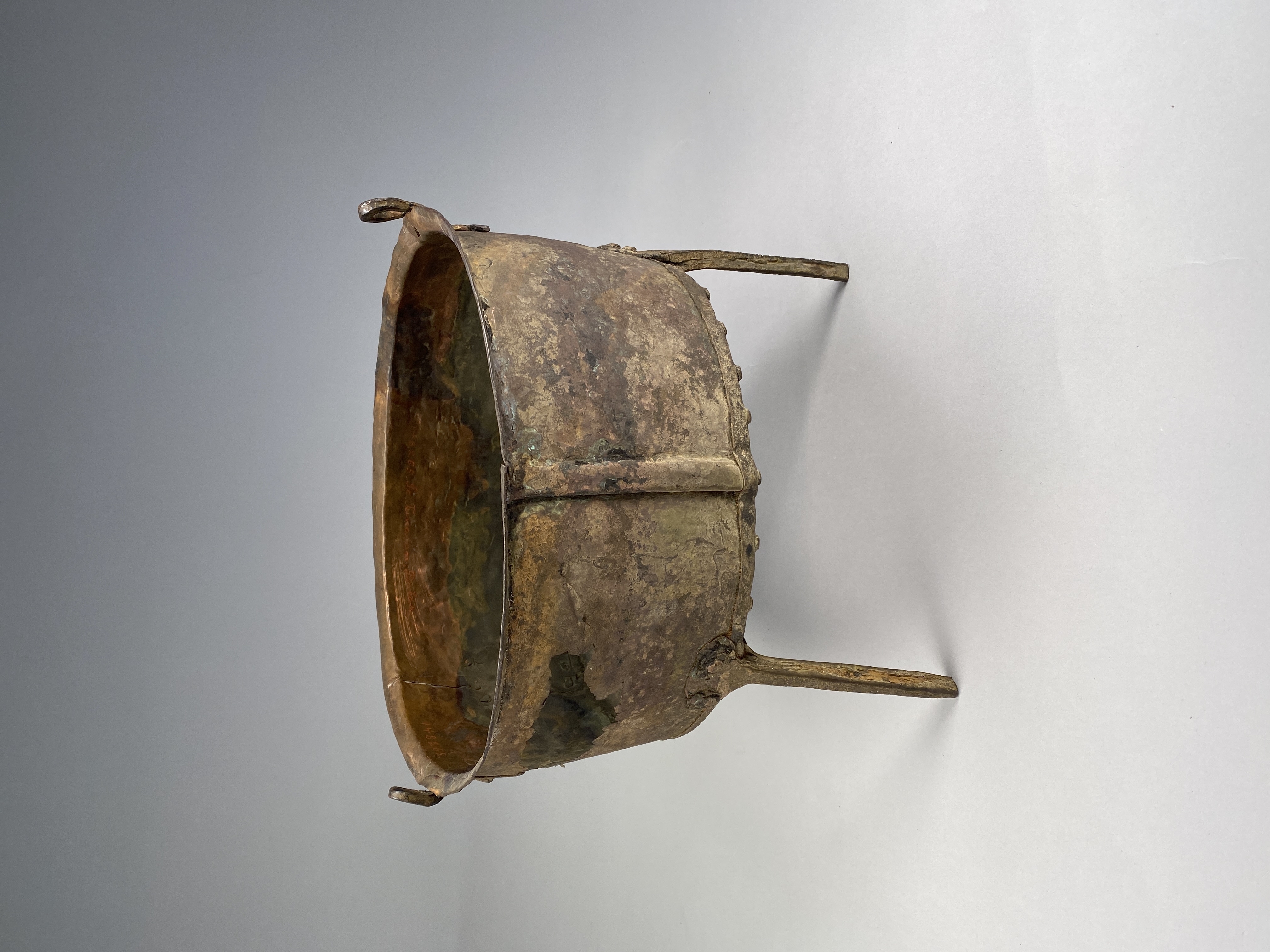 Kittel av koppar med tre ben och två hankfästen. Nitad av fyra plåtar.